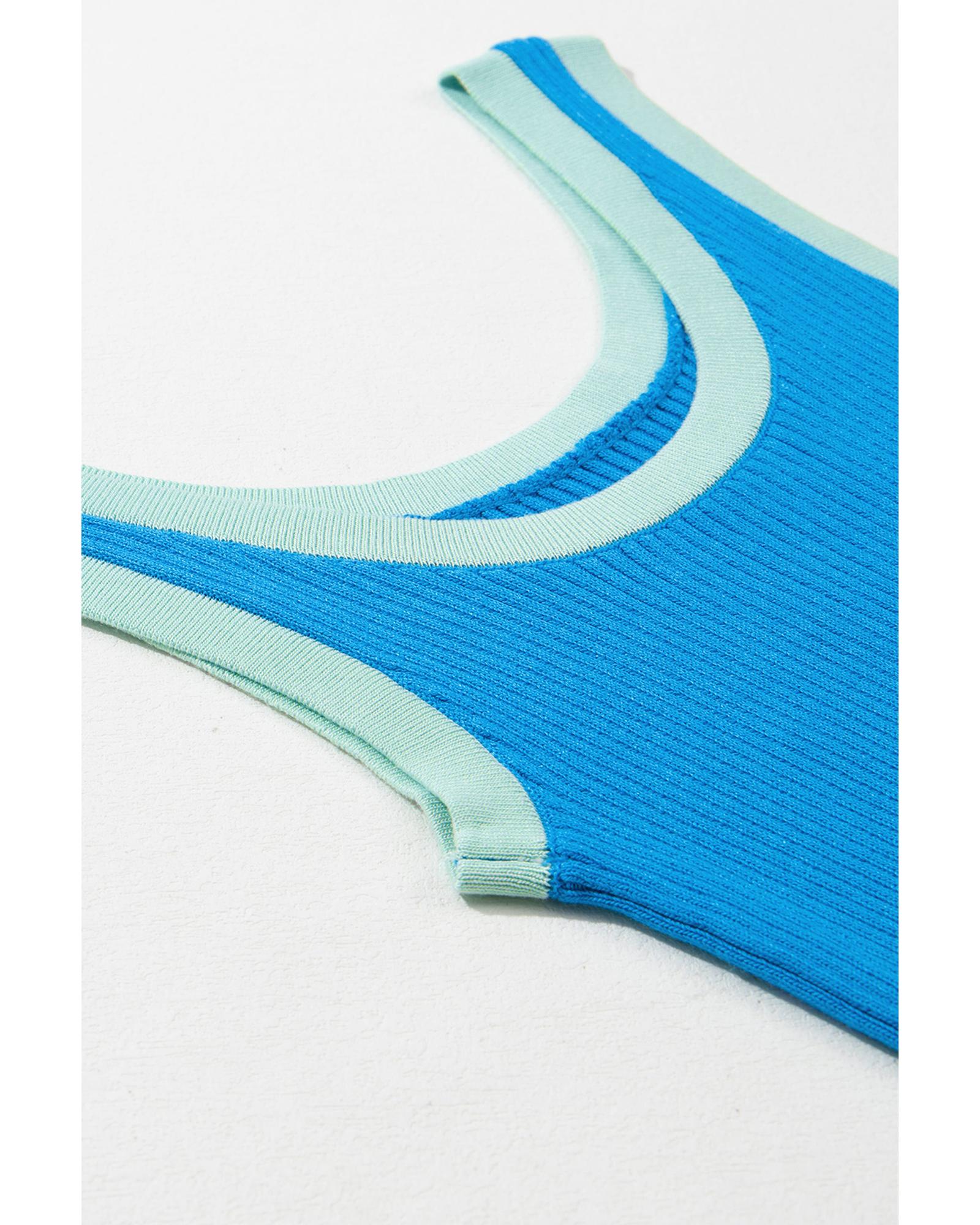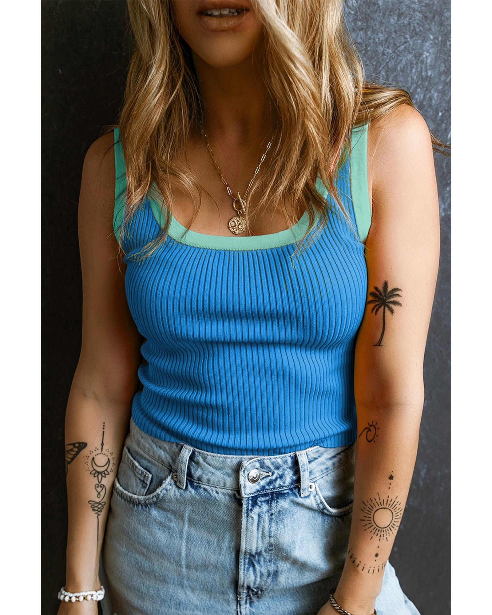 Blue Colorblock Edge Ribbed Knit U Neck Tank Top – XL