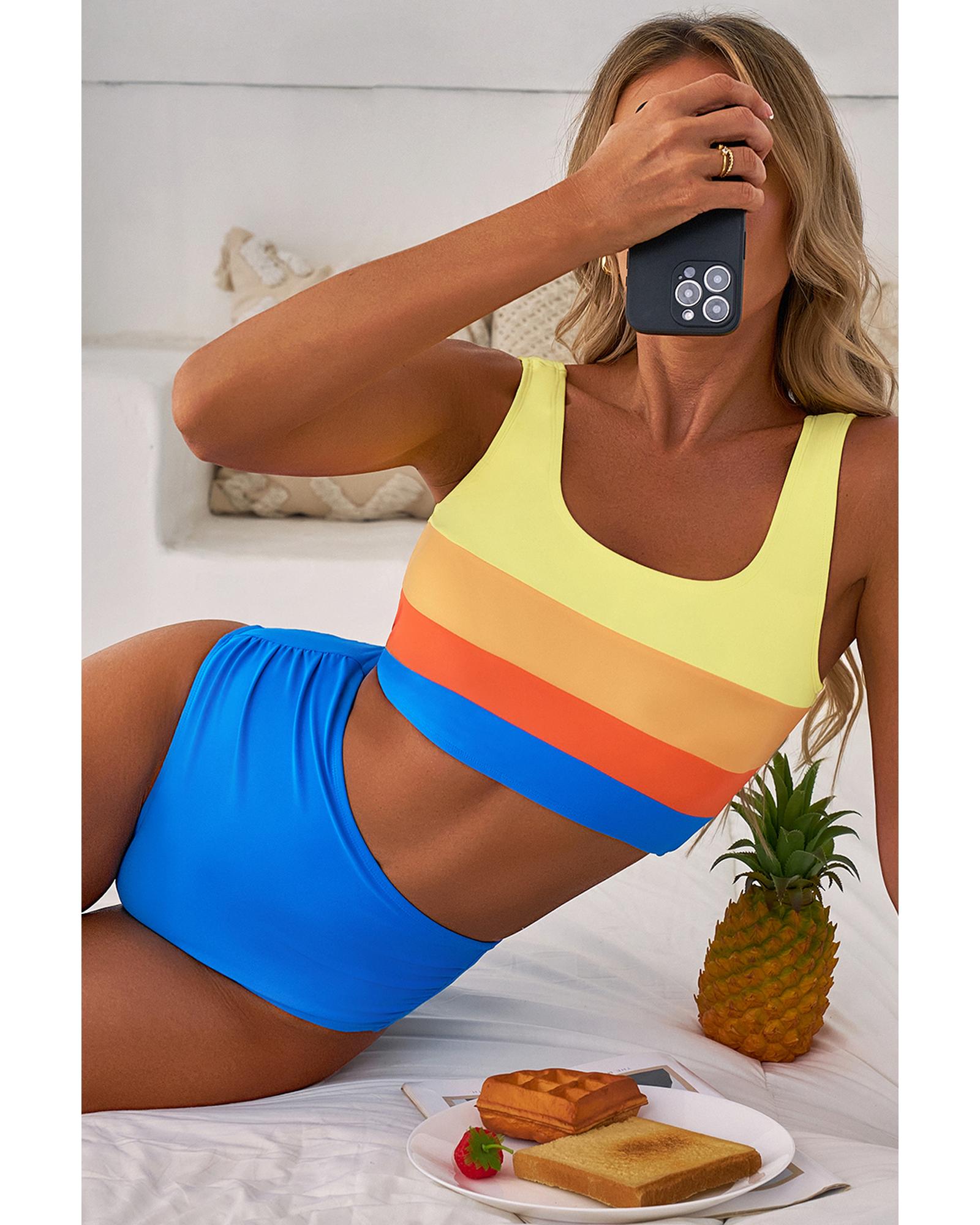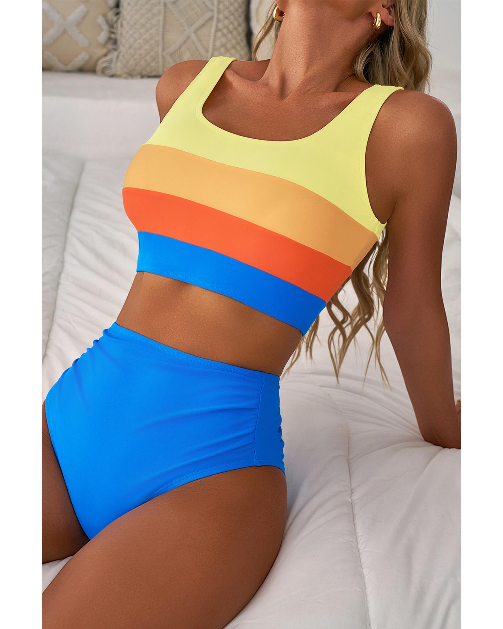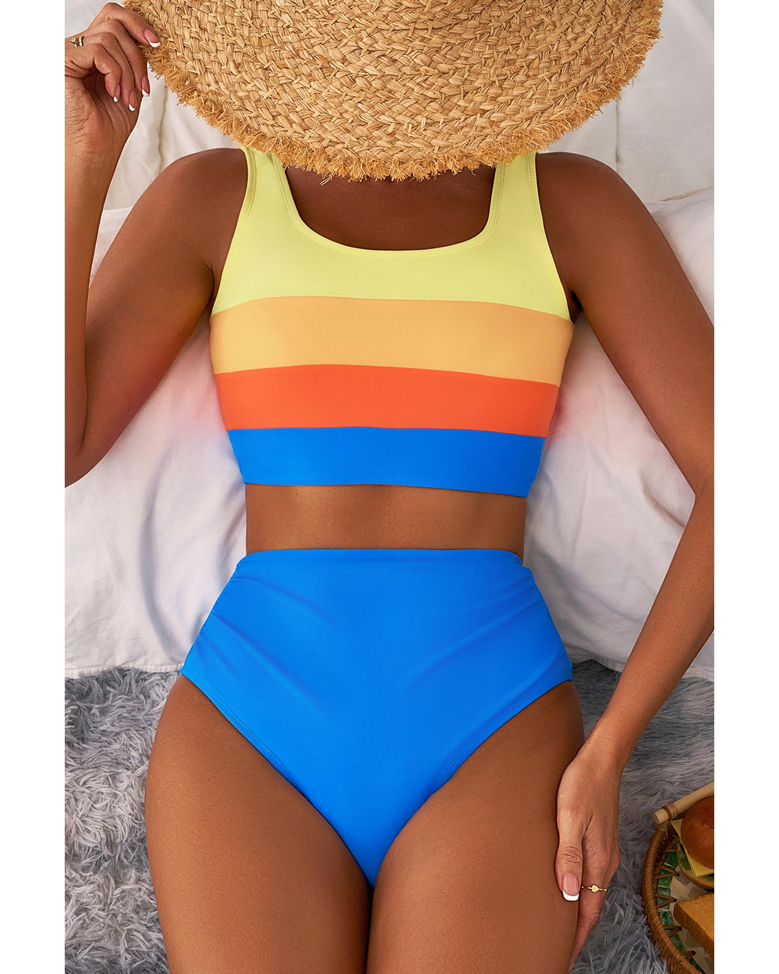 Blue Colorblock Square Neck Top Pleated High Waisted Bikini – XL