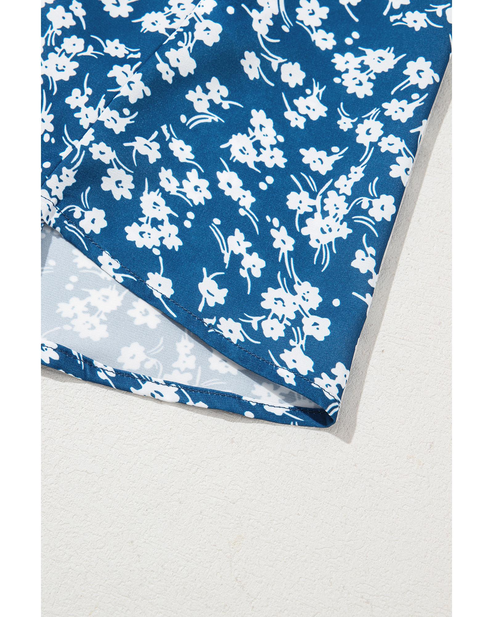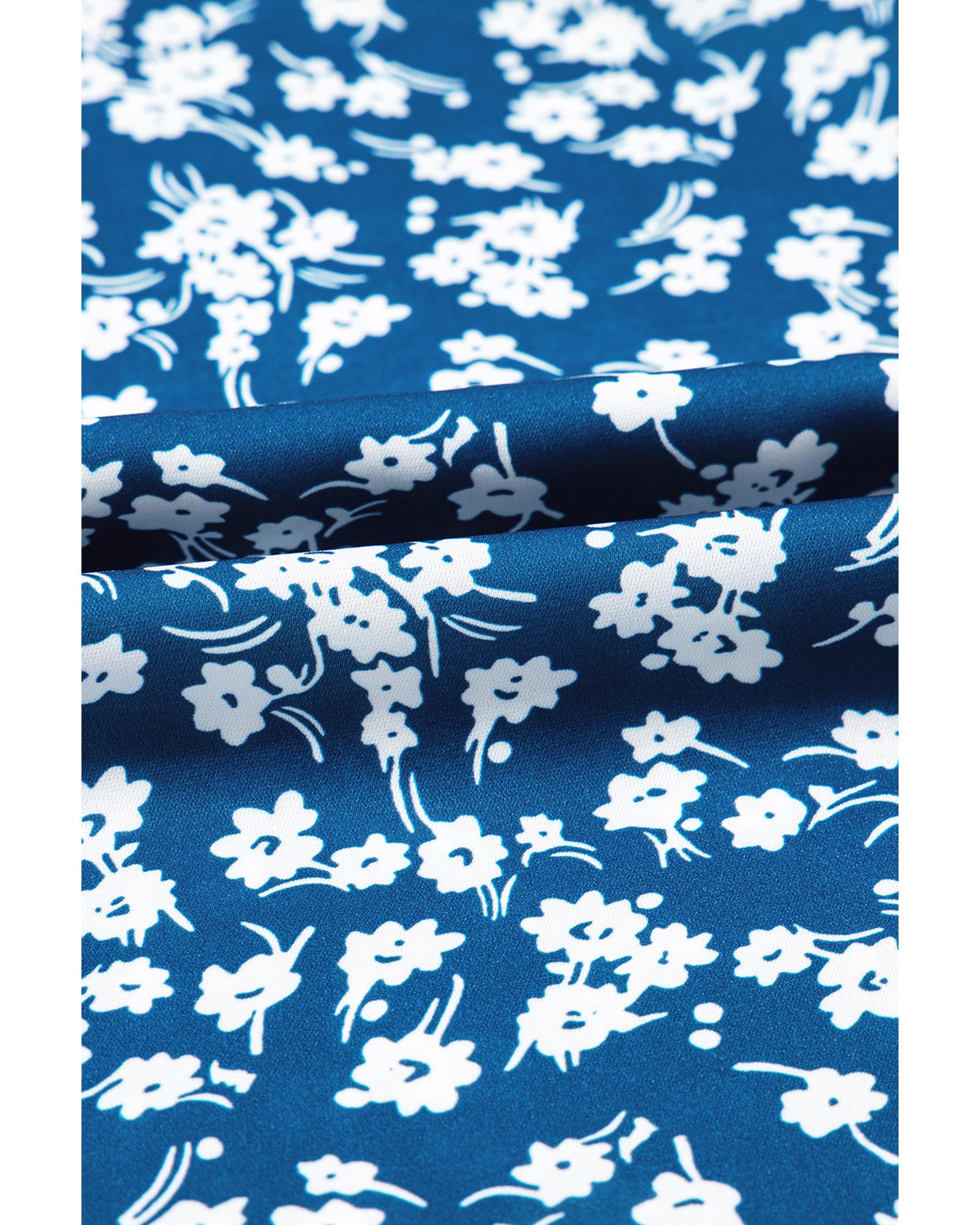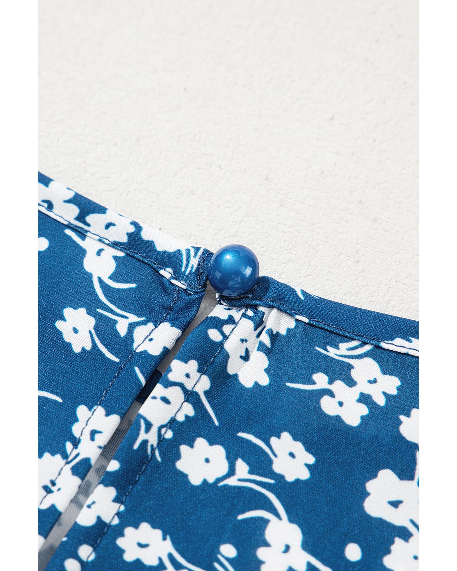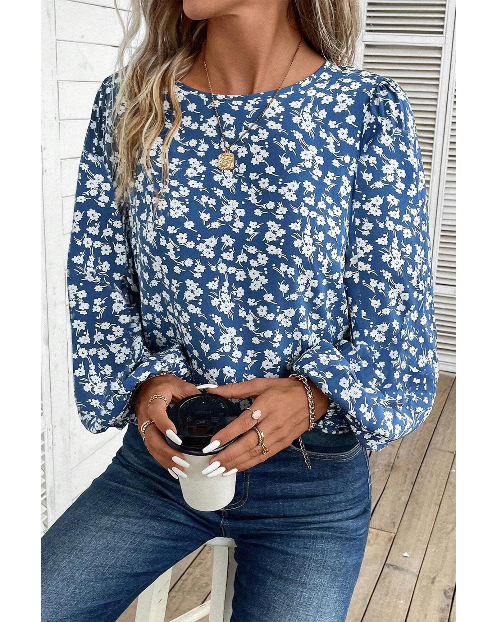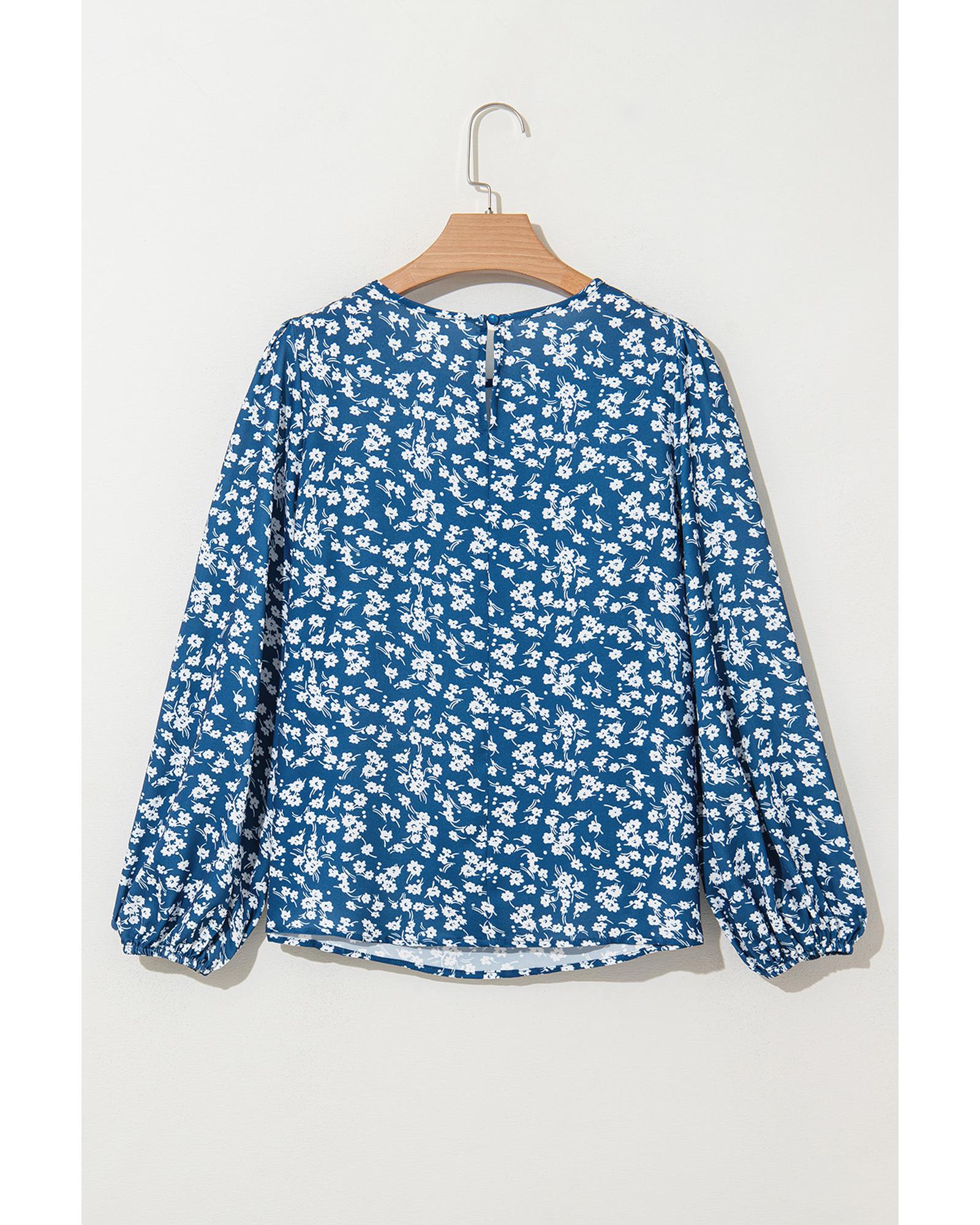 Blue Ditsy Floral Print Lantern Sleeve Blouse – S