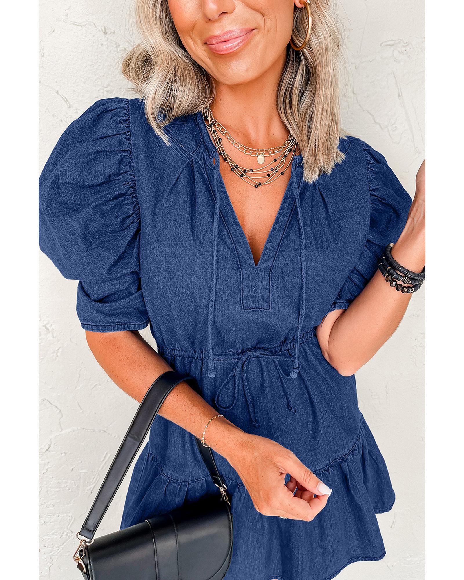 Blue Drawstring High Waist Puff Sleeve Denim Mini Dress – XL