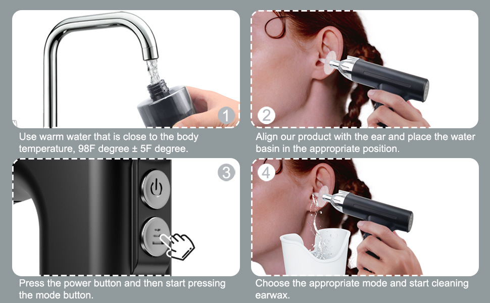 • Comfortable & Gentle: Adjustable modes ensure a comfortable experience for sensitive ears. Use warm water (around 98��F/37��C) for best results.