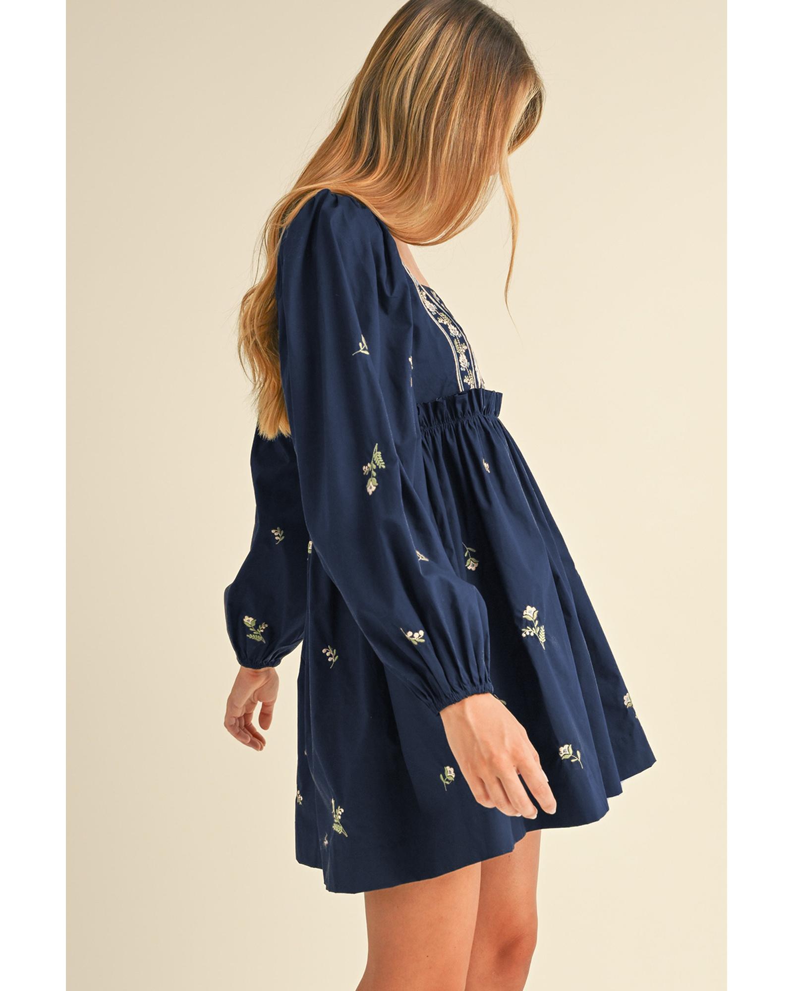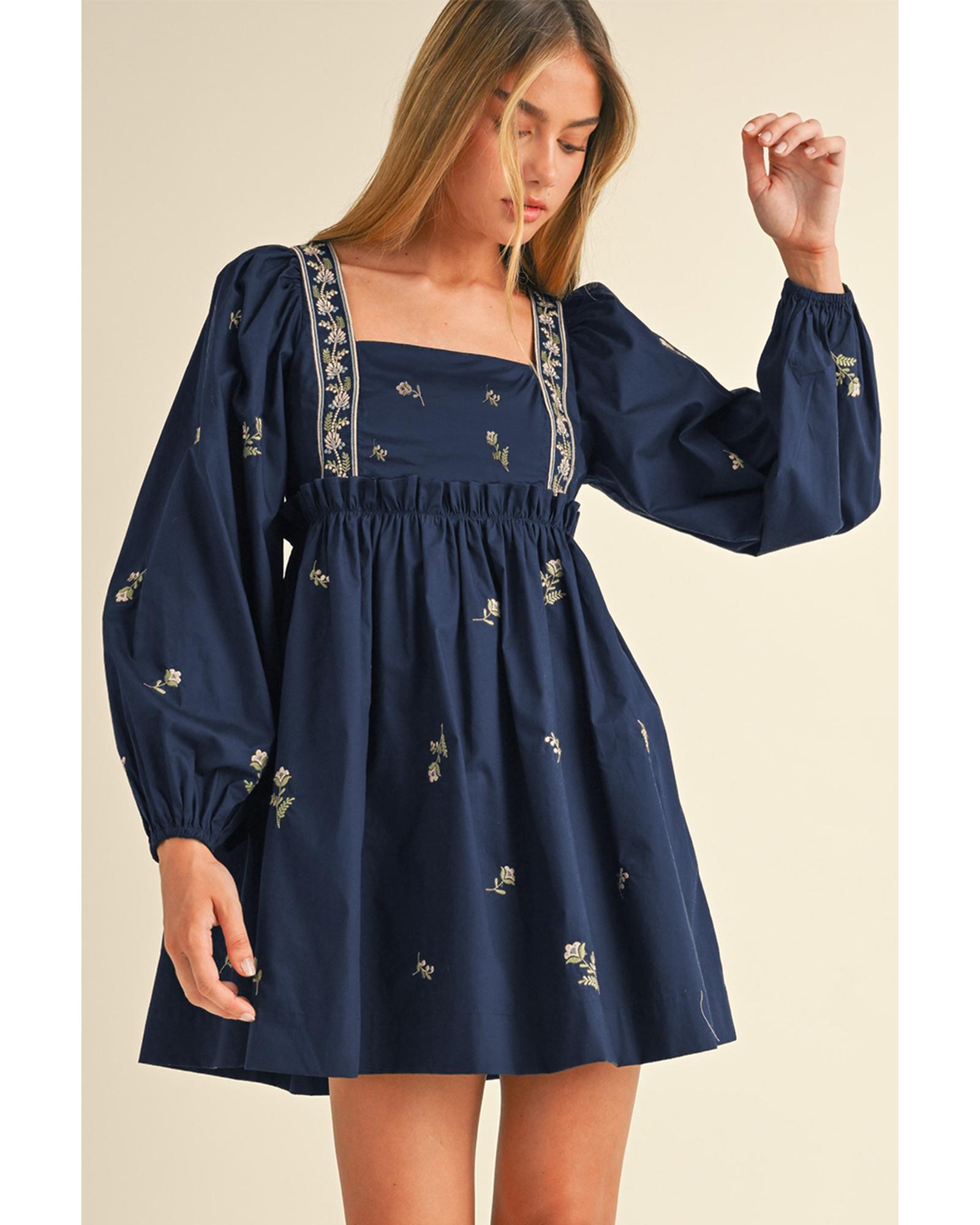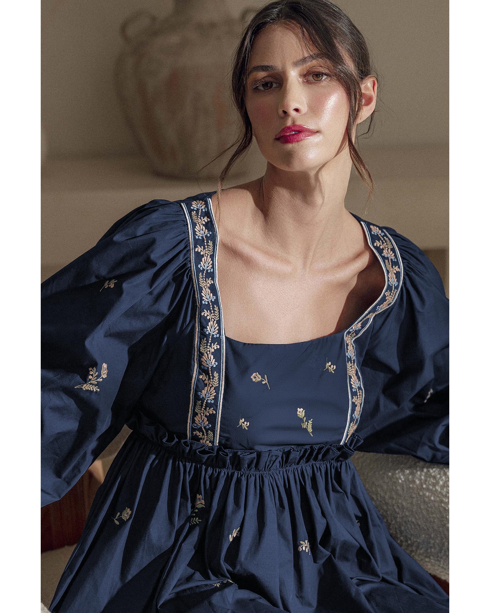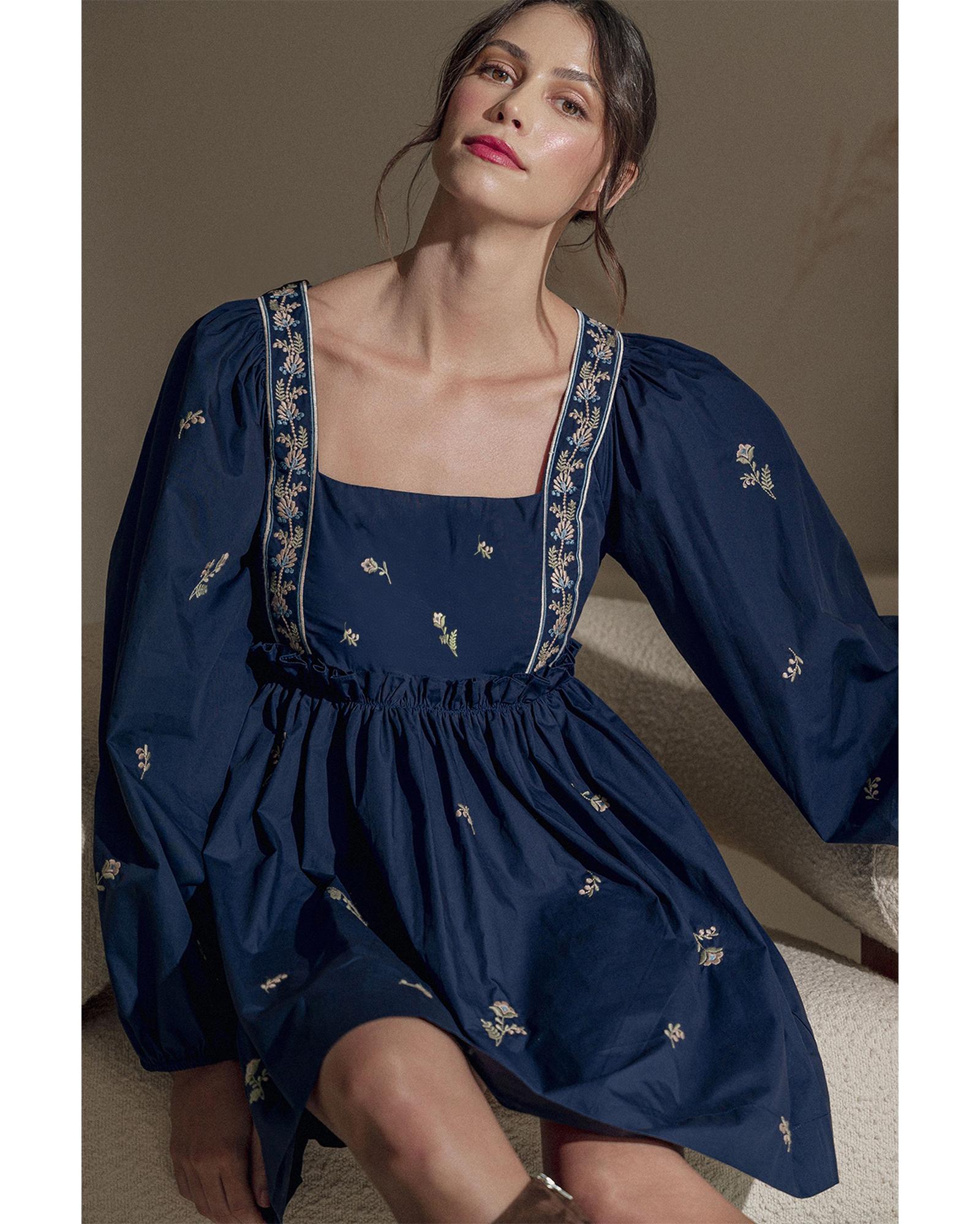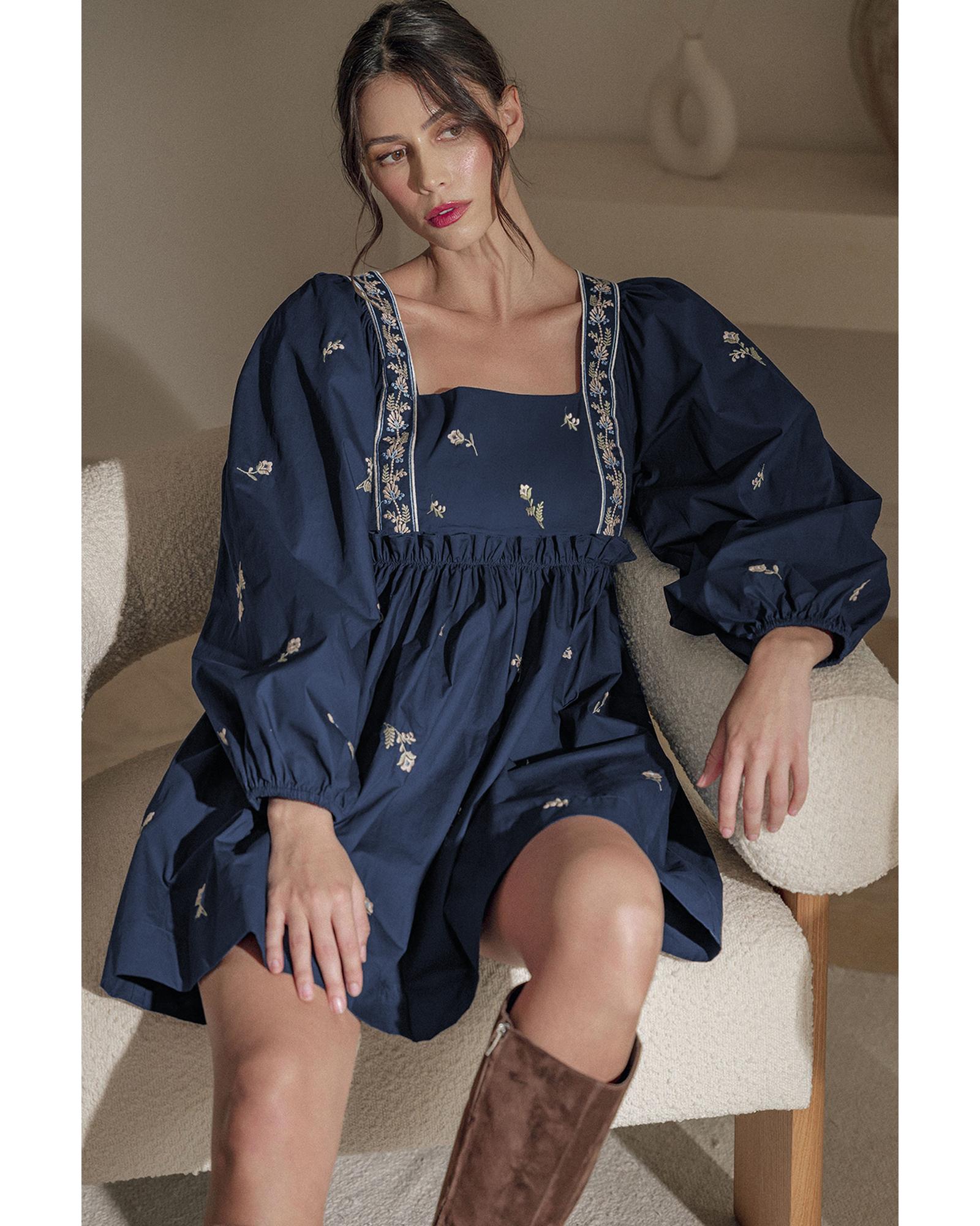 • Blue Floral Embroidered Square Neck Puff Sleeve Ruffled Mini Dress