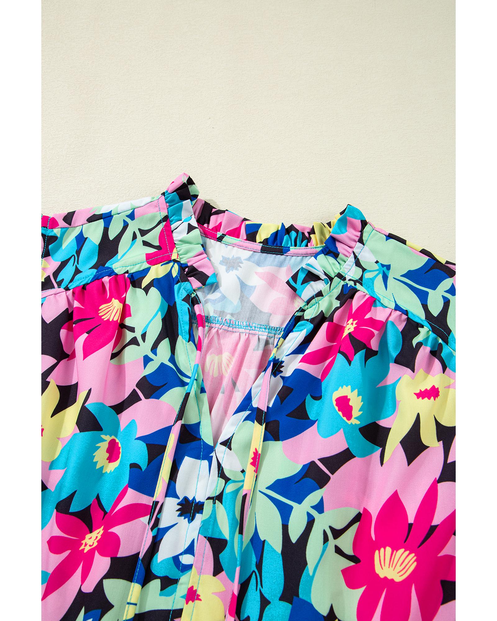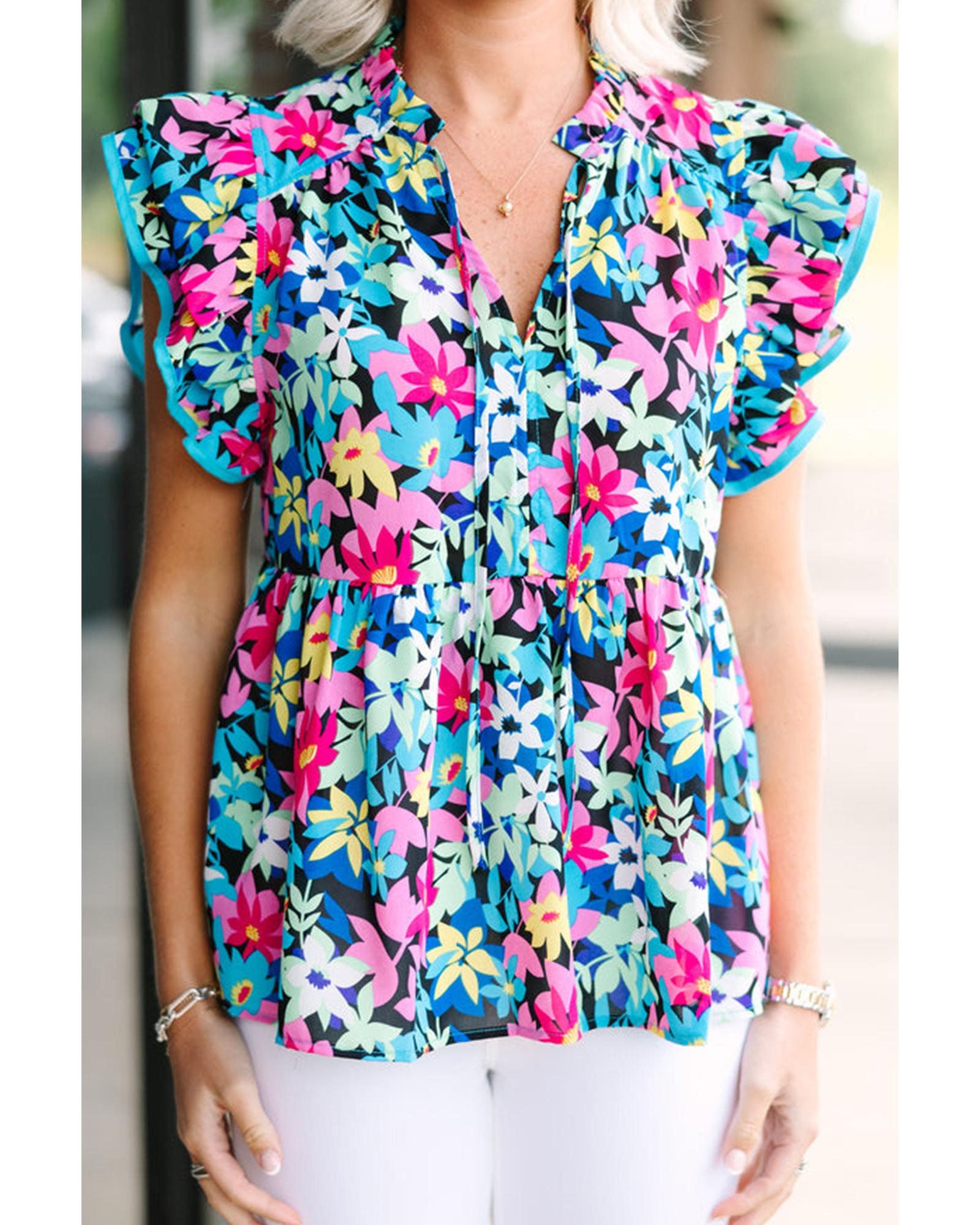 Blue Floral Flutter Sleeve Tied Notched Neck Plus Size Blouse - 2X