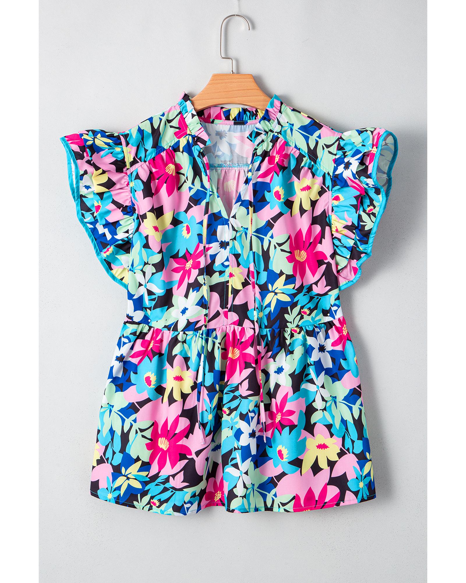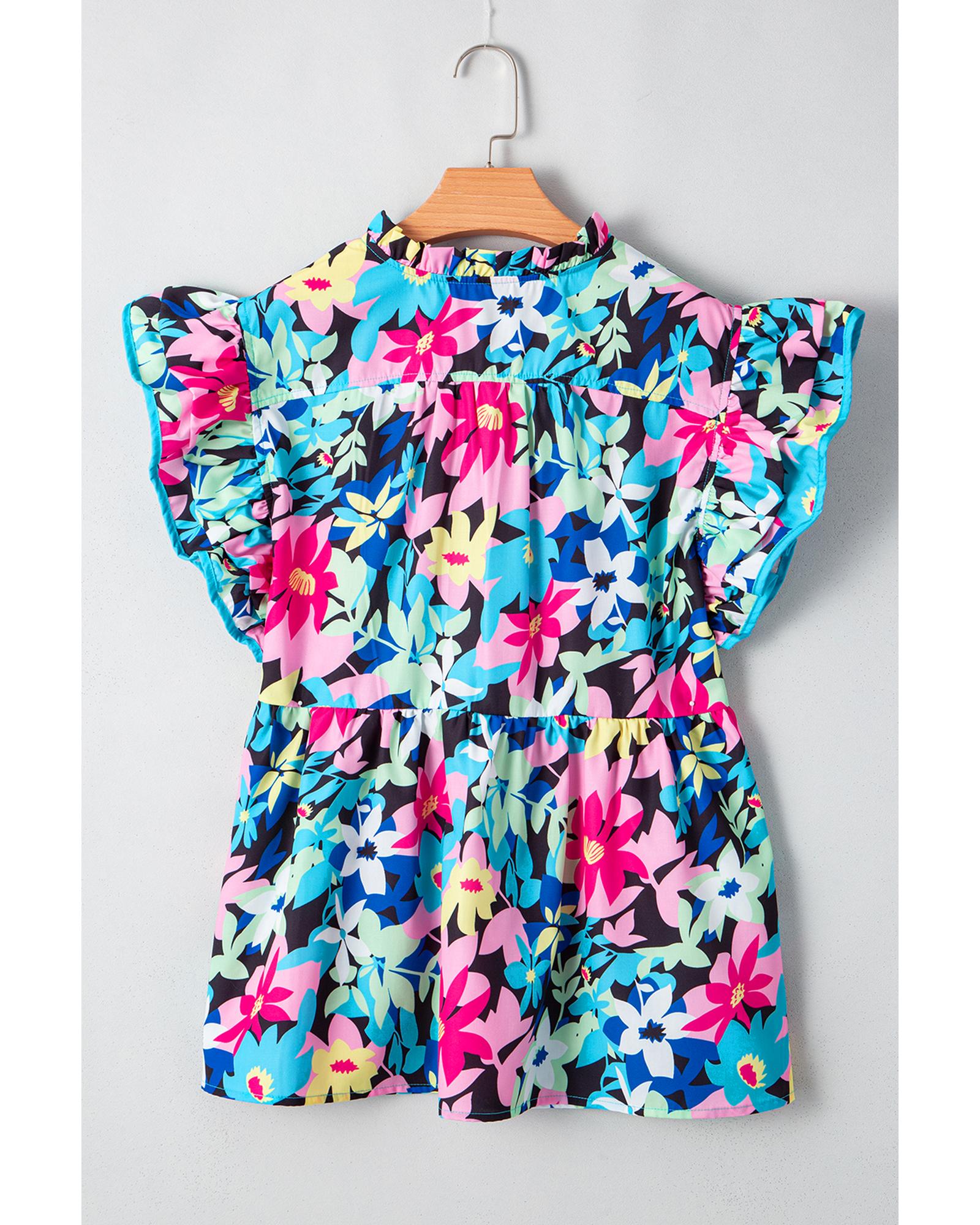 Blue Floral Flutter Sleeve Tied Notched Neck Plus Size Blouse – 1X