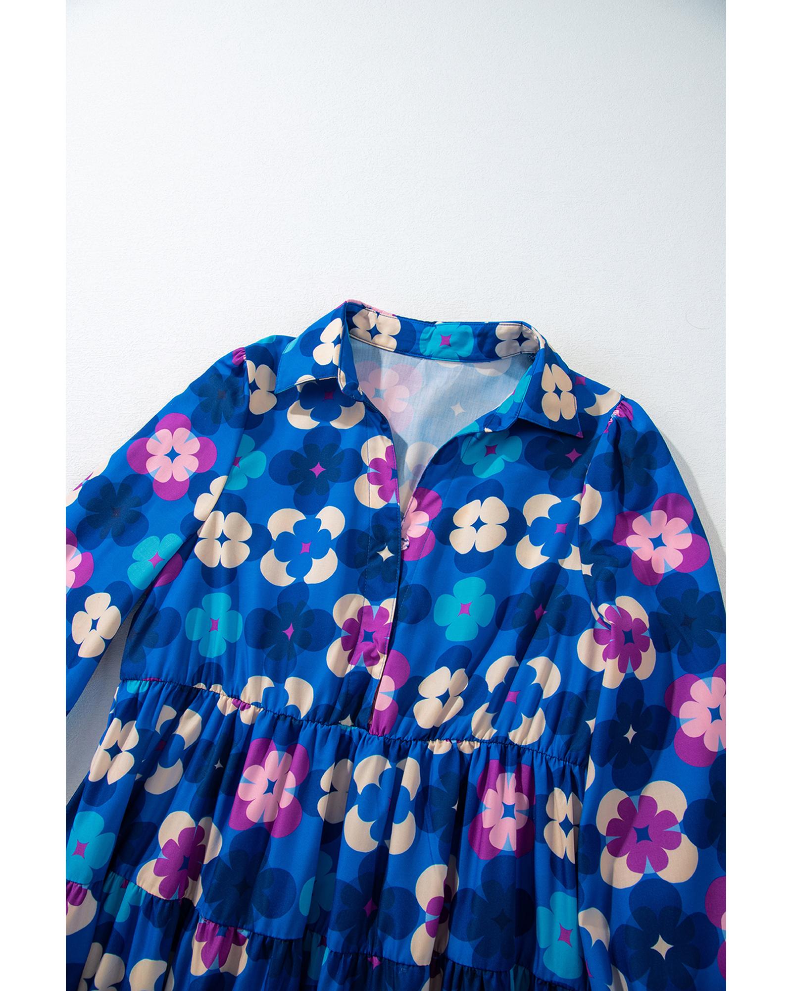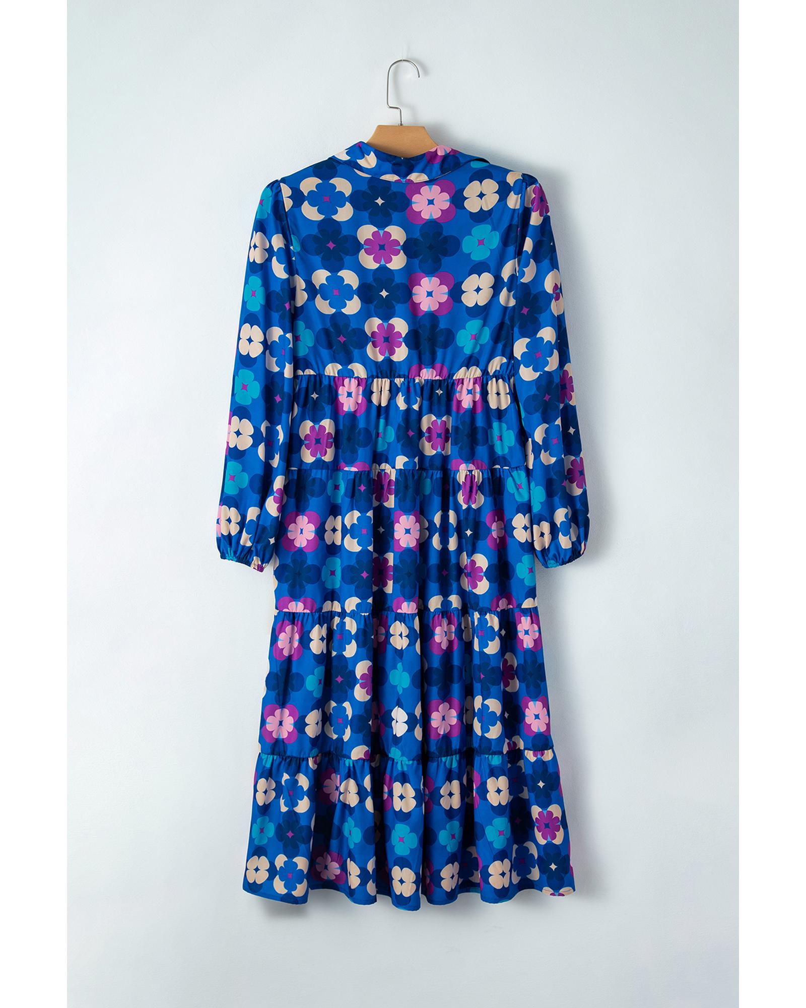 Blue Floral Peasant Sleeve Tiered Ruffle Midi Dress – M