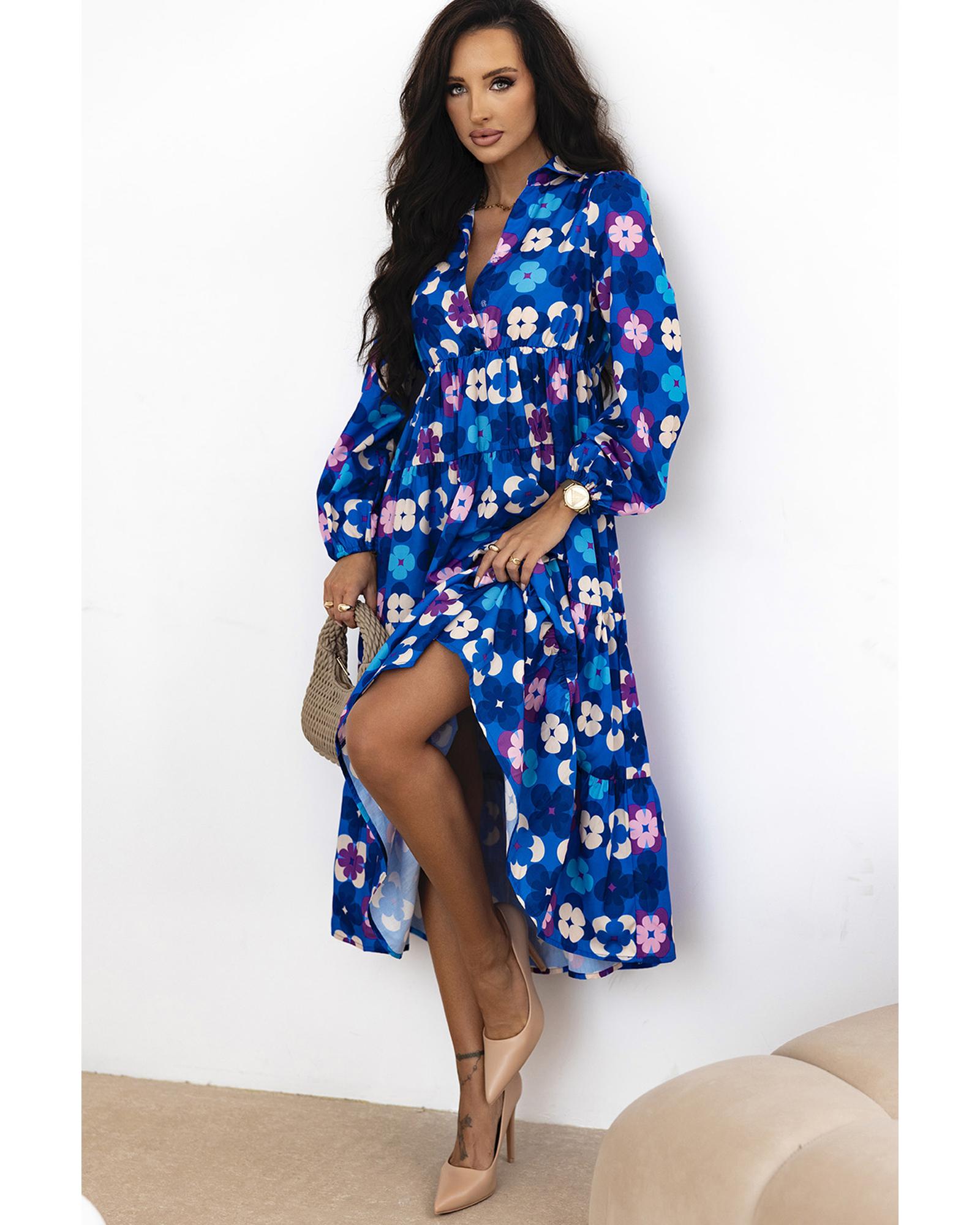 Blue Floral Peasant Sleeve Tiered Ruffle Midi Dress – S