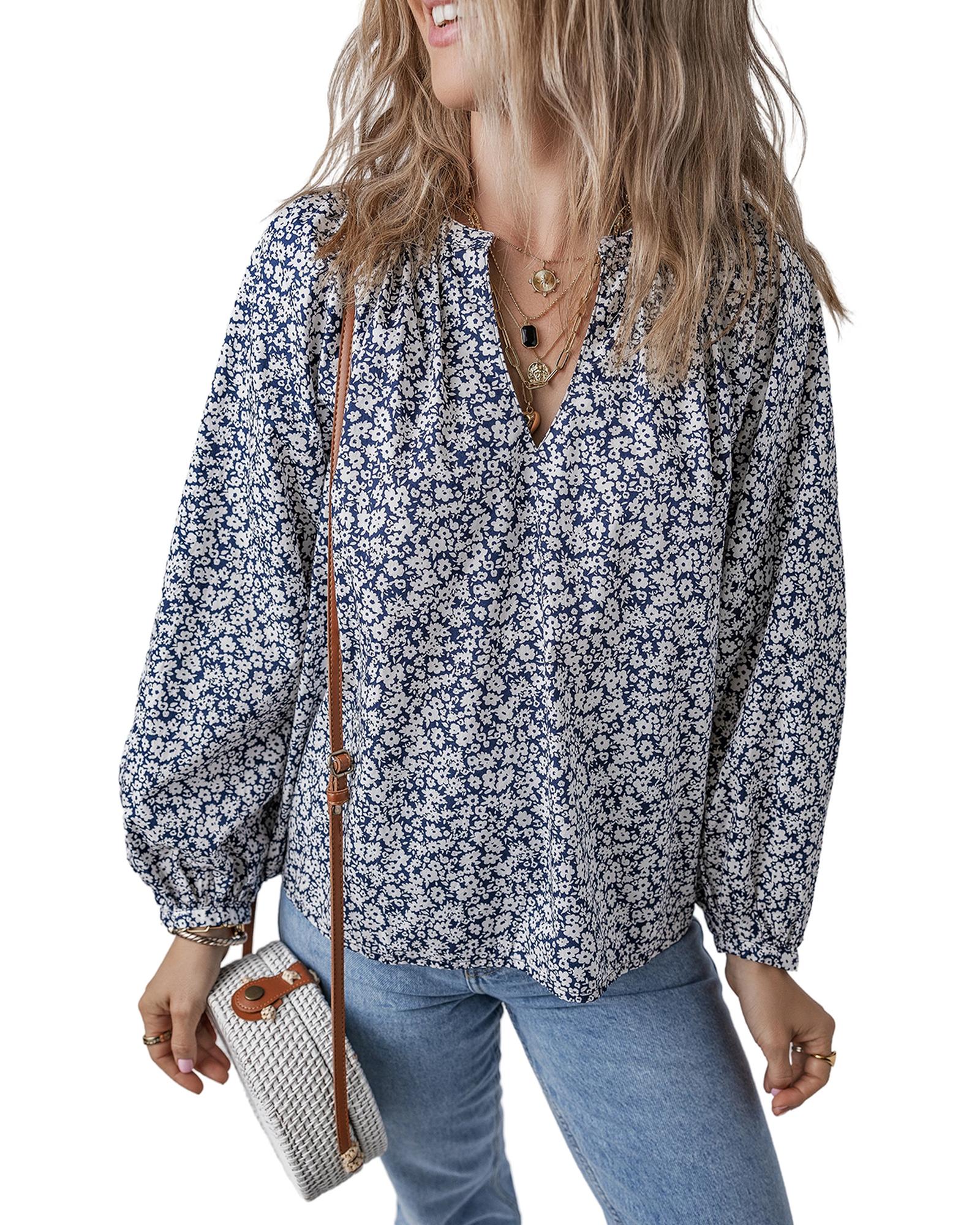 Blue Floral Print Notched V Neck Puff Sleeve Blouse – L