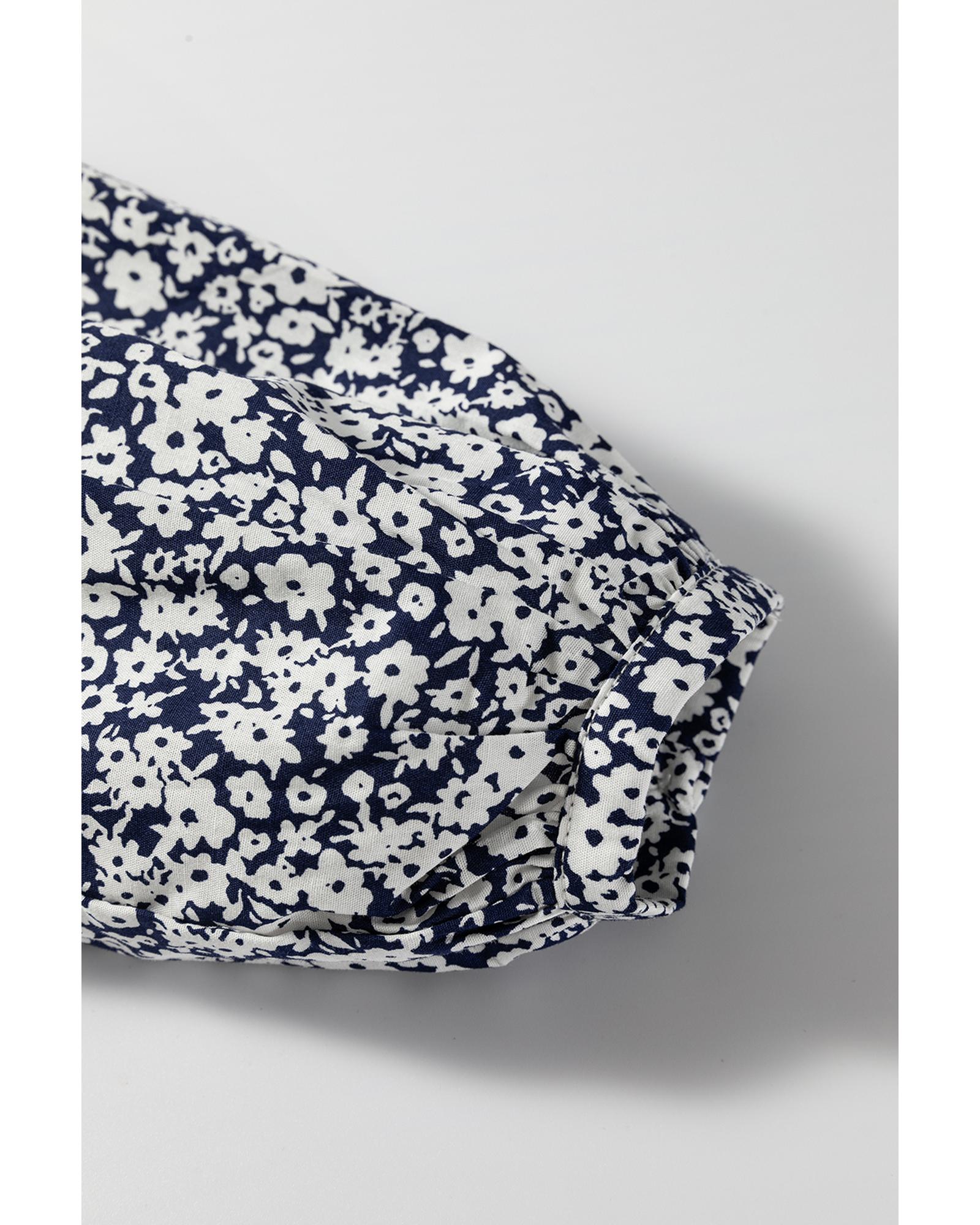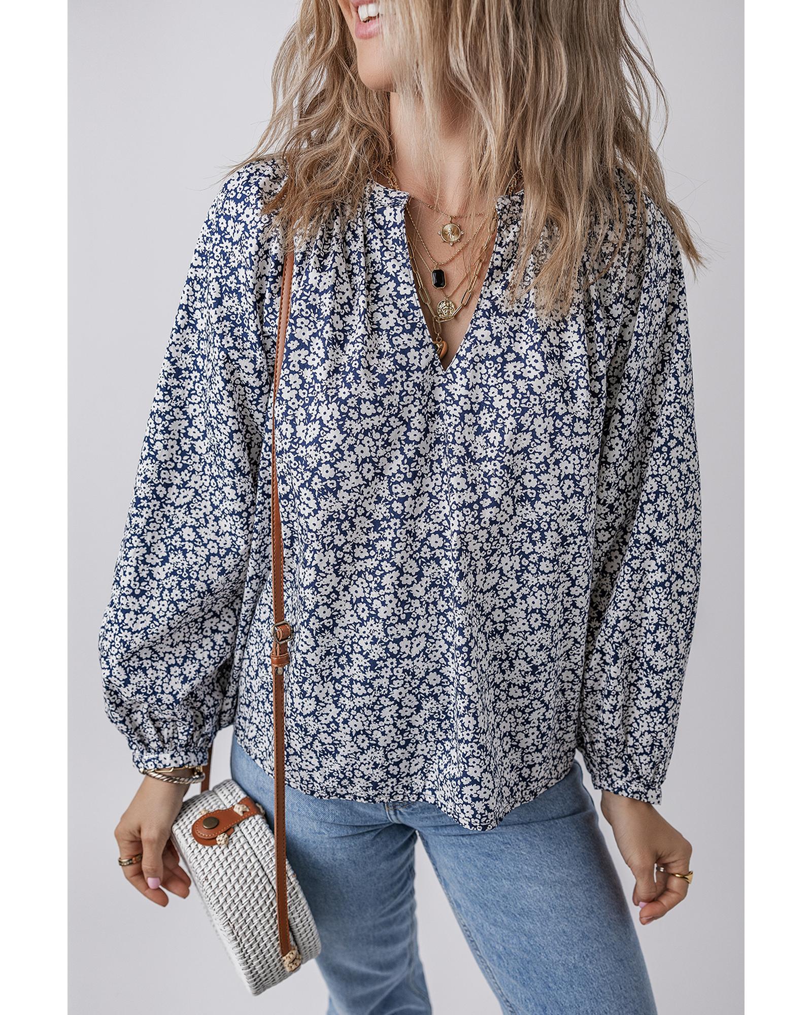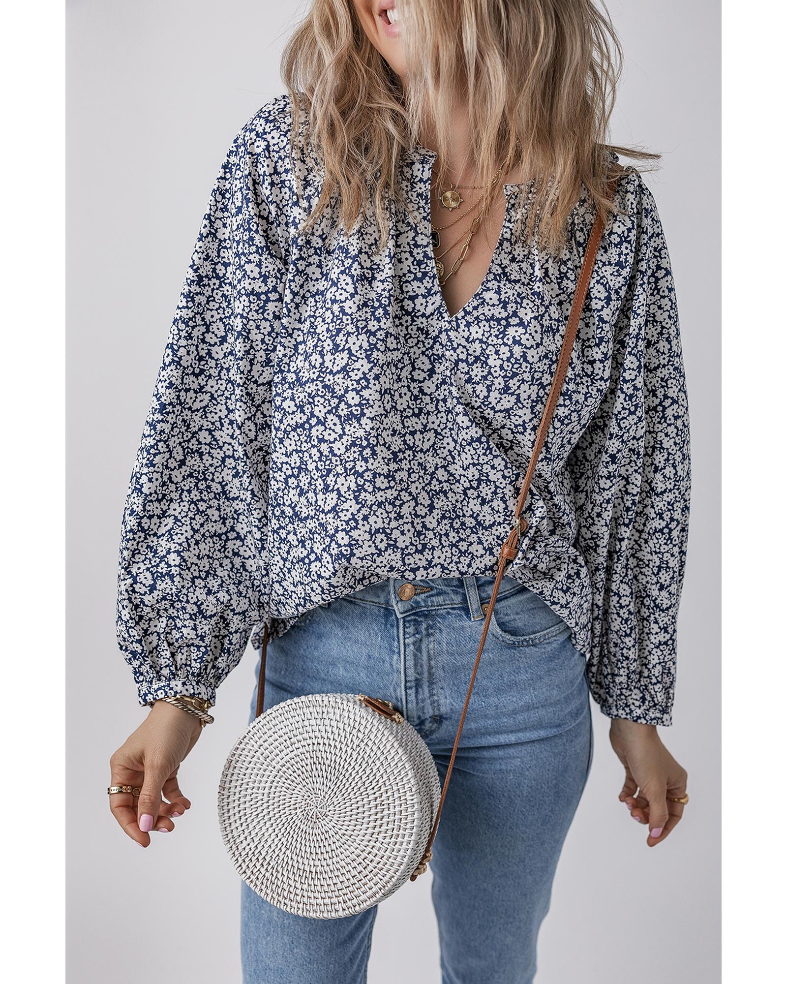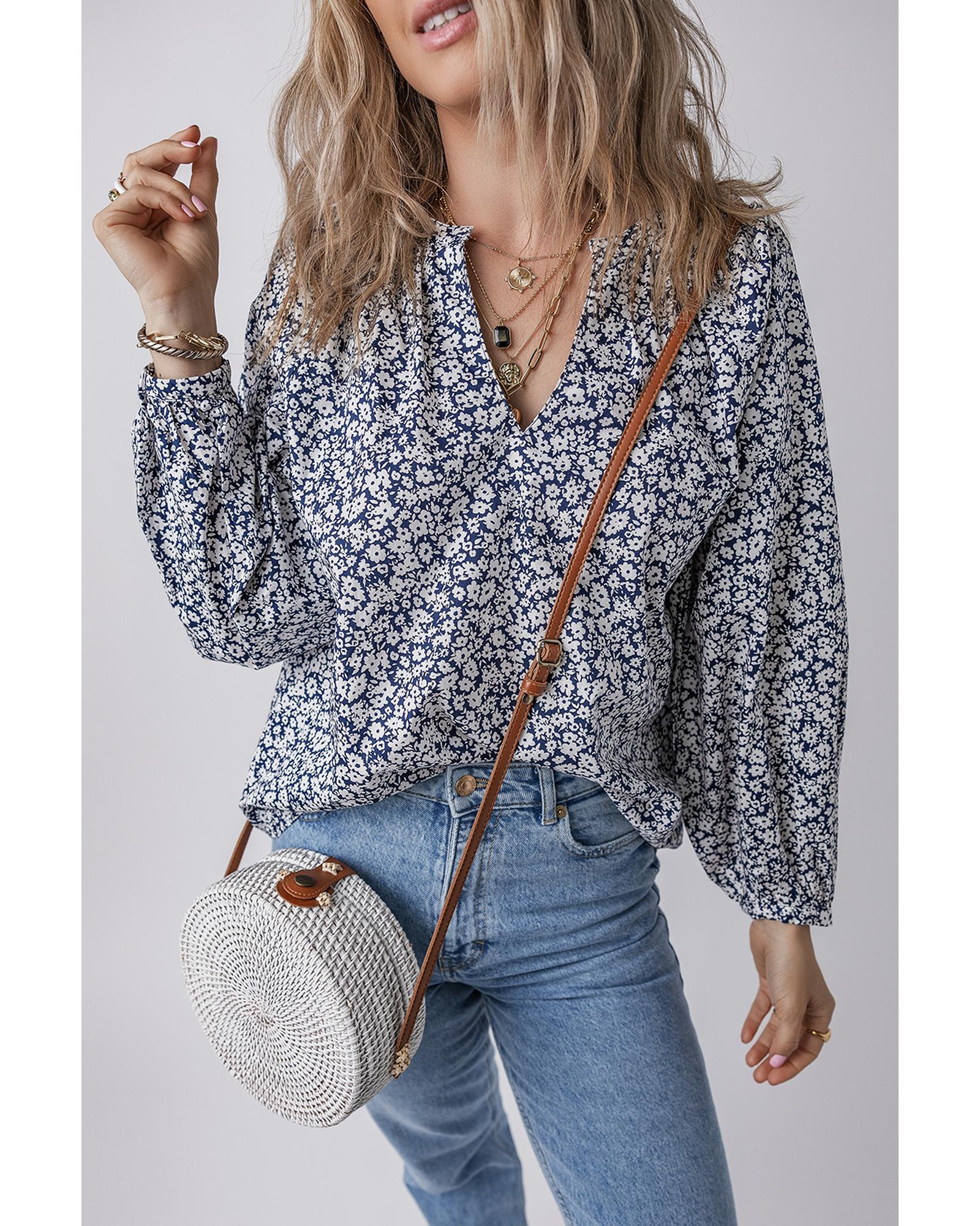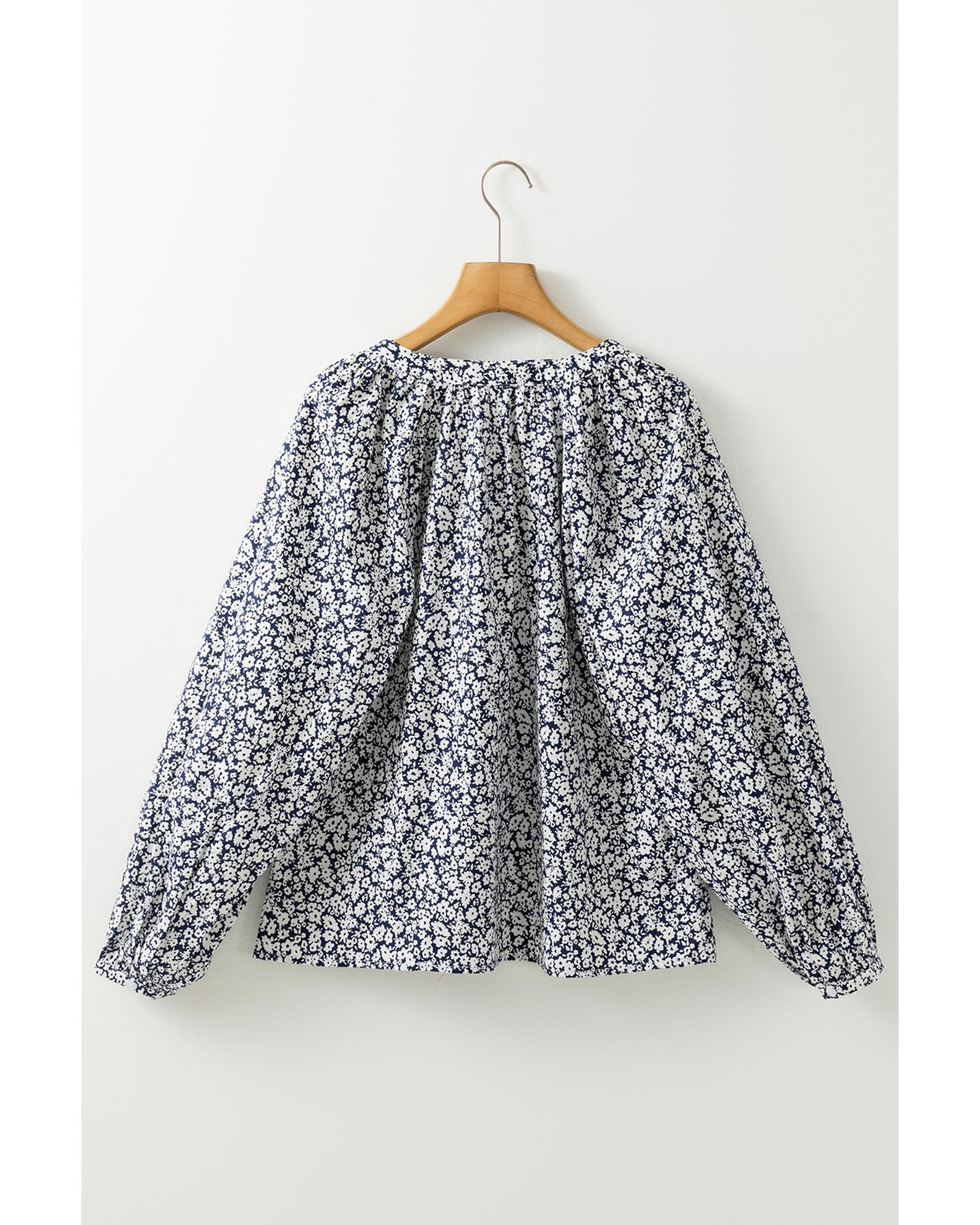 Blue Floral Print Notched V Neck Puff Sleeve Blouse – XL