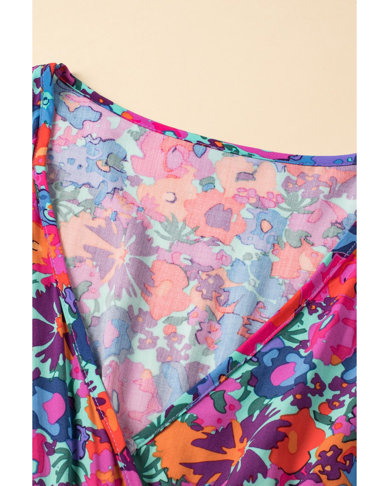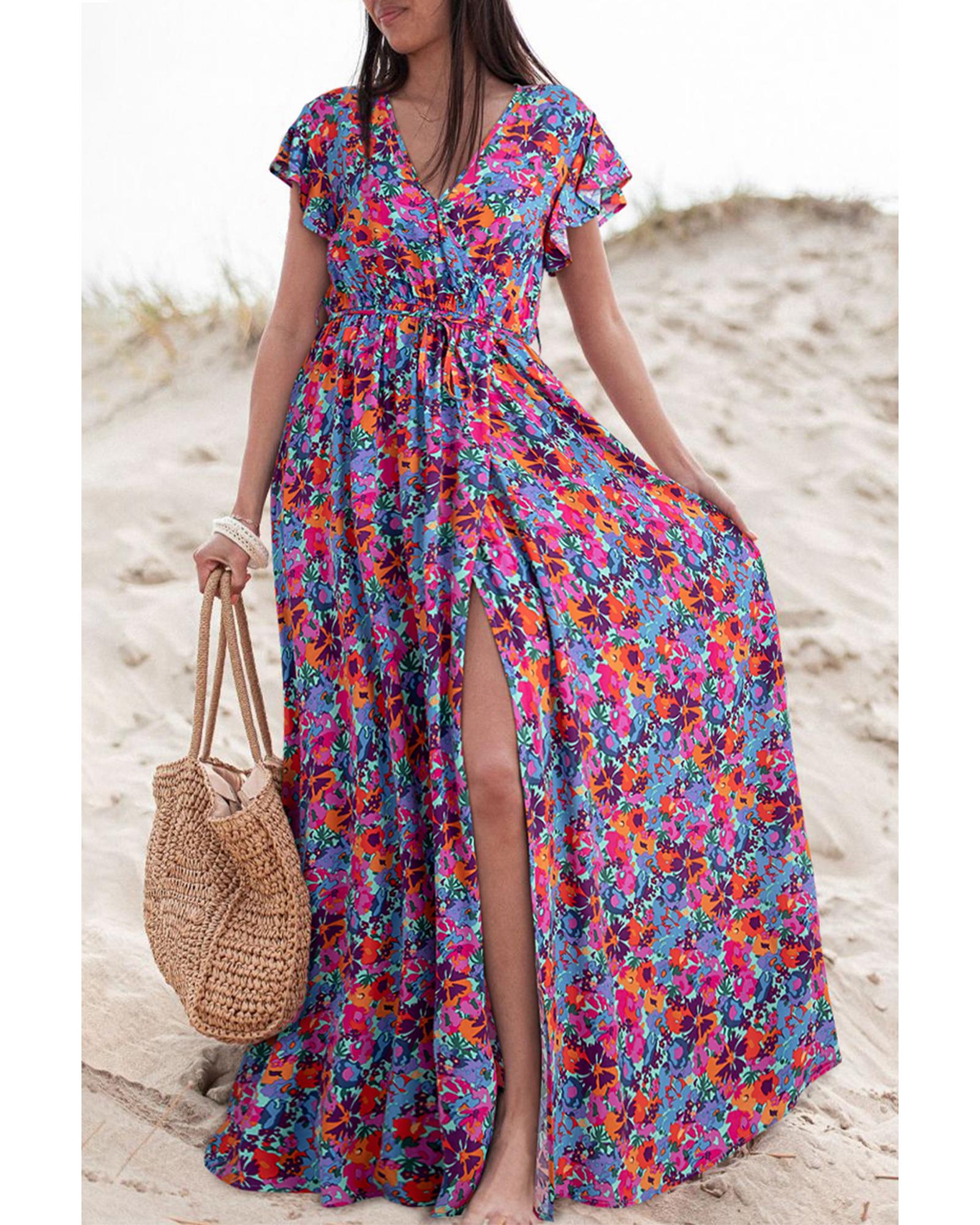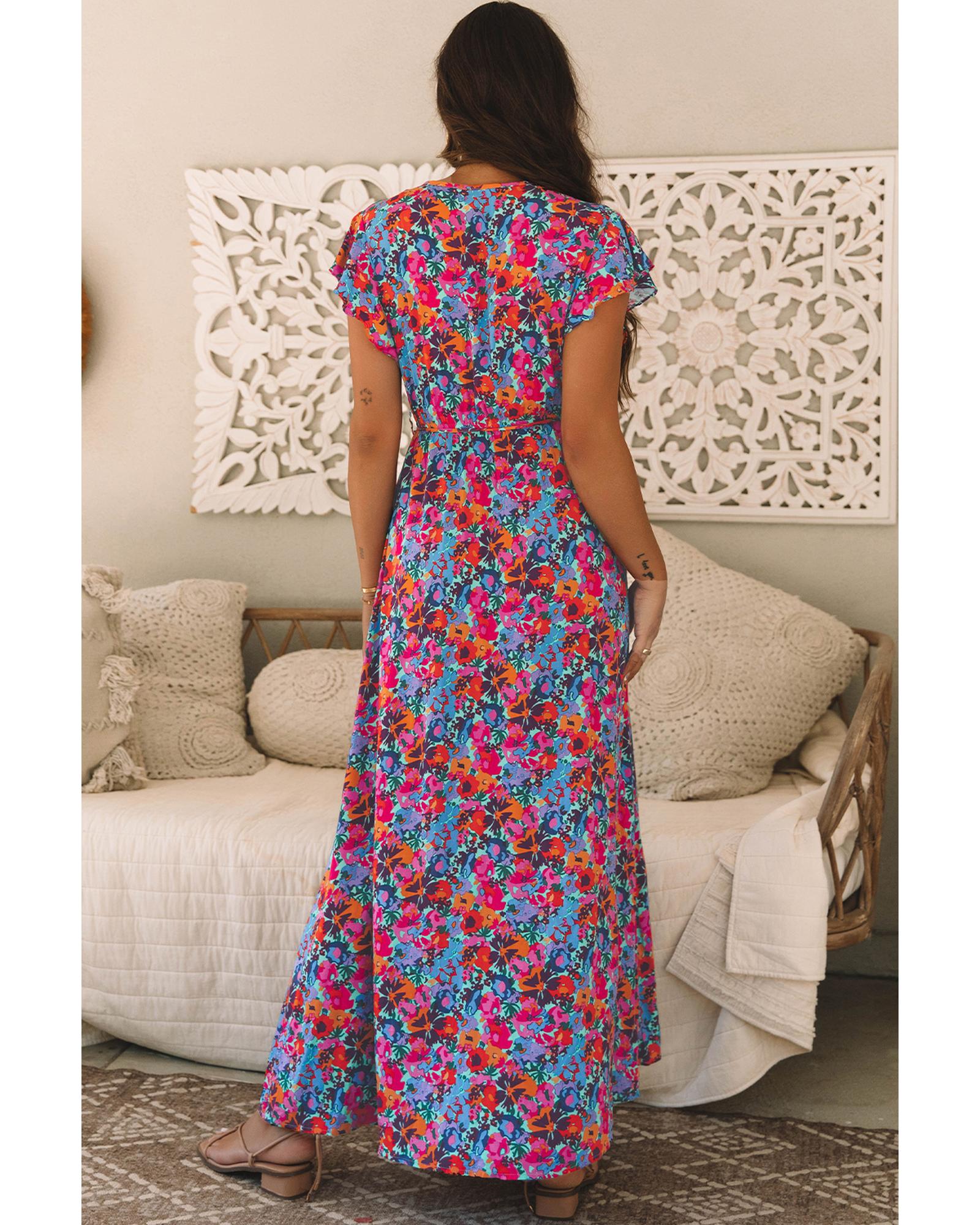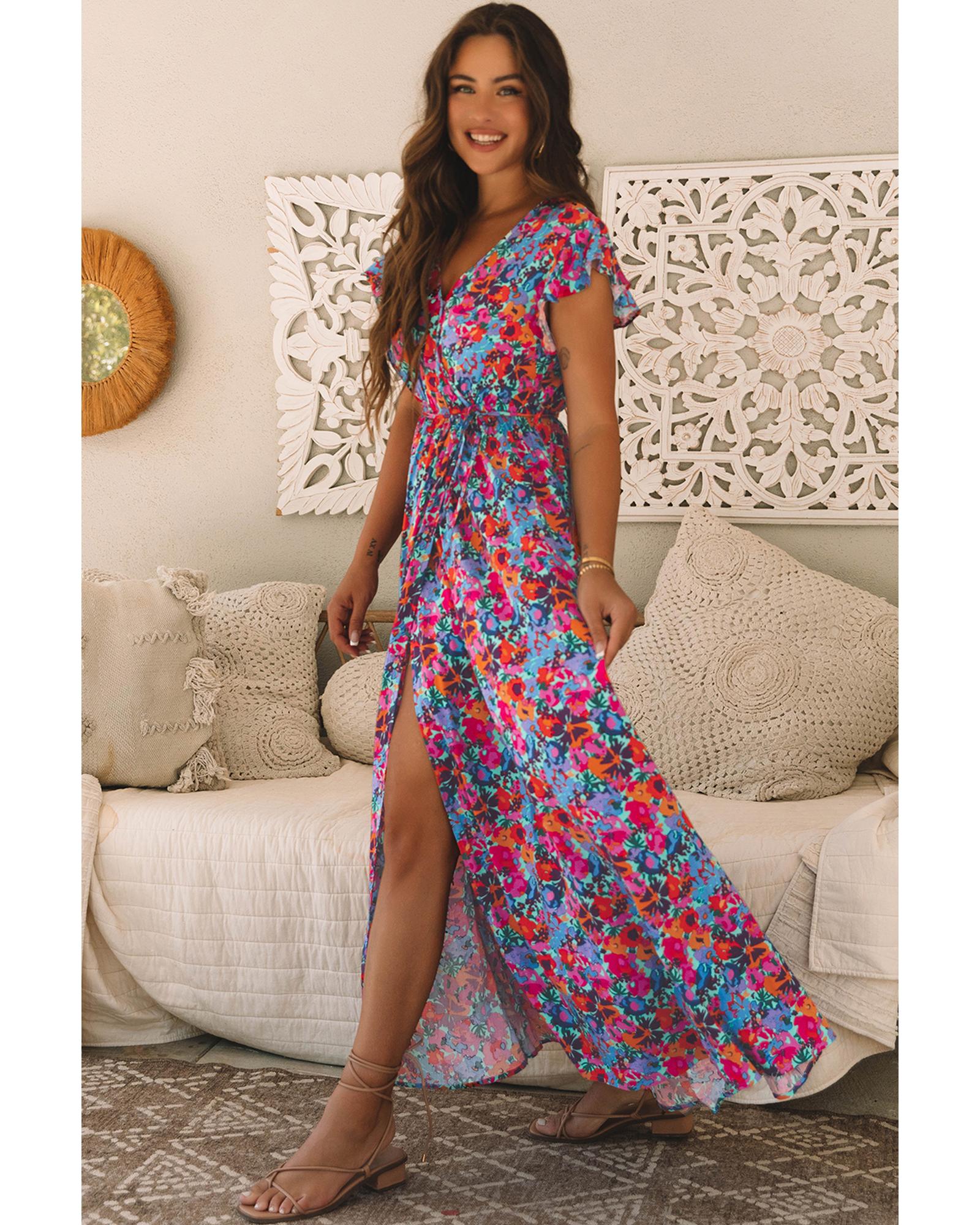 Blue Floral Print V Neck Wrap Split Maxi Dress – L