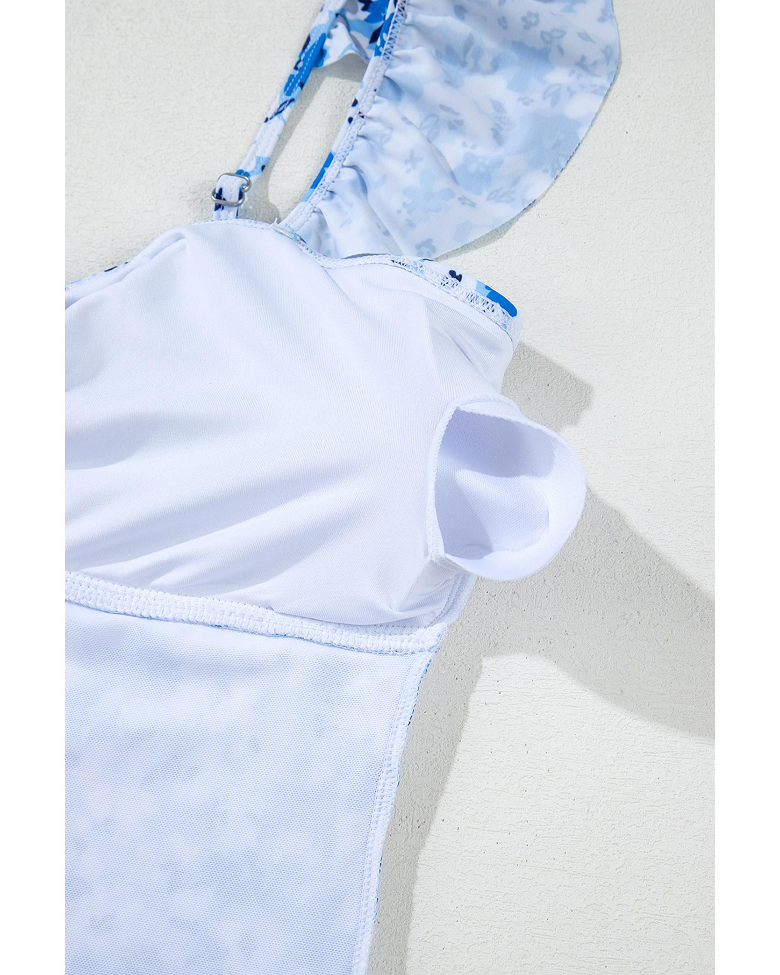 Blue Floral Ruffled Strap Lace-up Hollow Out One Piece Swimsuit – XL