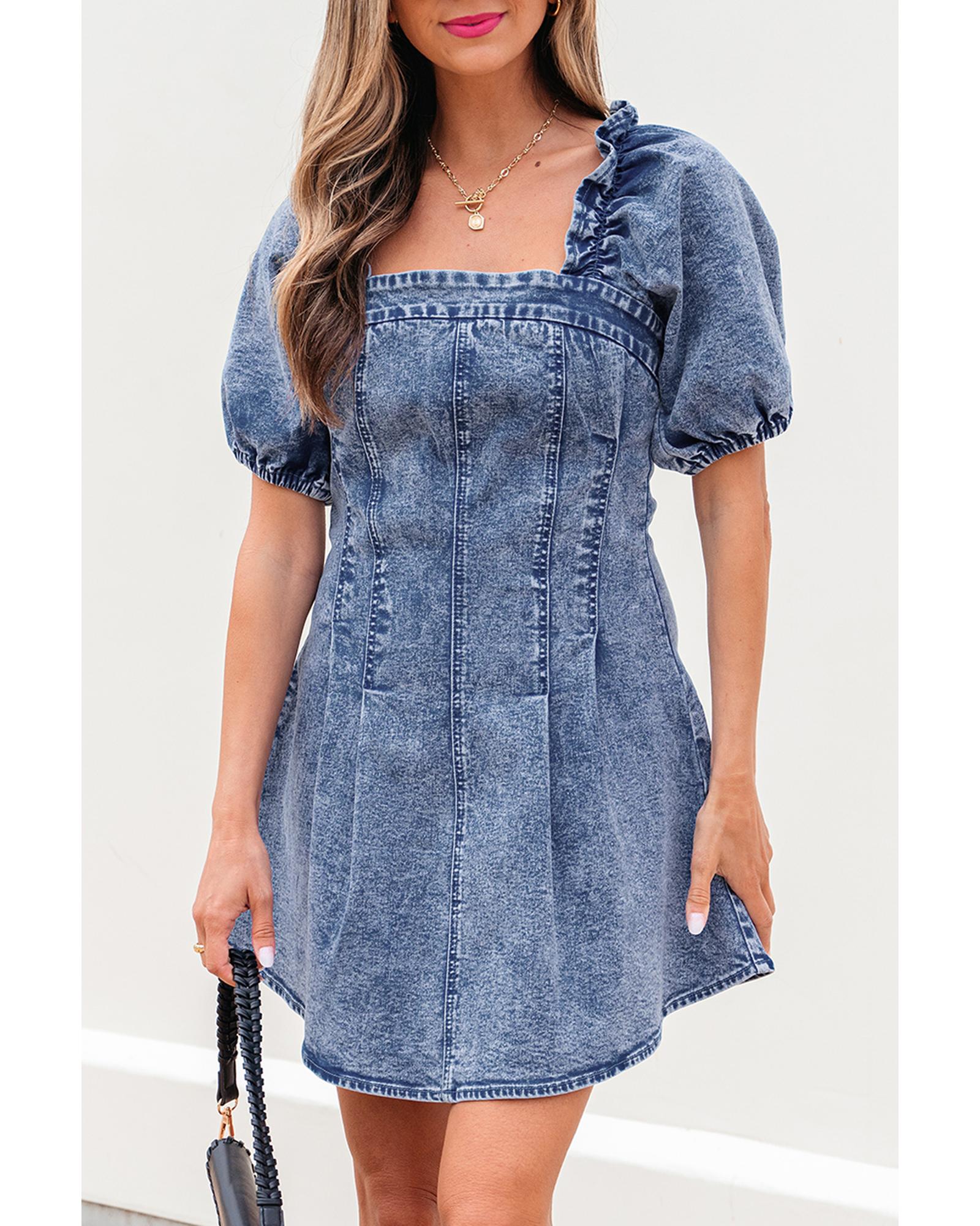- Blue frilly square neck bustier denim dress