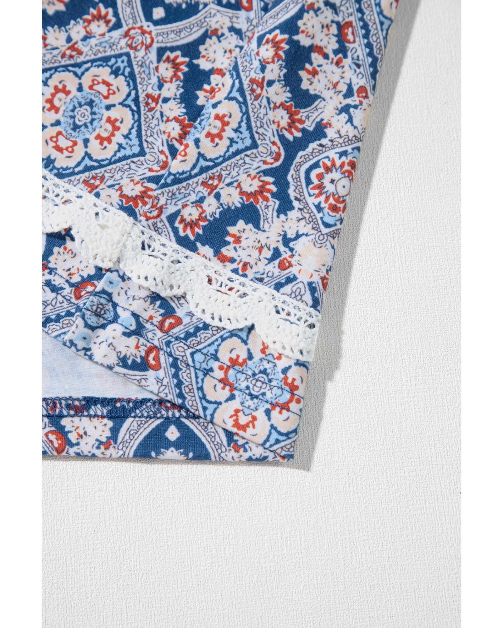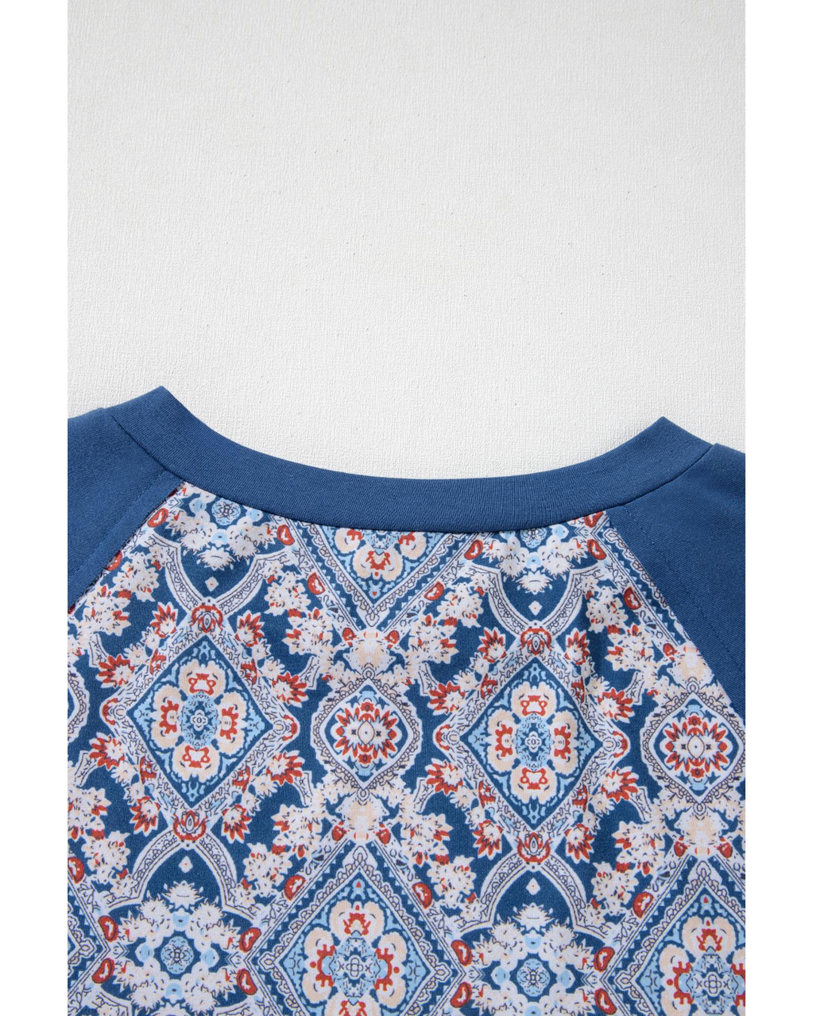 Blue Geometric Printed Lace Patchwork Ric Rac Raglan Long Sleeve Top – L
