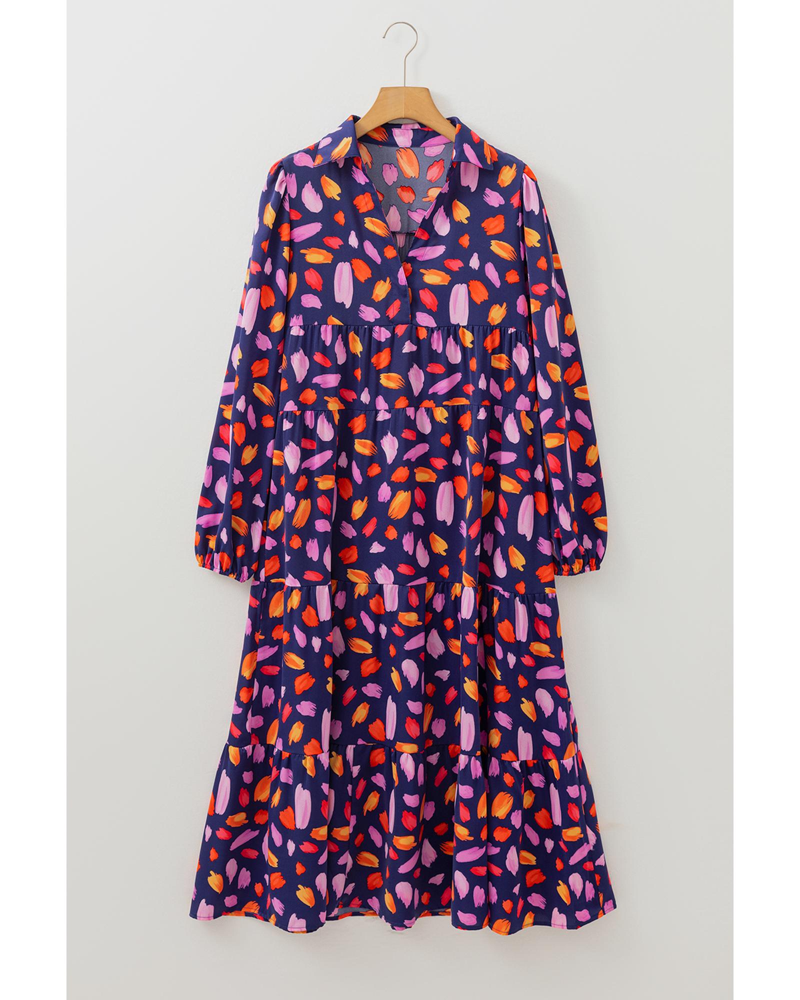 Blue Petal Collared Tiered Flowy Long Dress – 2XL