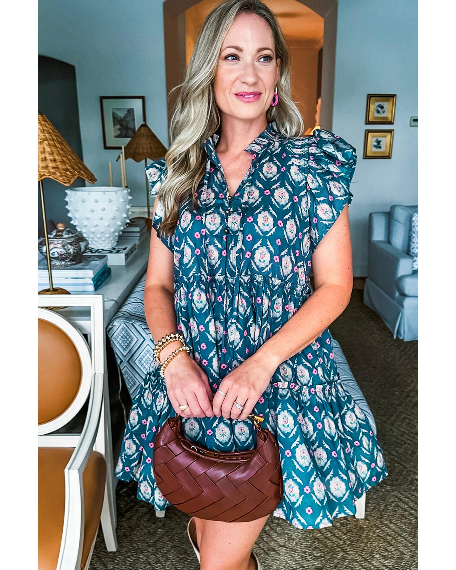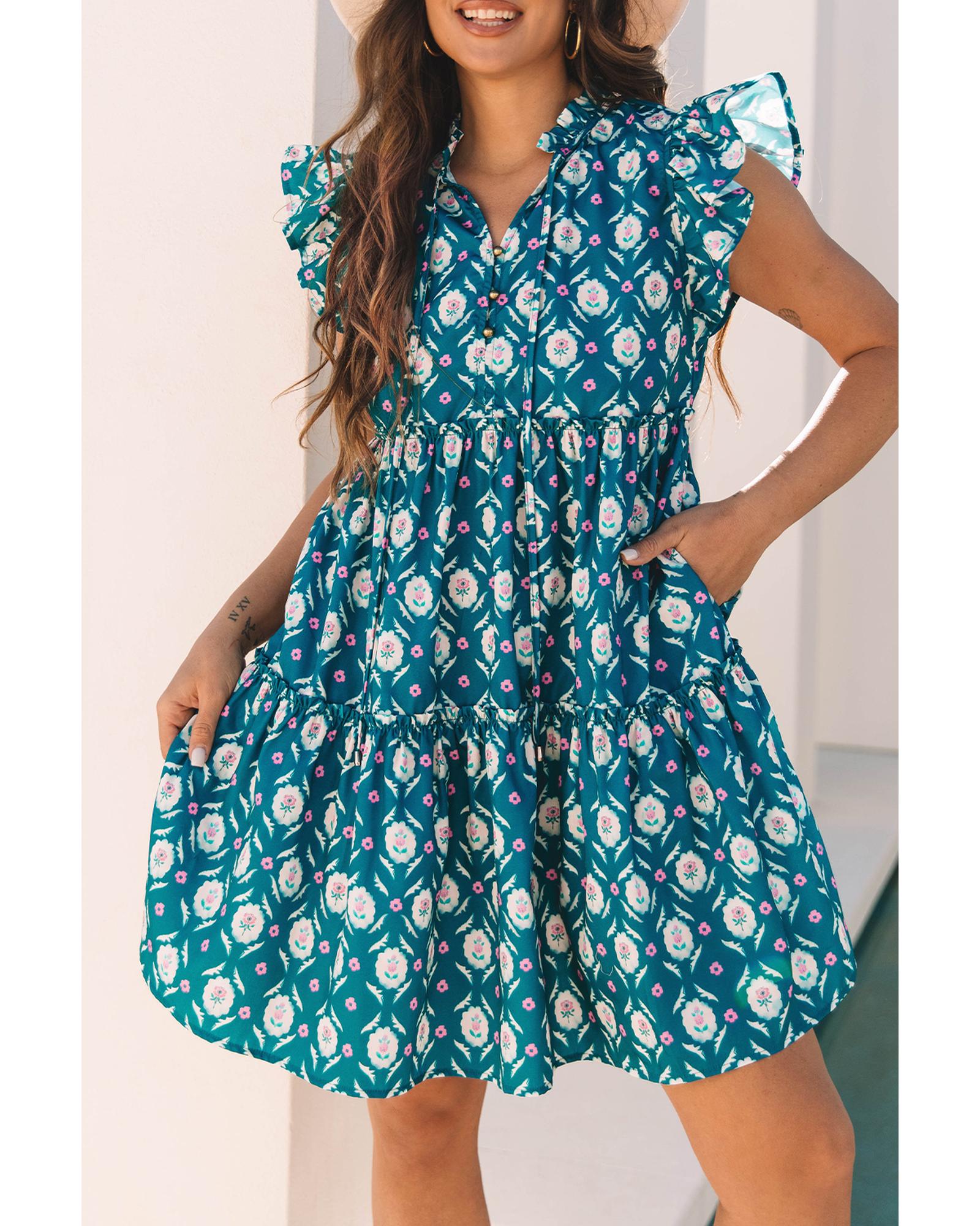 Blue Retro Floral Print Split Neck Ruffle Short Sleeve Dress – S
