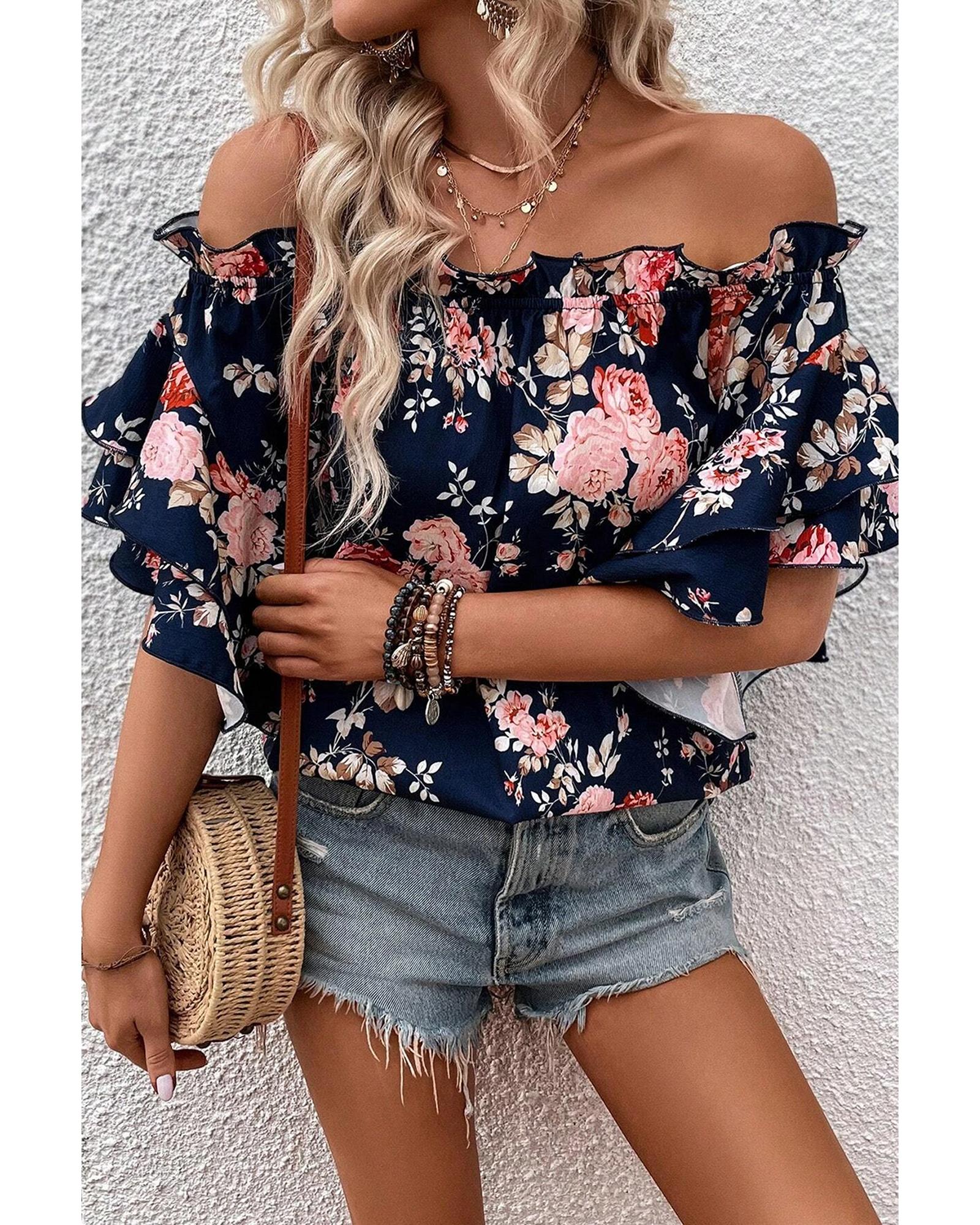 Blue Ruffle Off Shoulder Flounce Sleeve Floral Blouse – S