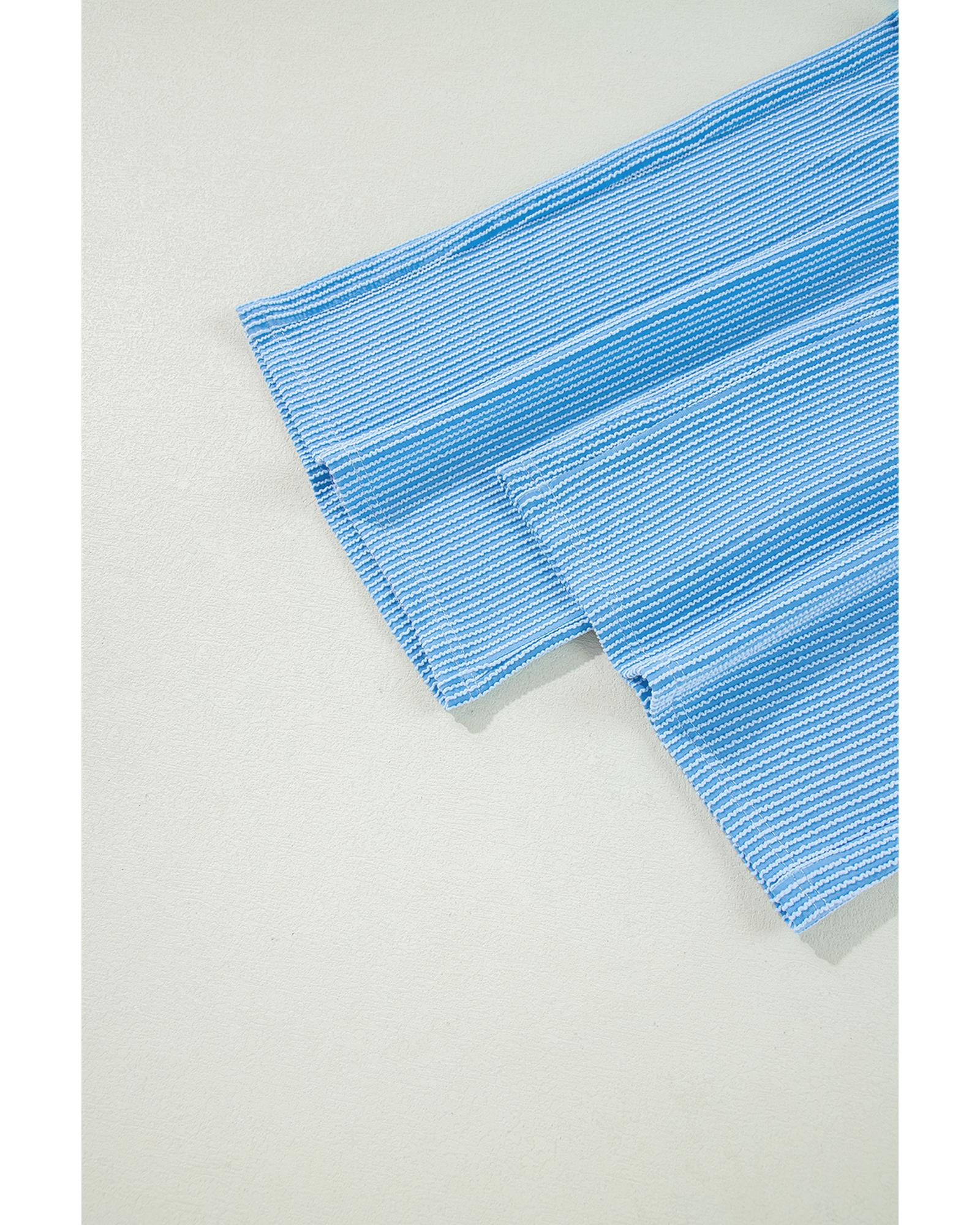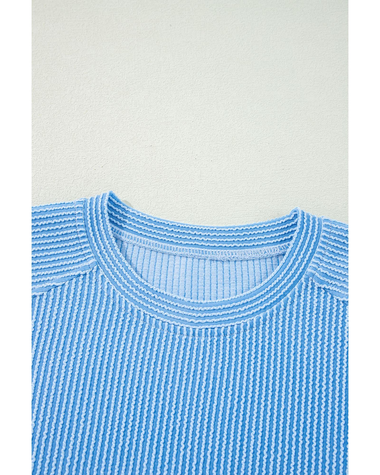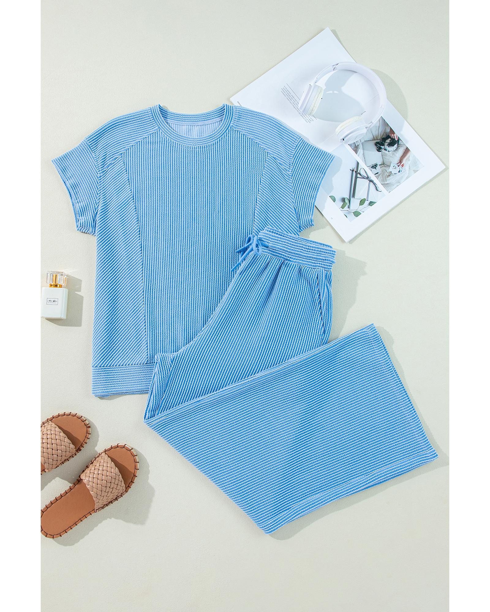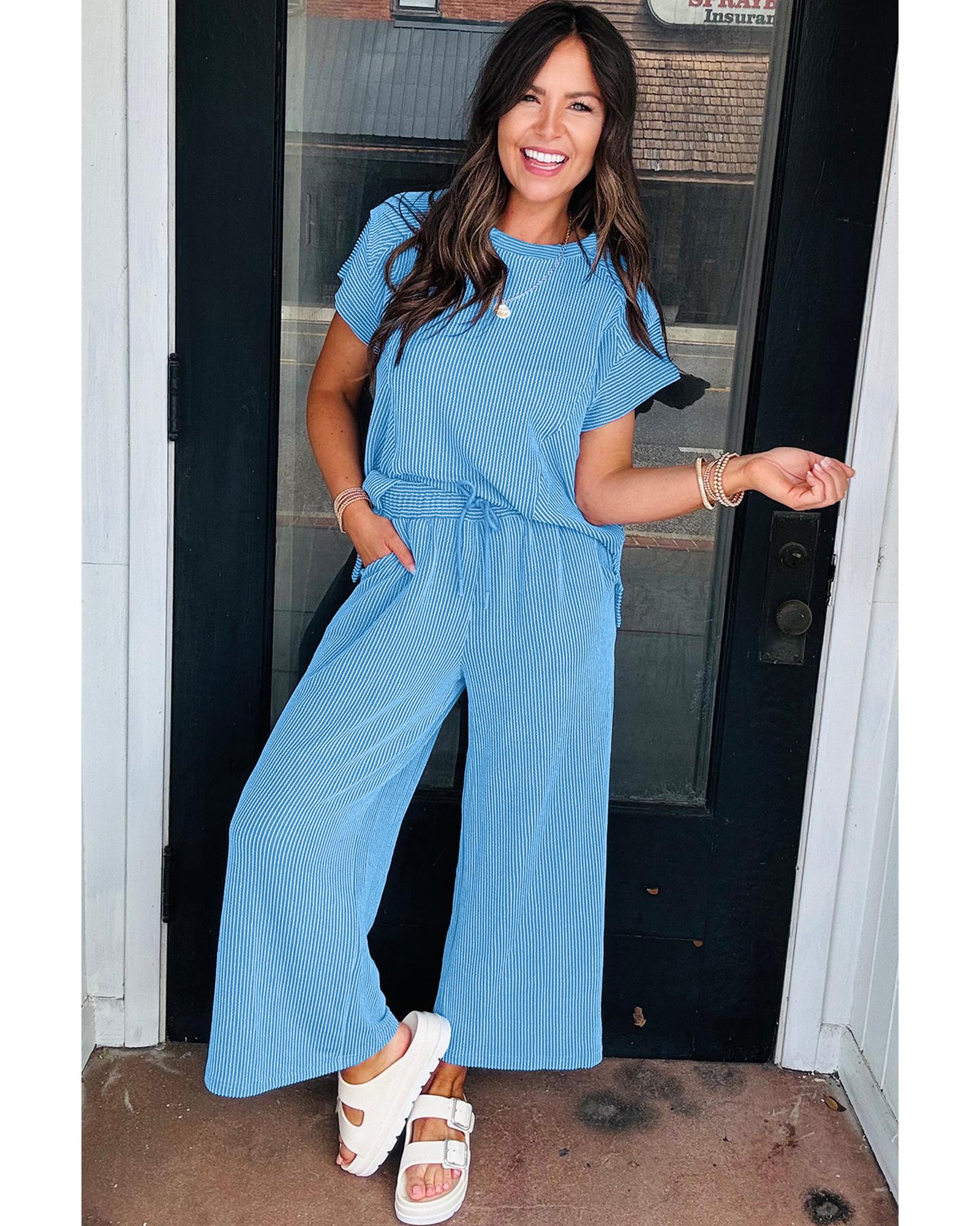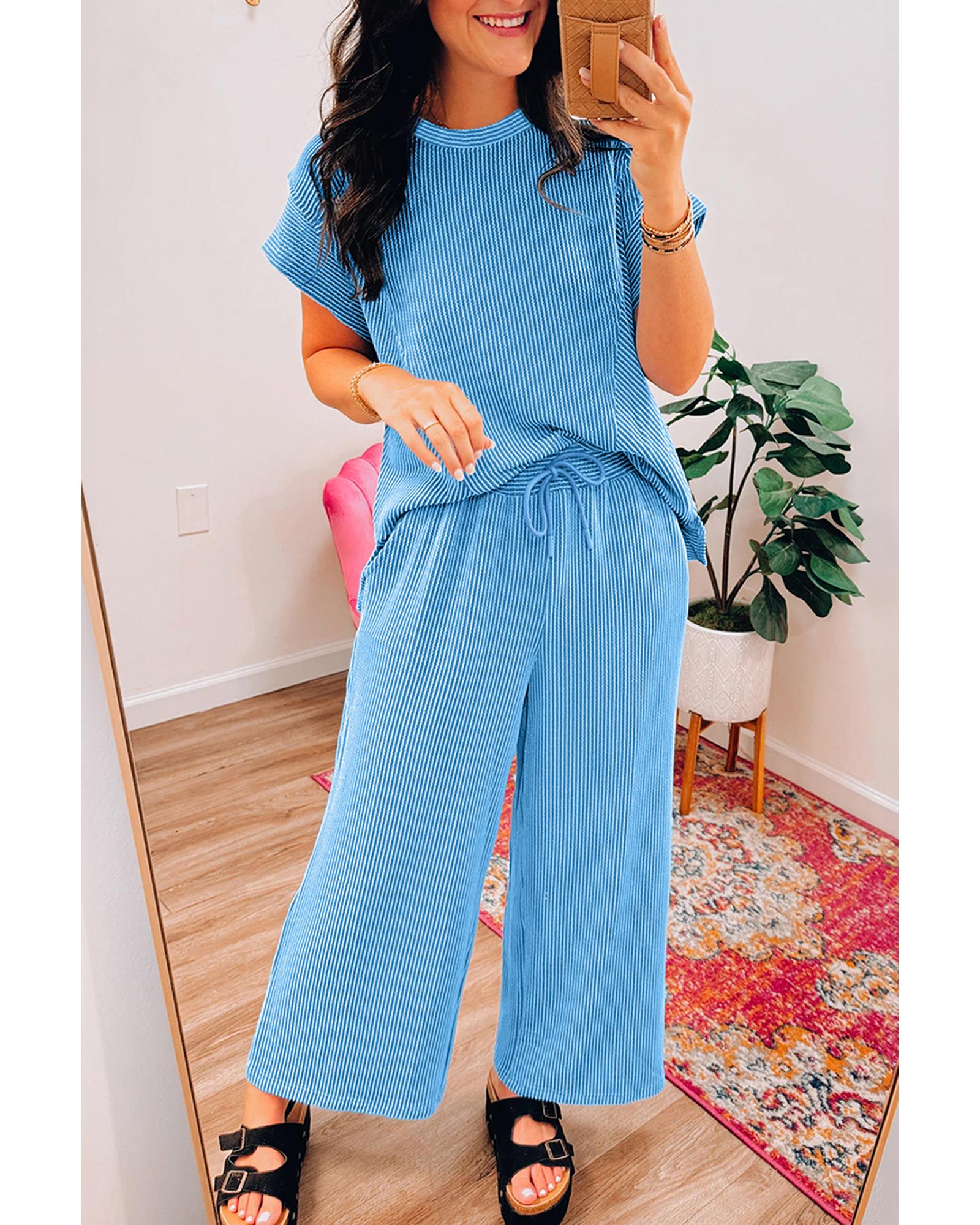 Blue Solid Corded Knit Short Sleeve T Shirt and Wide Leg Pants Set – XL