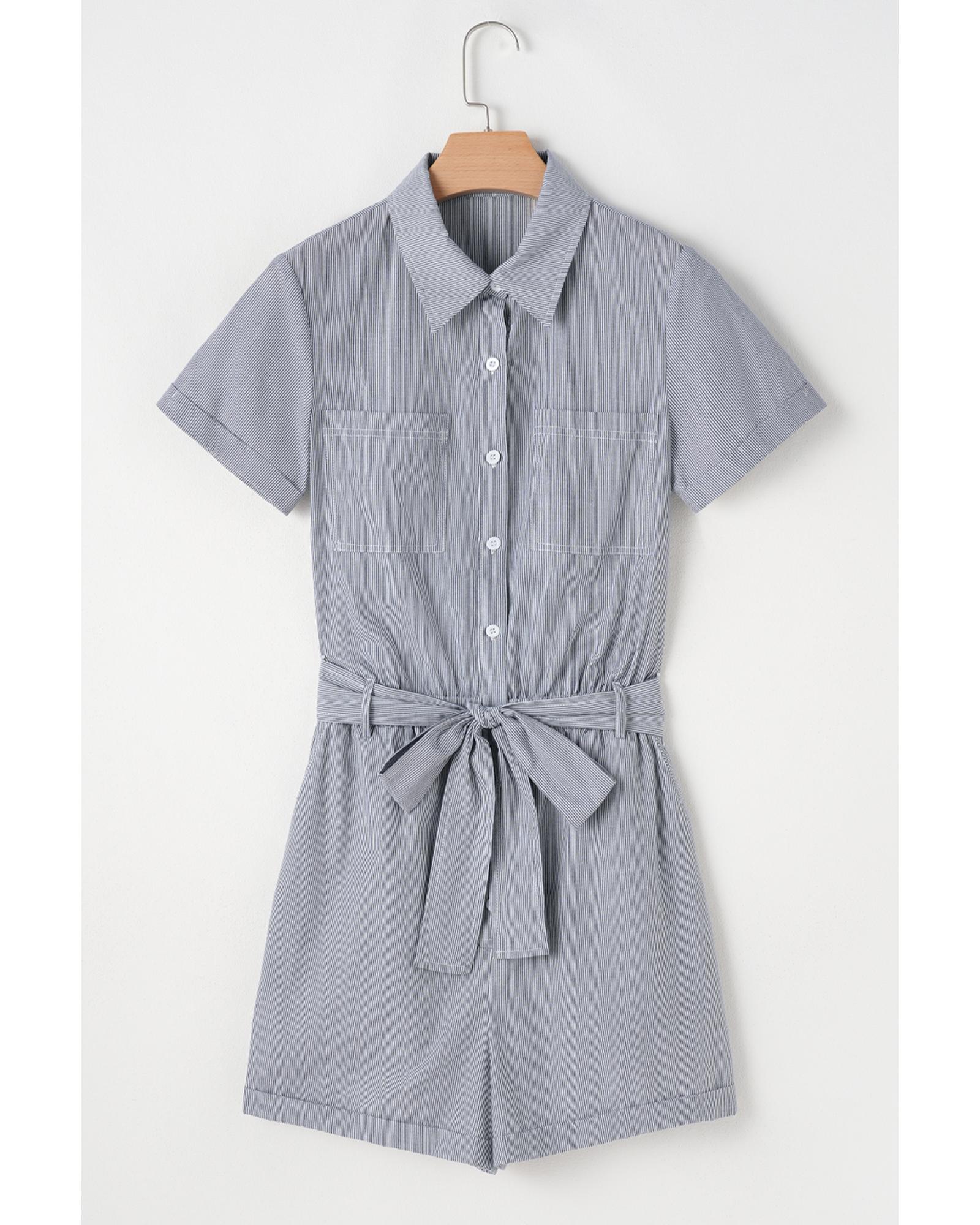Blue Stripe Chest Pockets Buttoned Belted High Waist Romper – XL