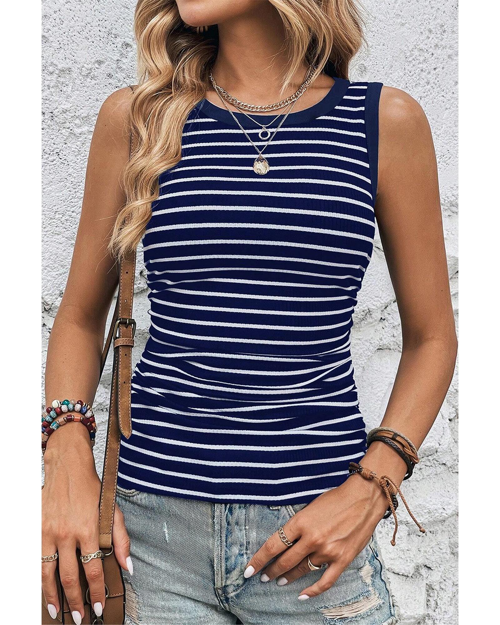 Blue Stripe Contrast Round Neck Sleeveless Slim Top – S