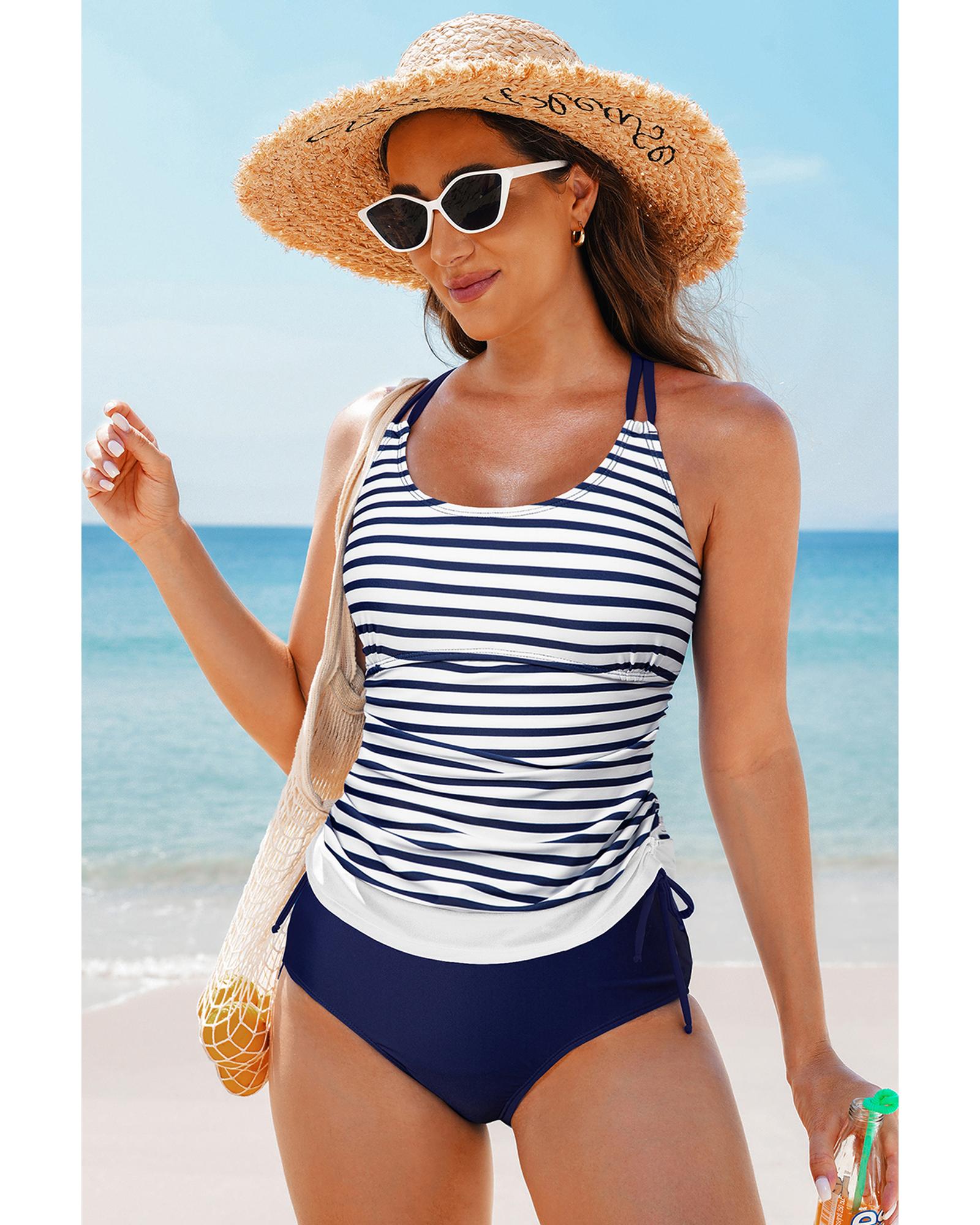 Blue Stripe Drawstring Tummy Control Mix-and-match 2pcs Tankini Swimsuit – S