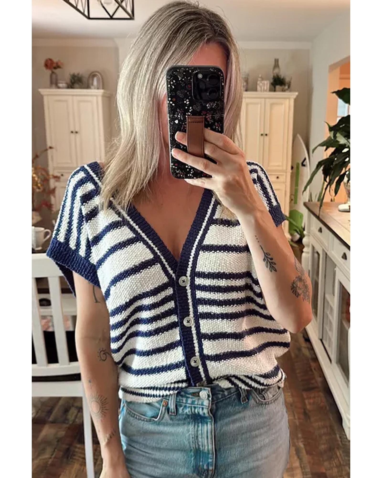 • Blue Stripe Loose Buttoned V Neck Sweater Vest