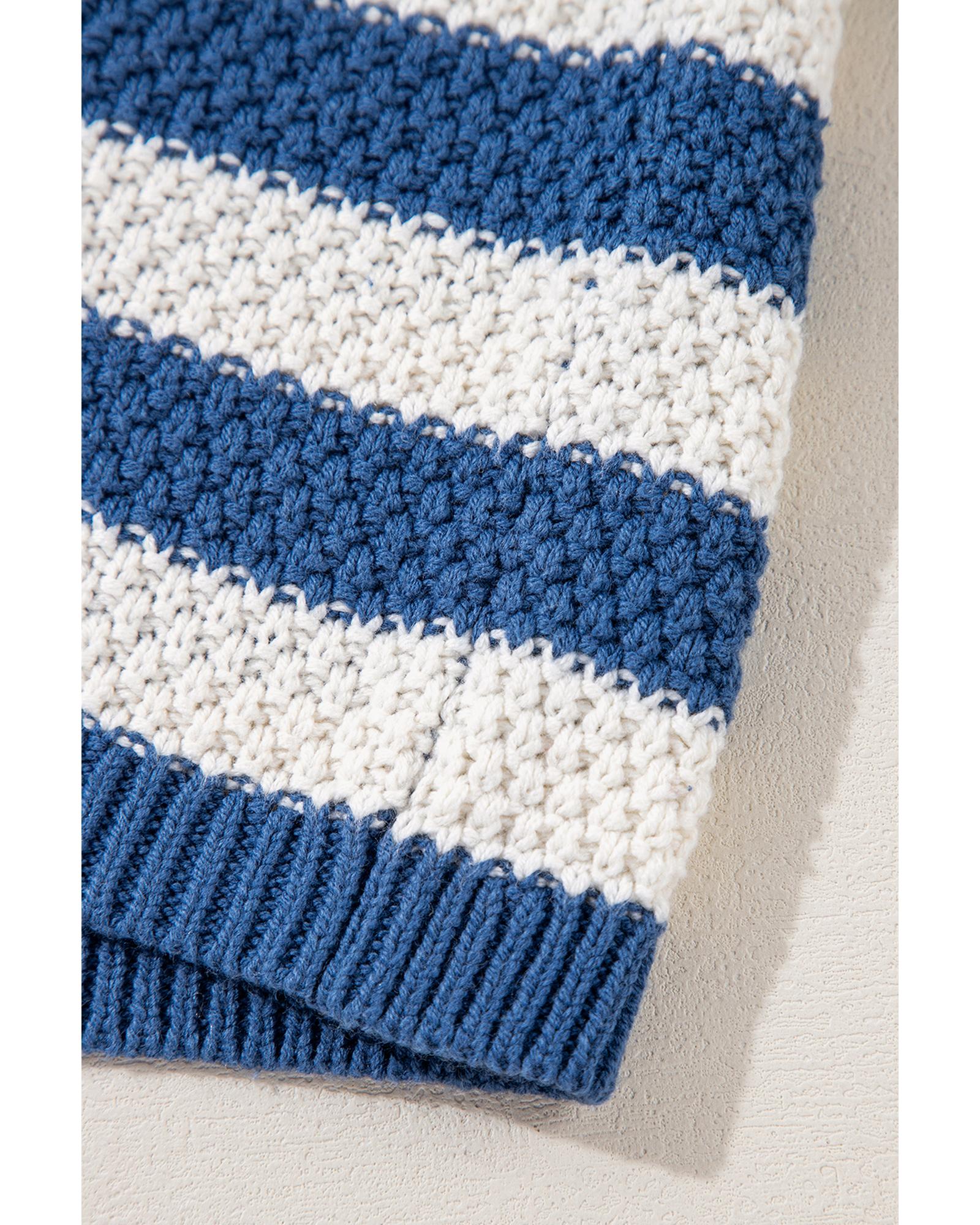 Blue Stripe V Neck Pocketed Drawstring Hooded Sweater – M