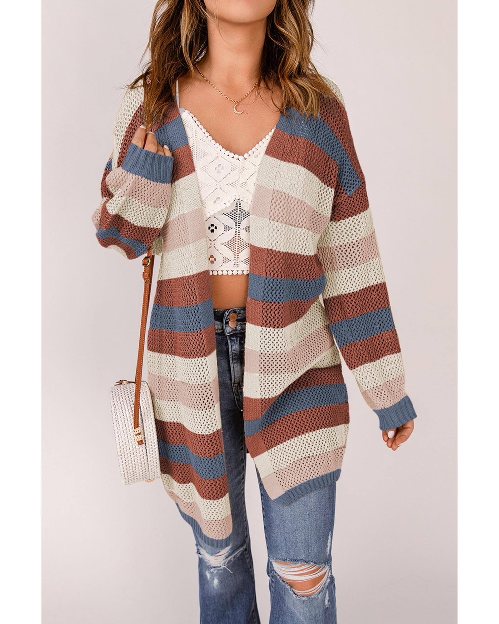 • Blue Striped Color Block Hollowed Knit Cardigan