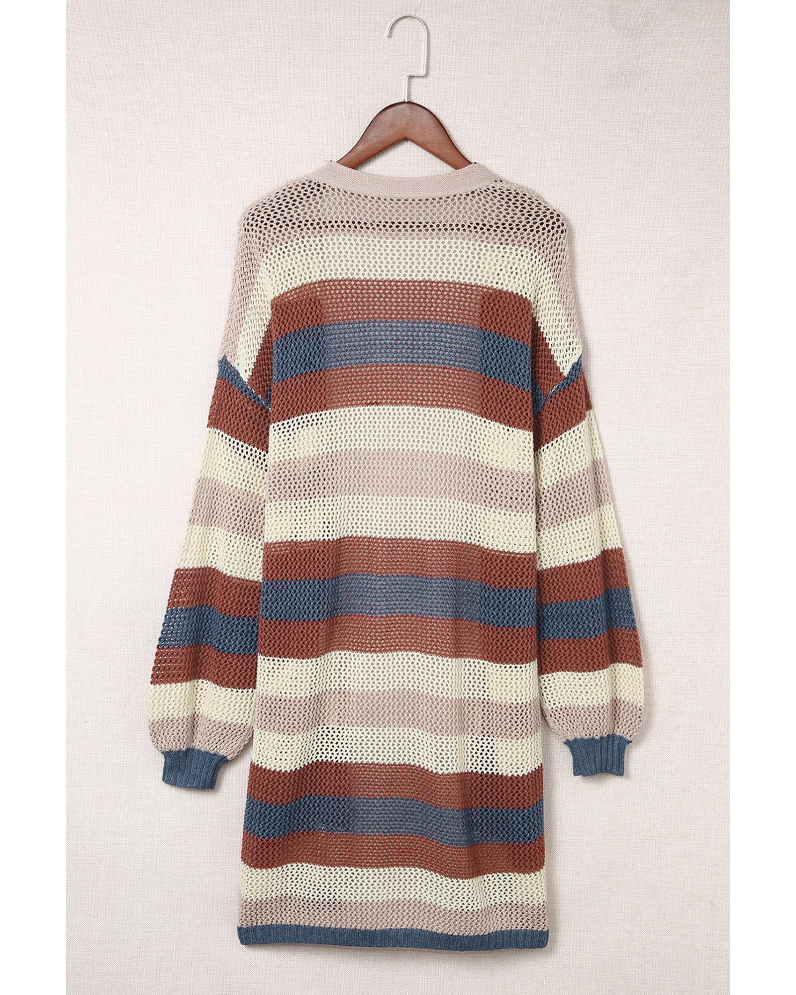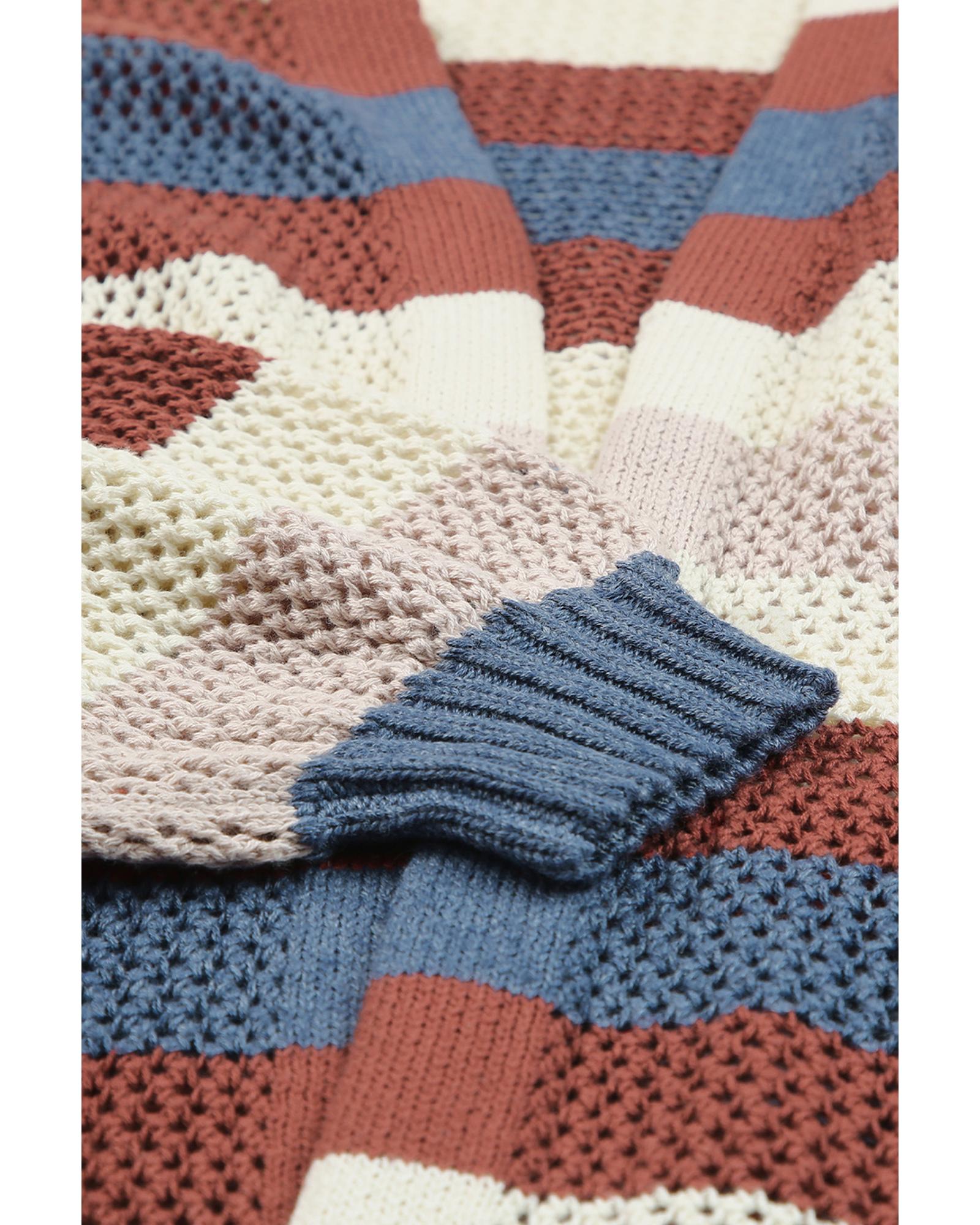 - Blue Striped Color Block Hollowed Knit Cardigan