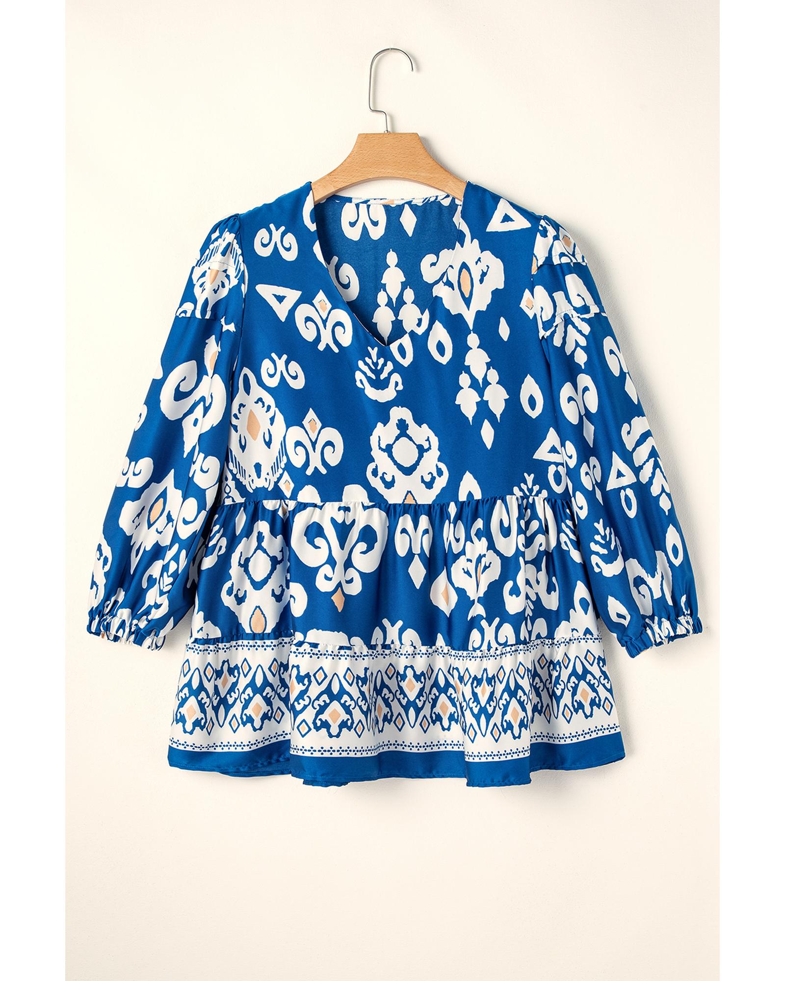 Blue Tribal Geometric Print 3/4 Sleeve Flowy Fit Blouse – S