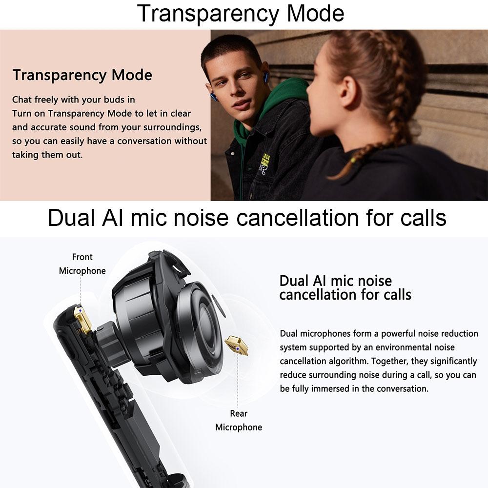 • Dual-microphone call noise reduction and AI intelligent wind noise recognition for clear calls