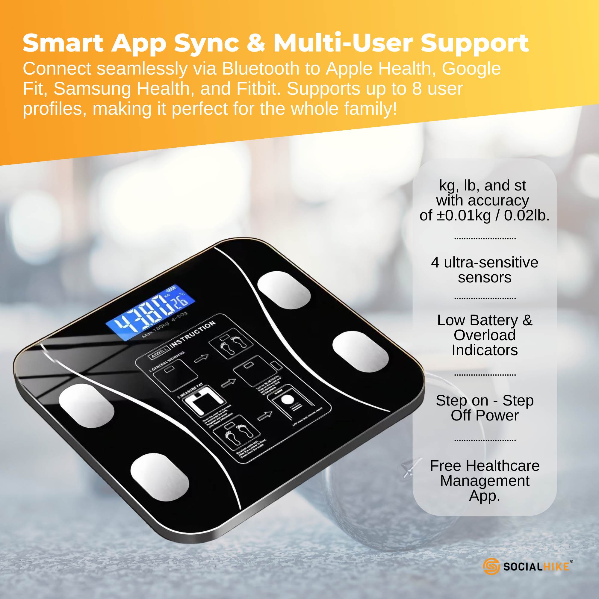 Track your families progress by connecting this scale to the free healthcare management app to record and analyse weight management, health indices, weight trends, family health, lifestyle advice. Download the app through the App Store or Google Play.