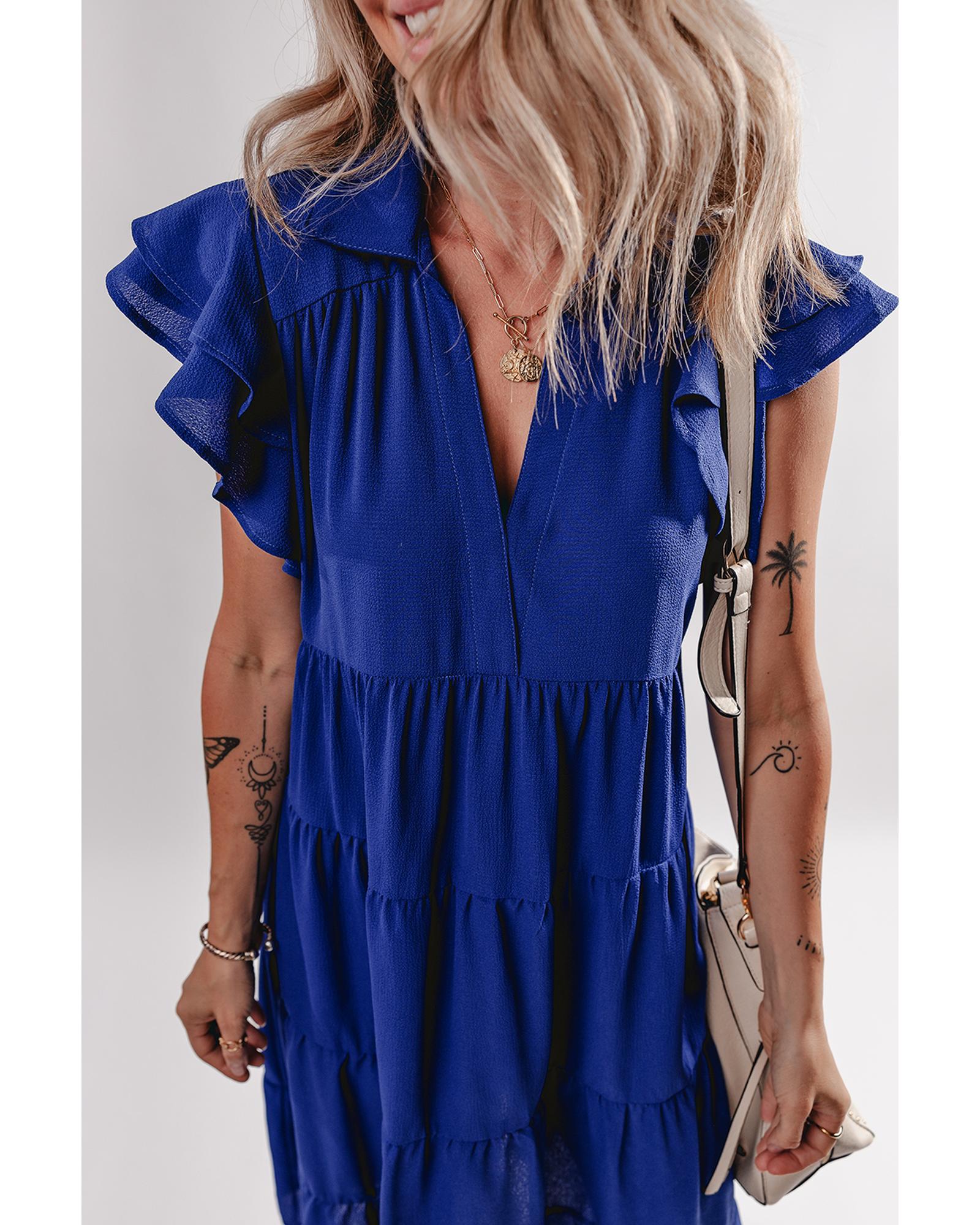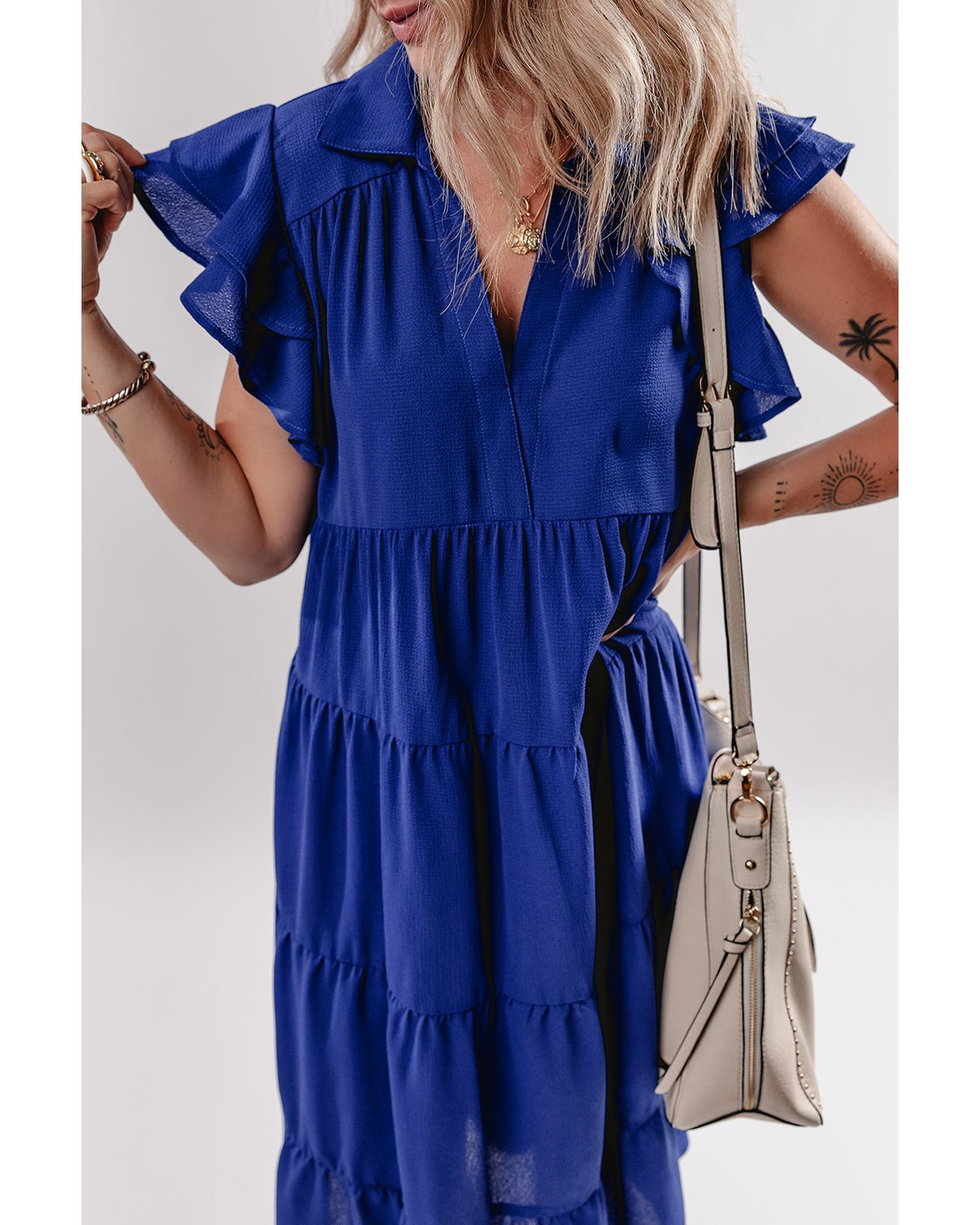 Bluing Ruffled Short Sleeve Collared V Neck Tiered Midi Dress – L