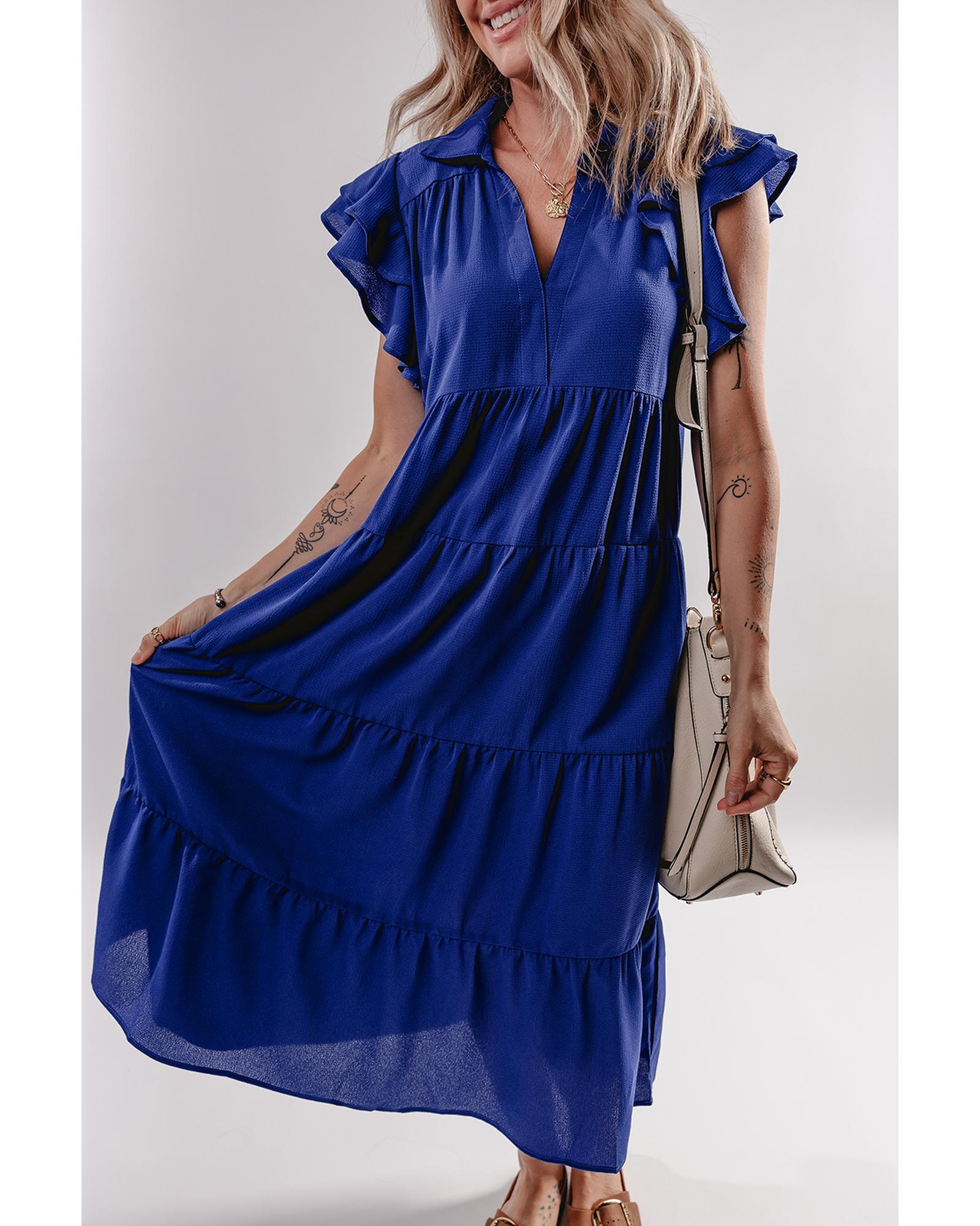 Bluing Ruffled Short Sleeve Collared V Neck Tiered Midi Dress – XL