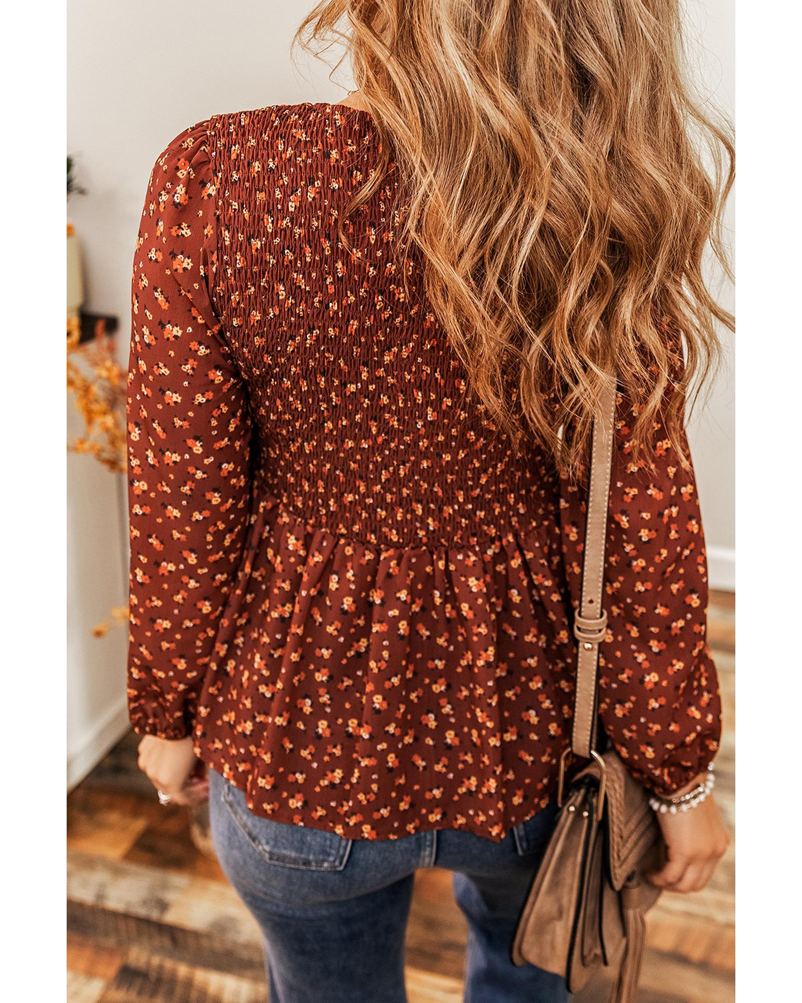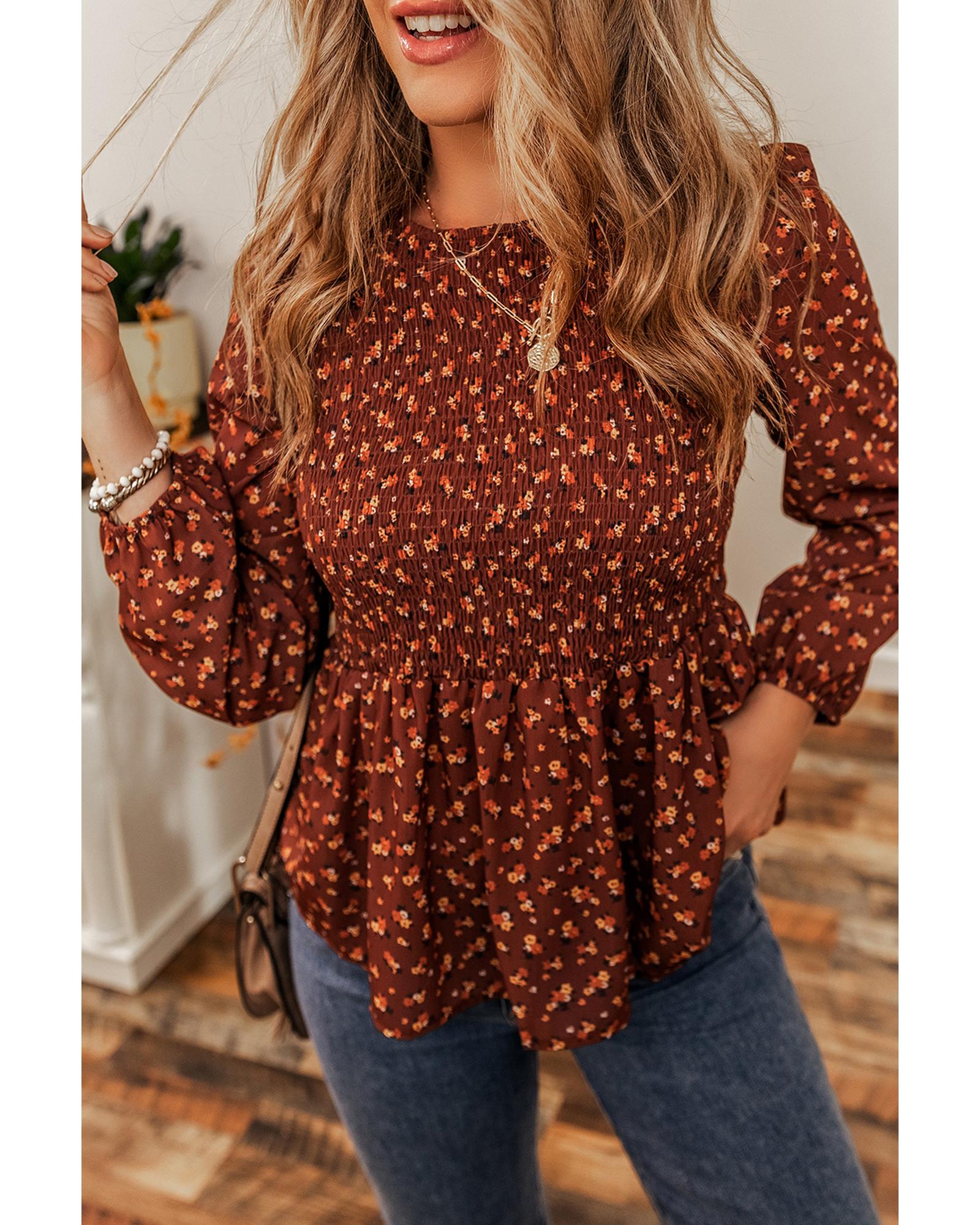• Boho floral smocked bust ruffled peplum blouse