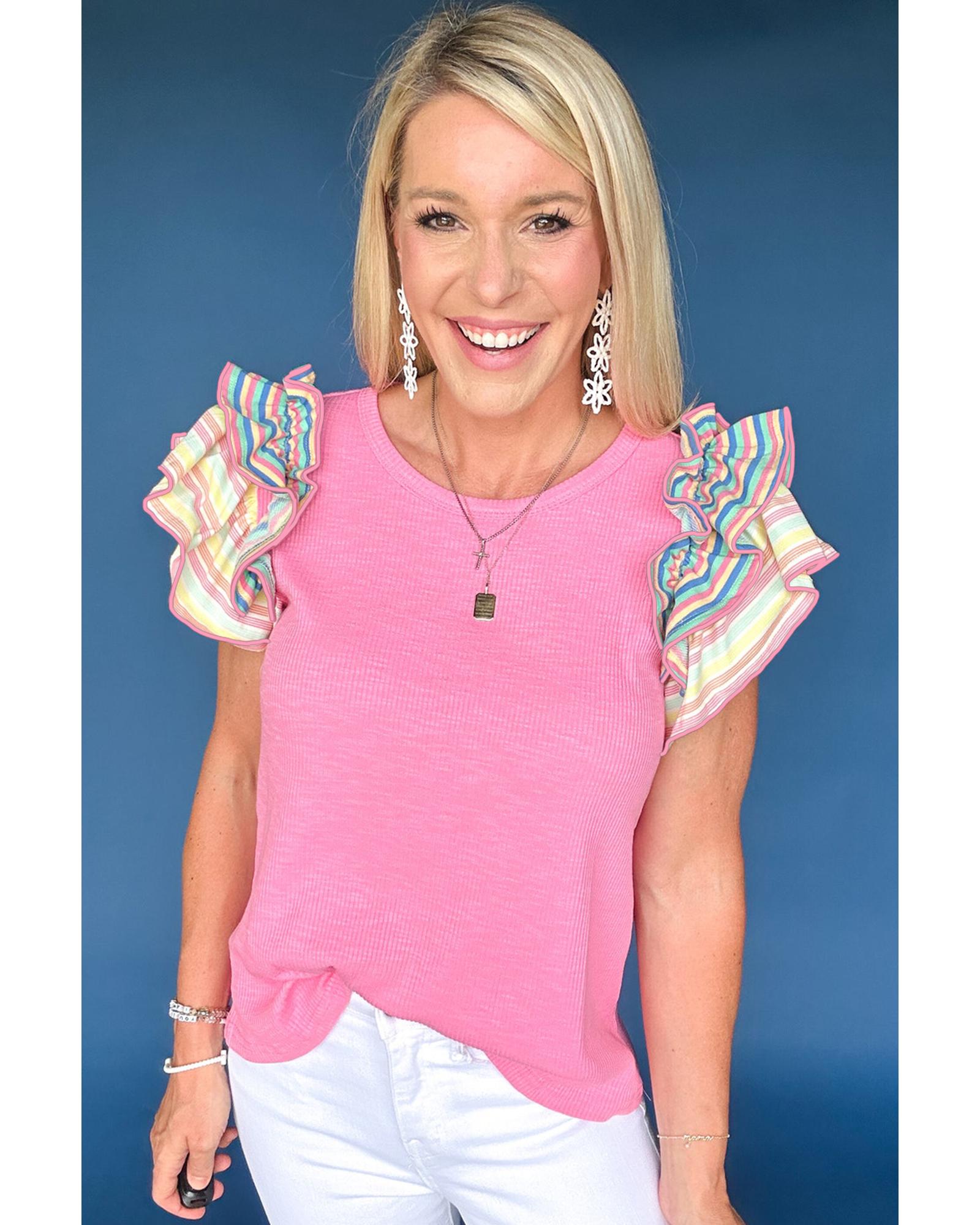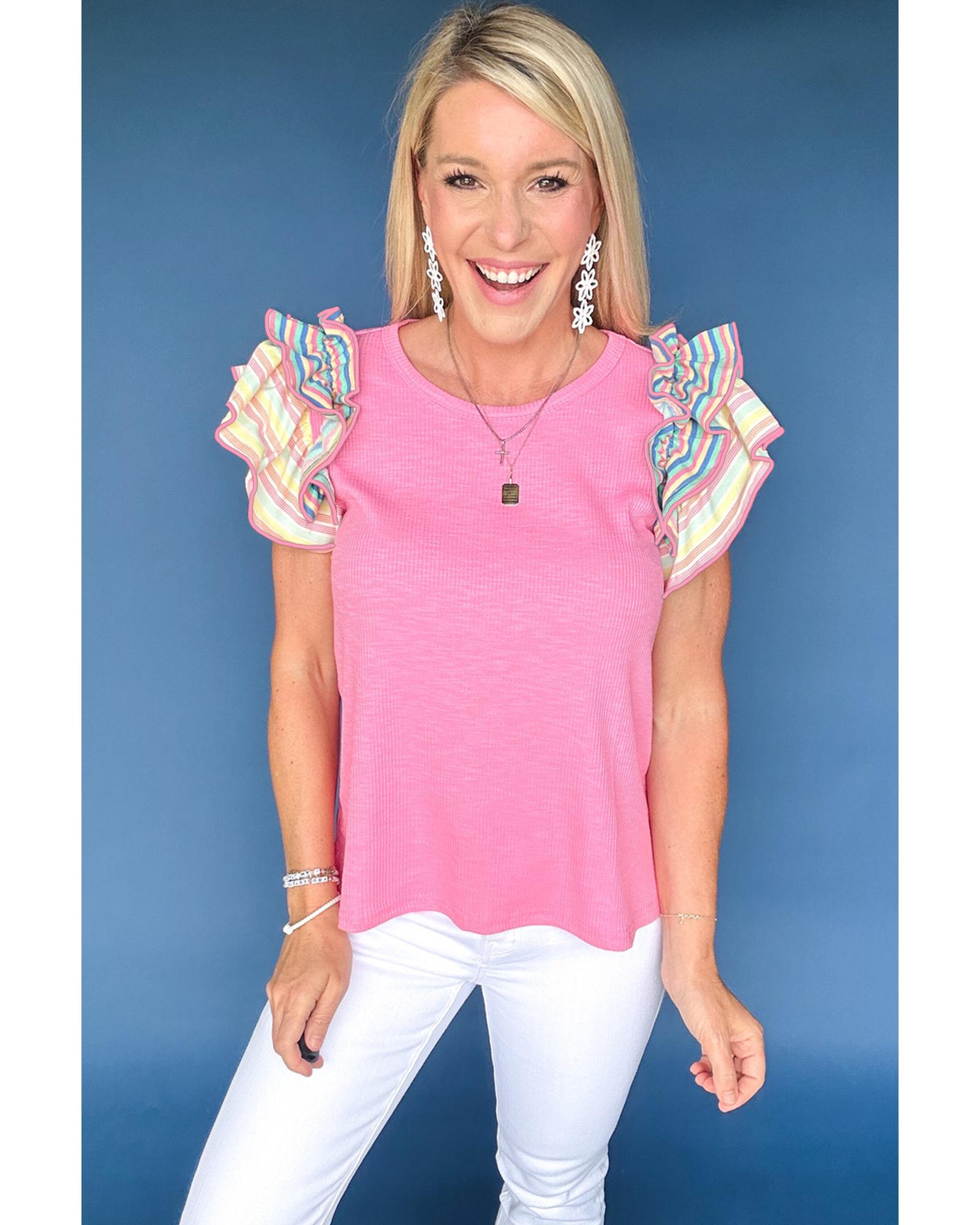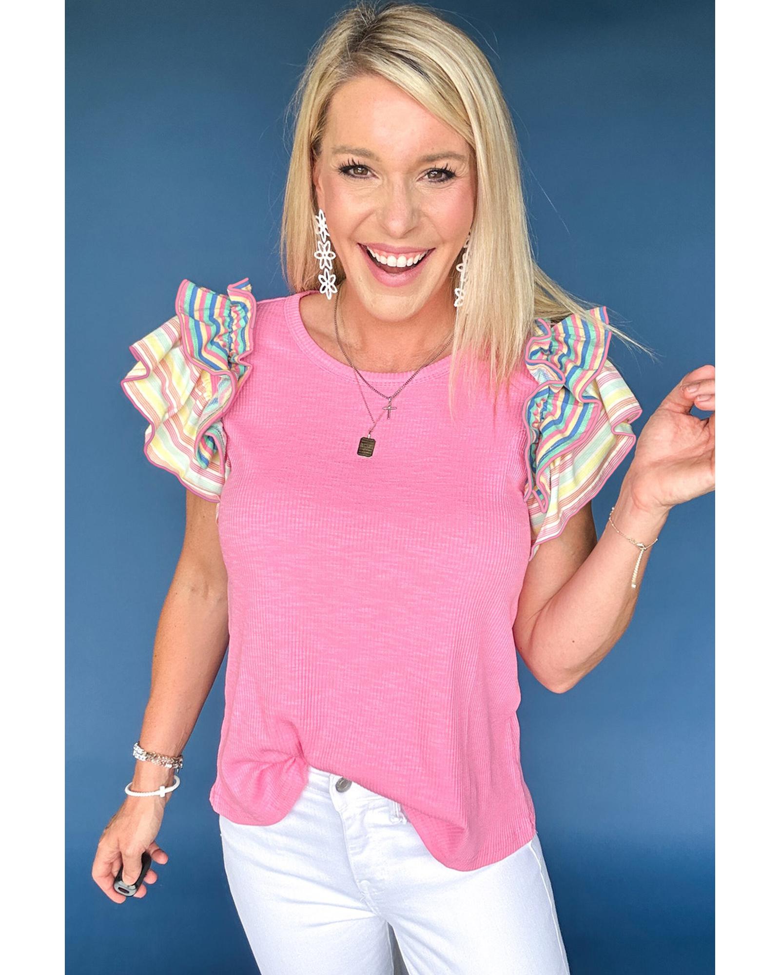 Bonbon Striped Ruffle Flutter Sleeve Ribbed Blouse – S