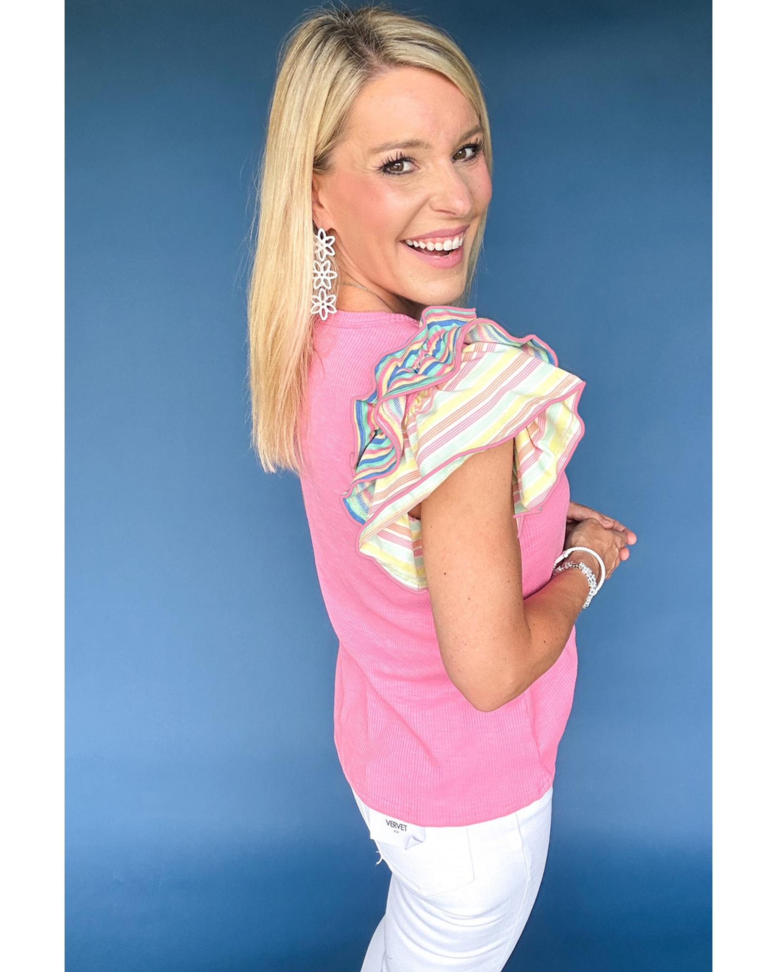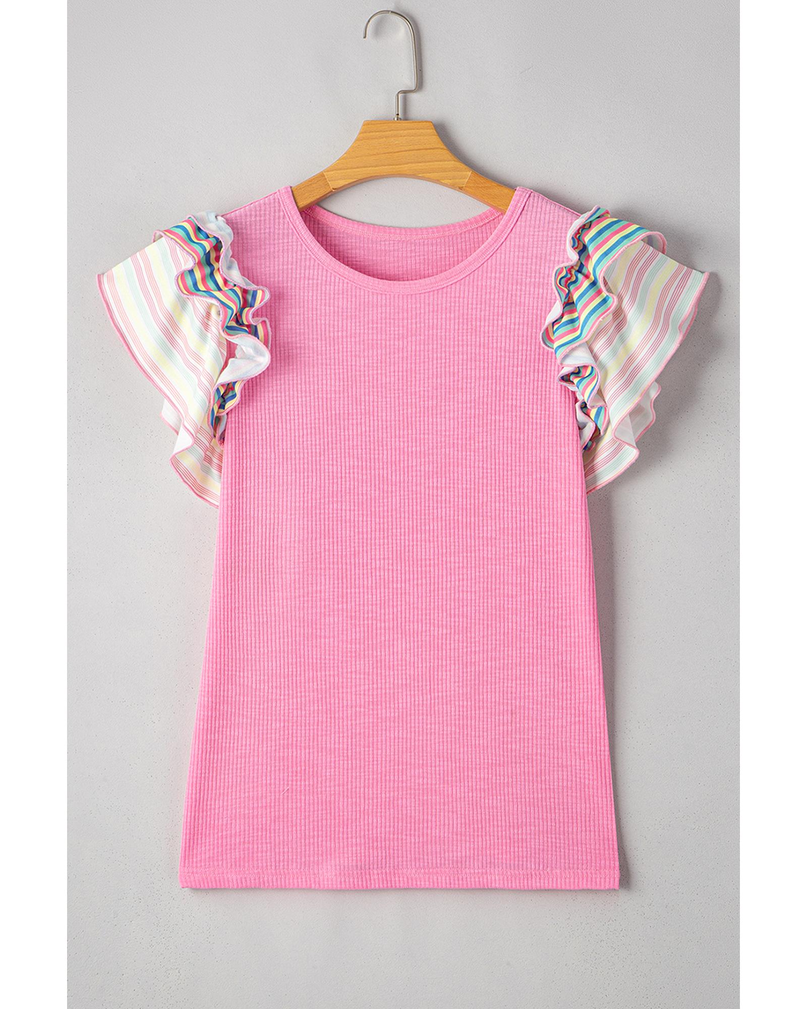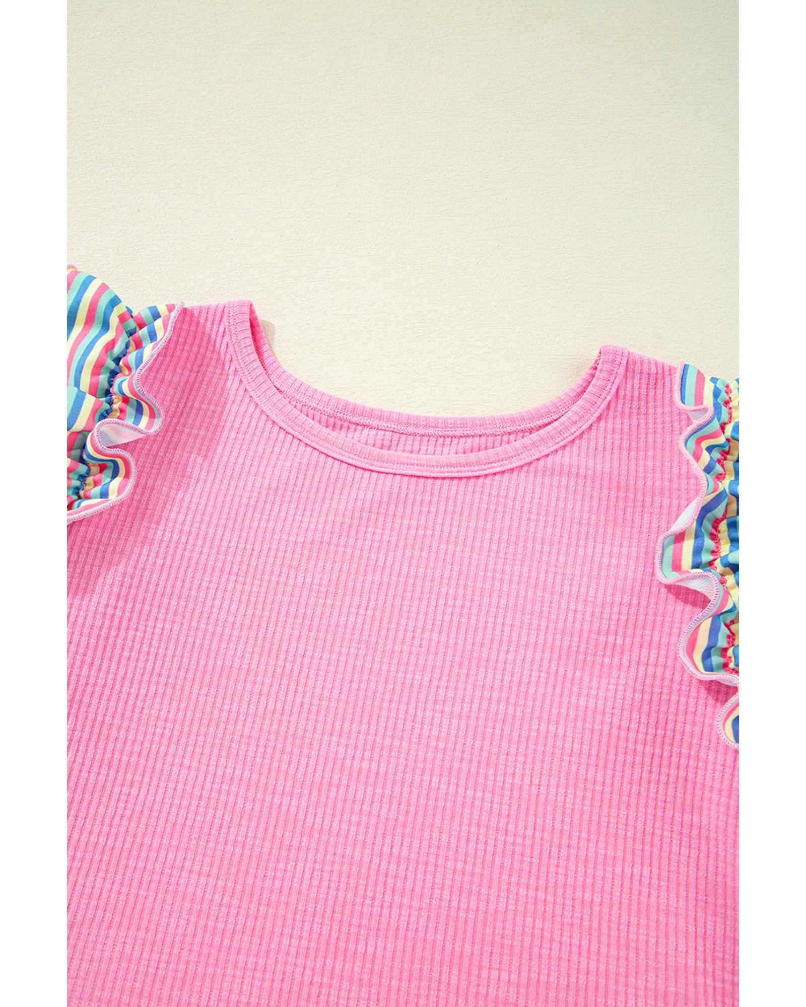 Bonbon Striped Ruffle Flutter Sleeve Ribbed Blouse – S