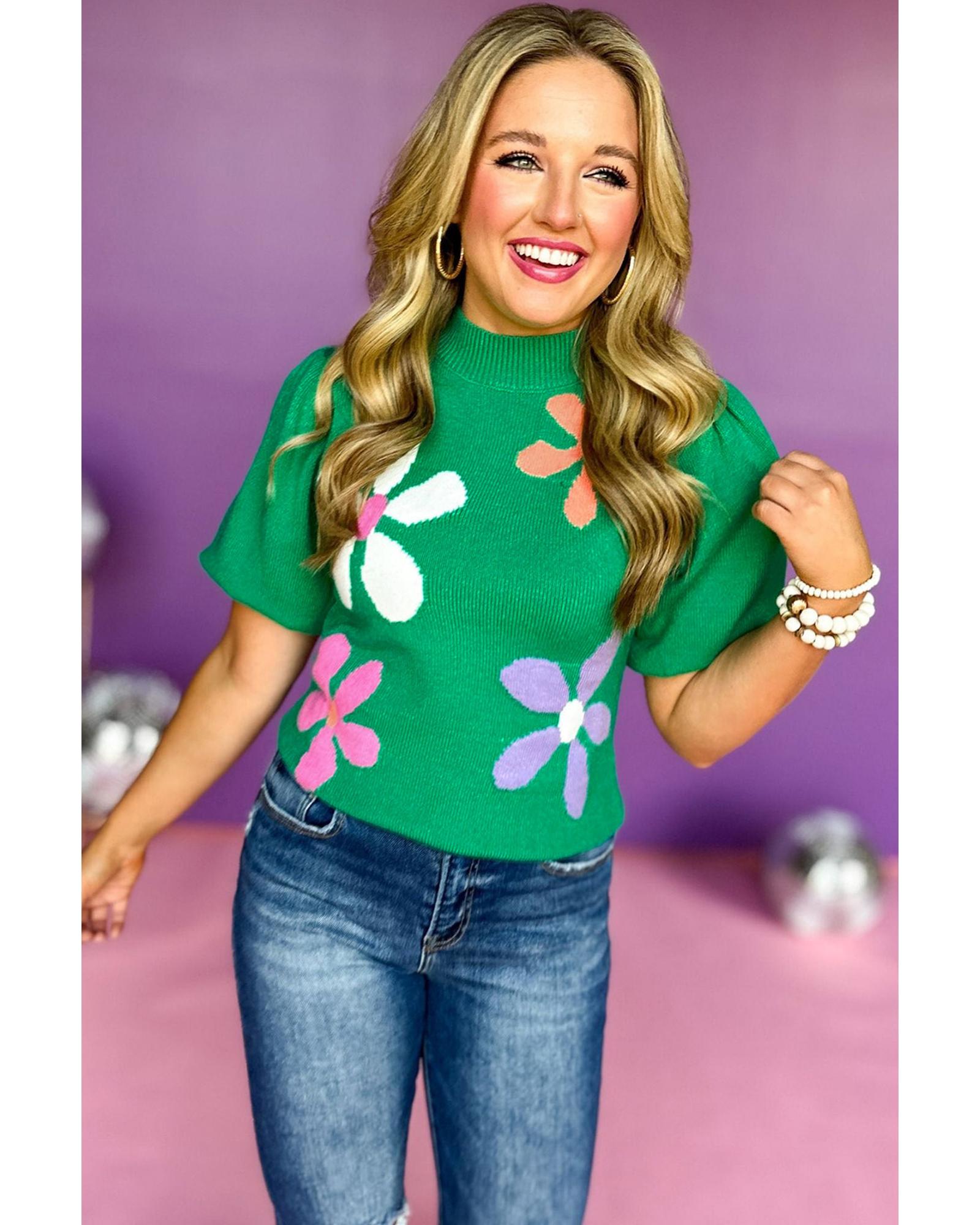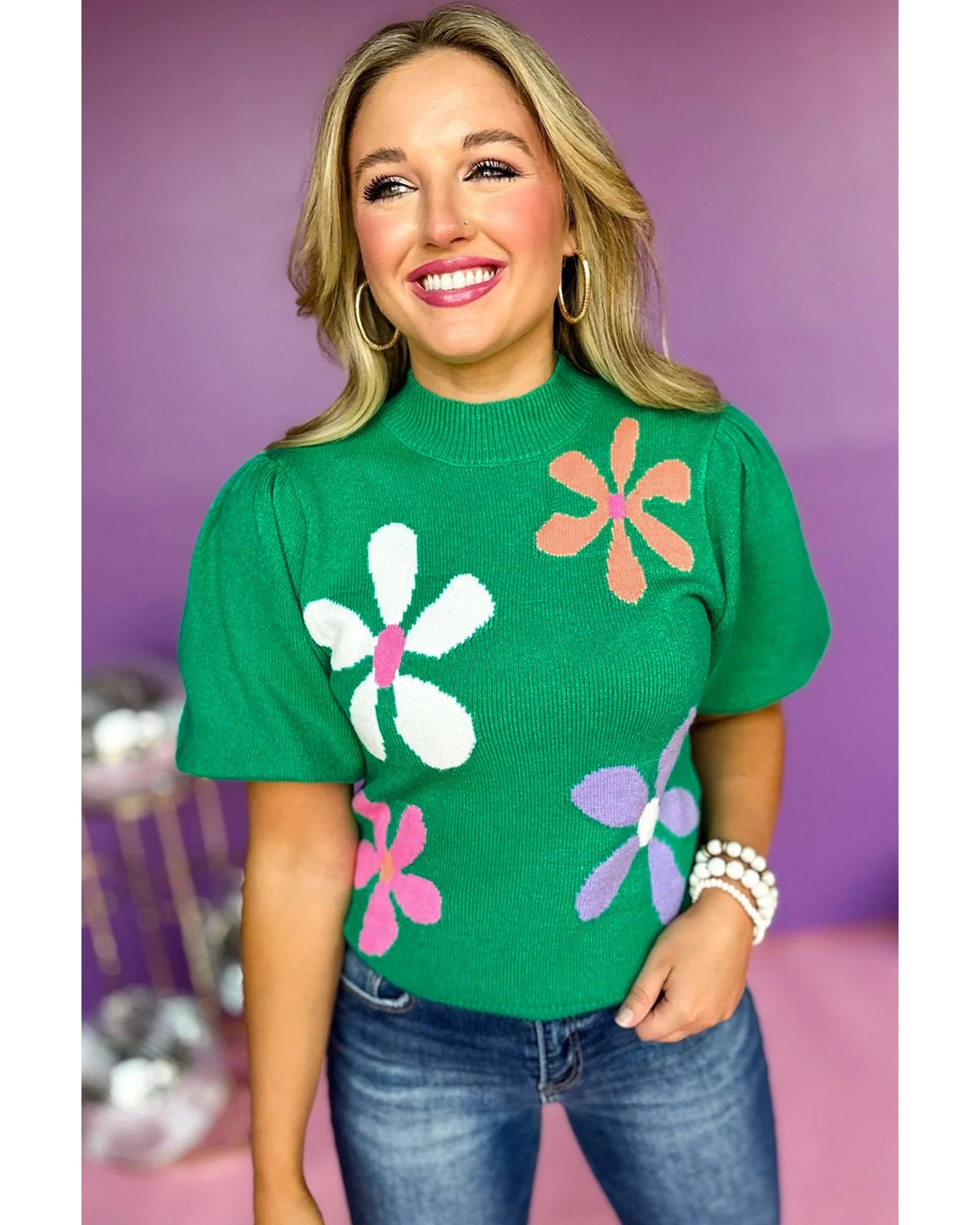 - Bright green floral bubble short sleeve sweater