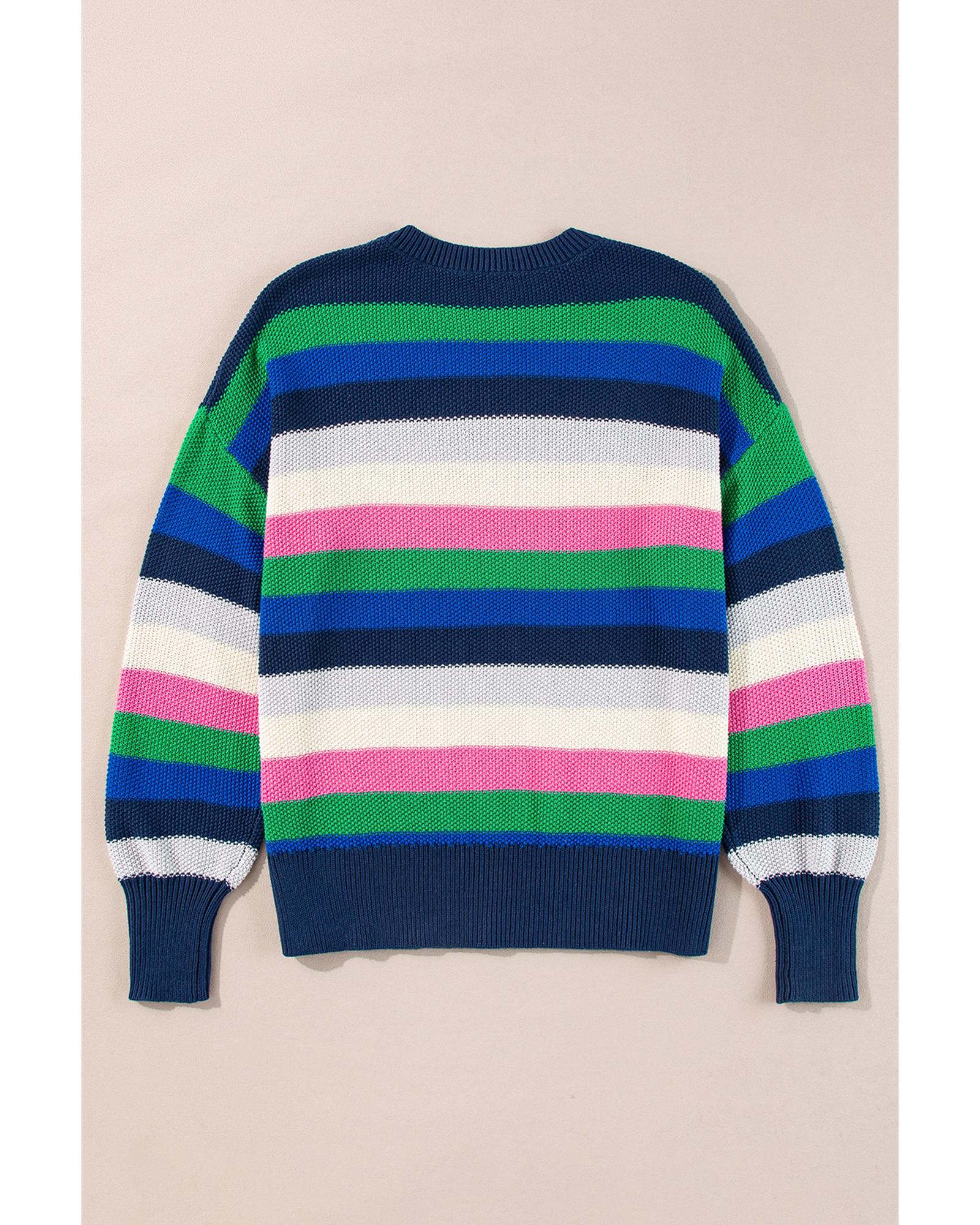 Bright Green Rainbow Striped Crew Neck Drop Shoulder Sweater – S