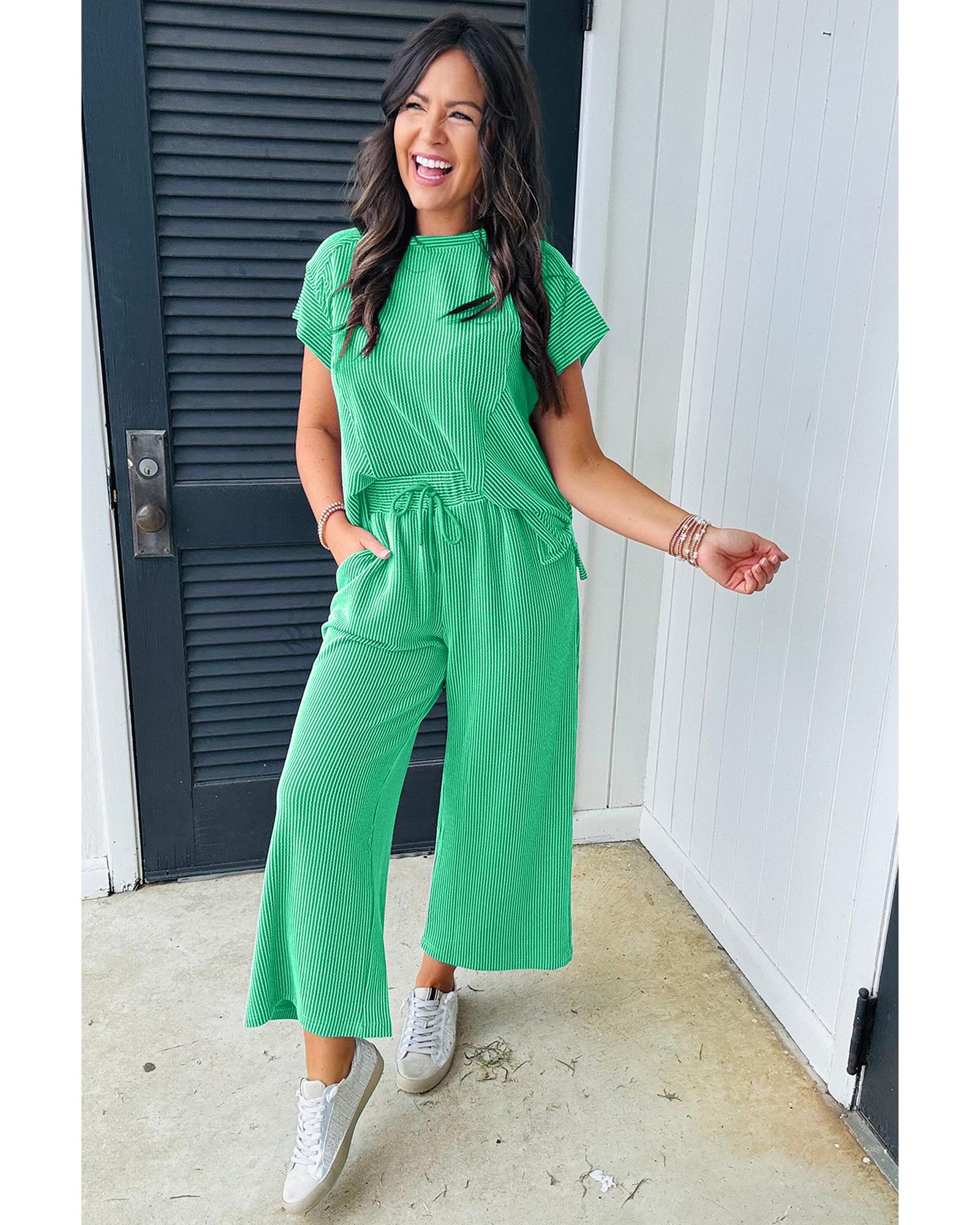 Bright Green Solid Corded Knit Short Sleeve T Shirt and Wide Leg Pants Set - XL Original price was: $81.99.Current price is: $44.99.