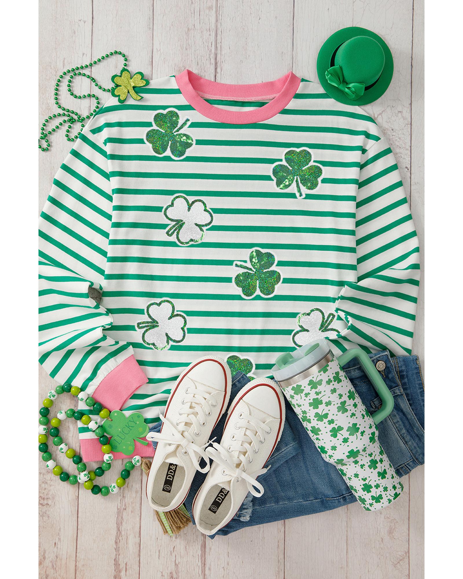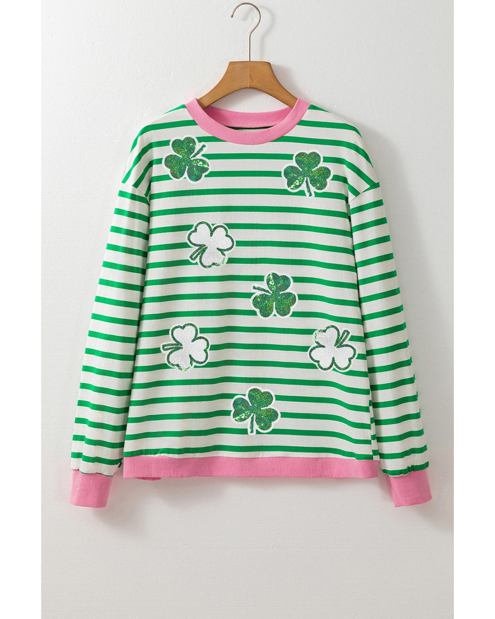Bright Green Striped Sequin Clover Graphic Colorblock Long Sleeve St Patrick Top – L