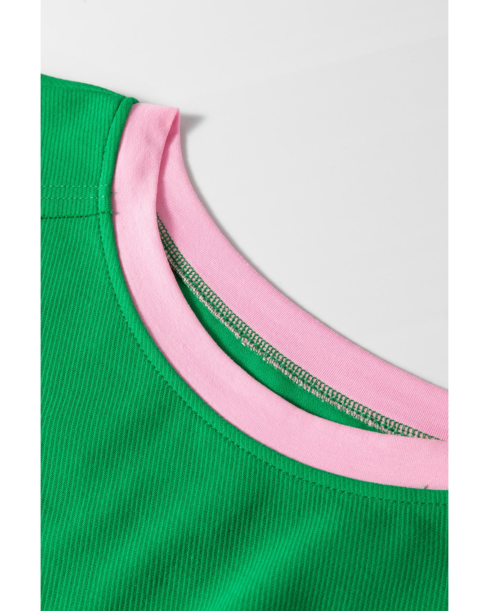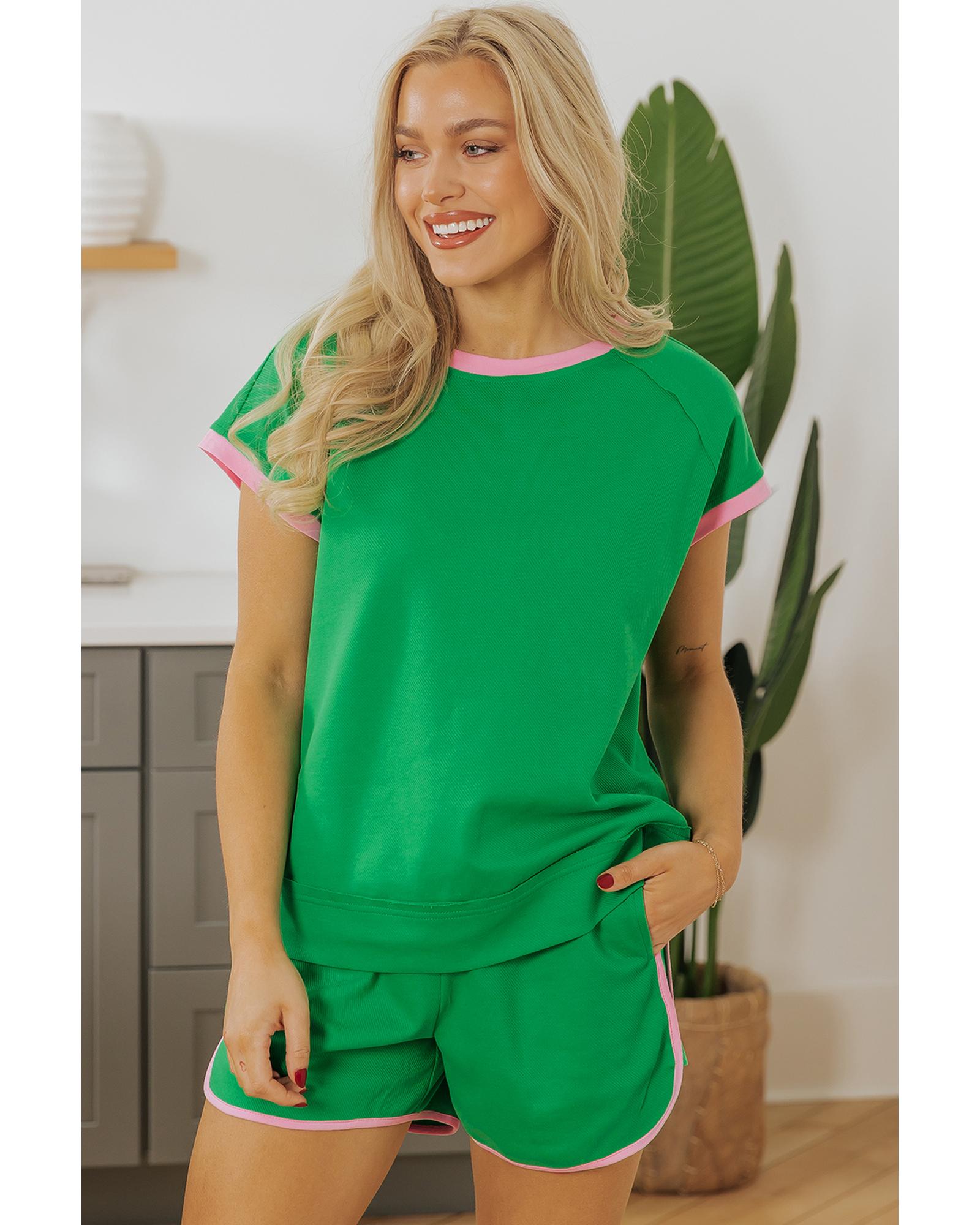 - Bright Green Two Tone Contrast Textured Crewneck Tee and Shorts Set