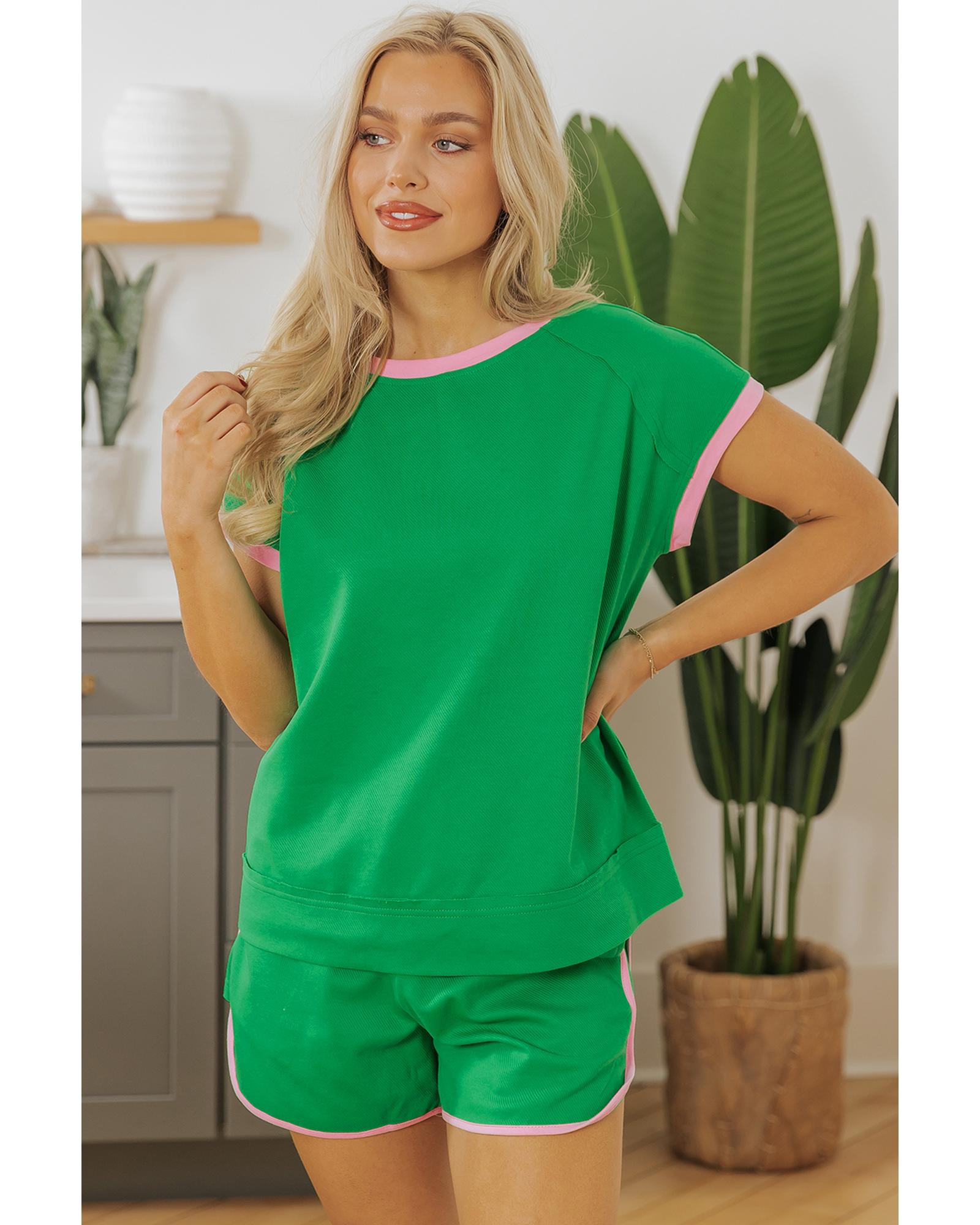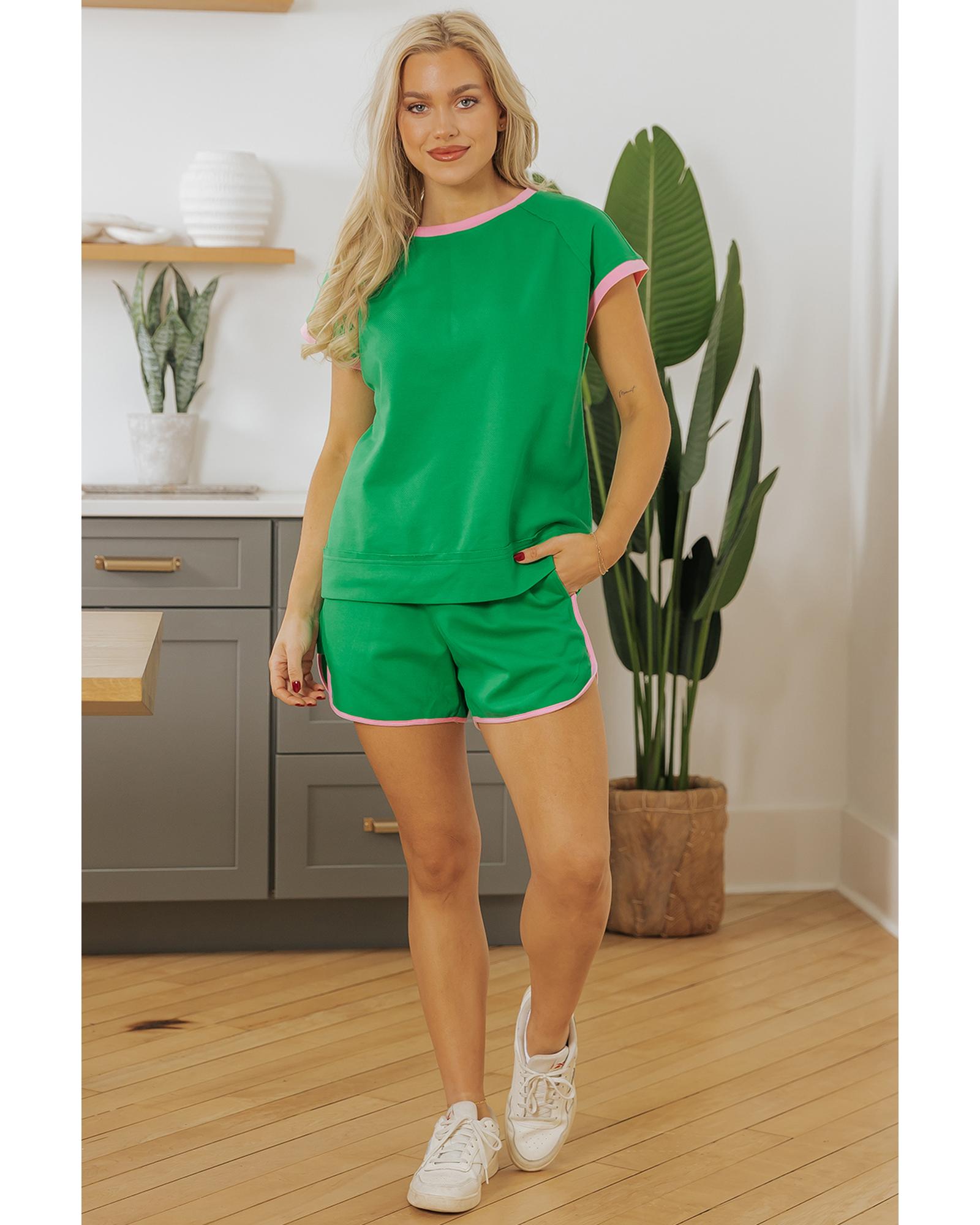 - Bright Green Two Tone Contrast Textured Crewneck Tee and Shorts Set
