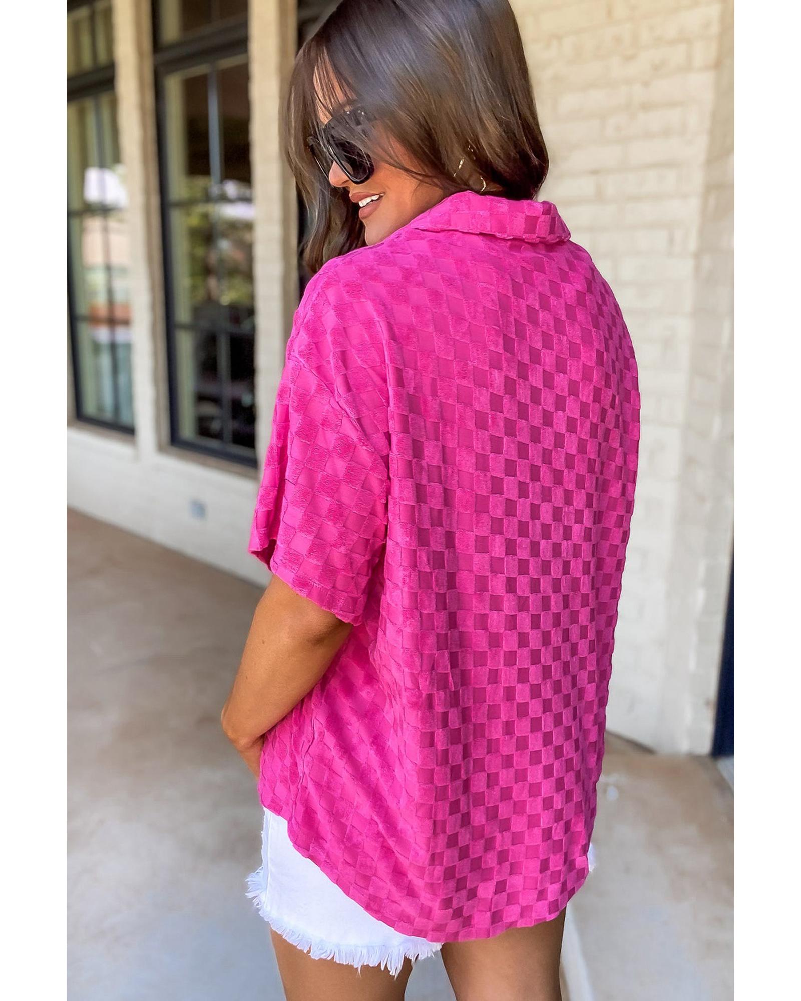 - Bright Pink Lapel Neck Checkered Textured Short Sleeve Shirt