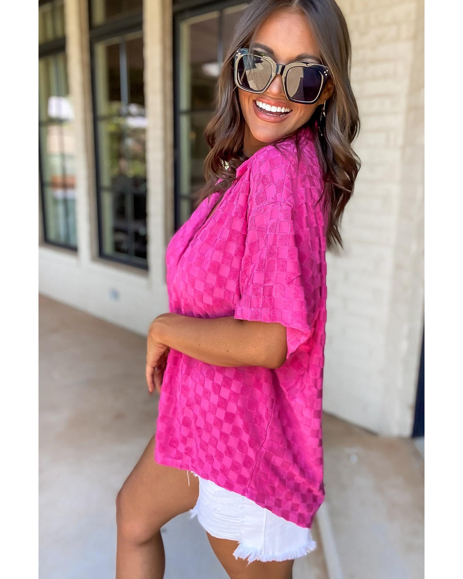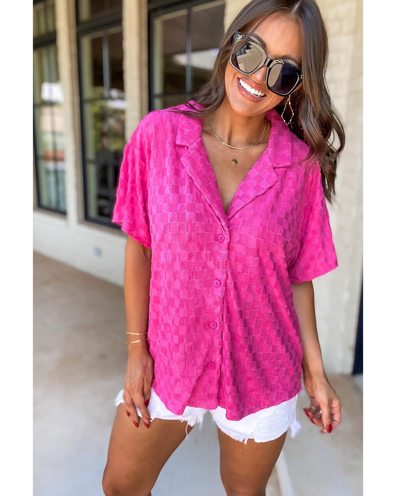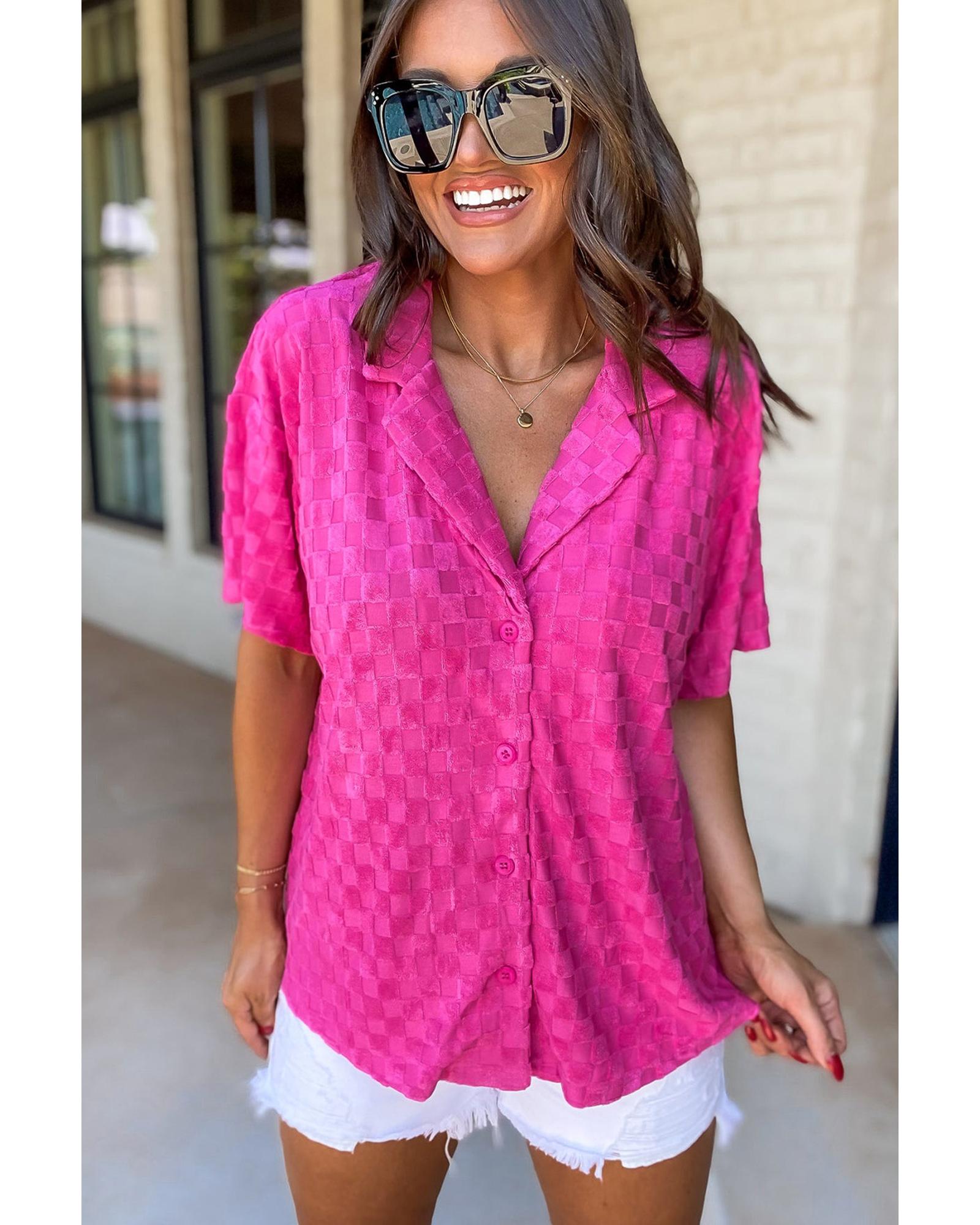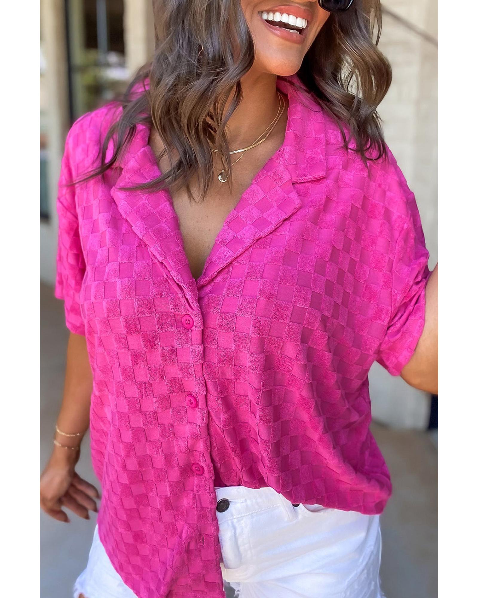- Bright Pink Lapel Neck Checkered Textured Short Sleeve Shirt