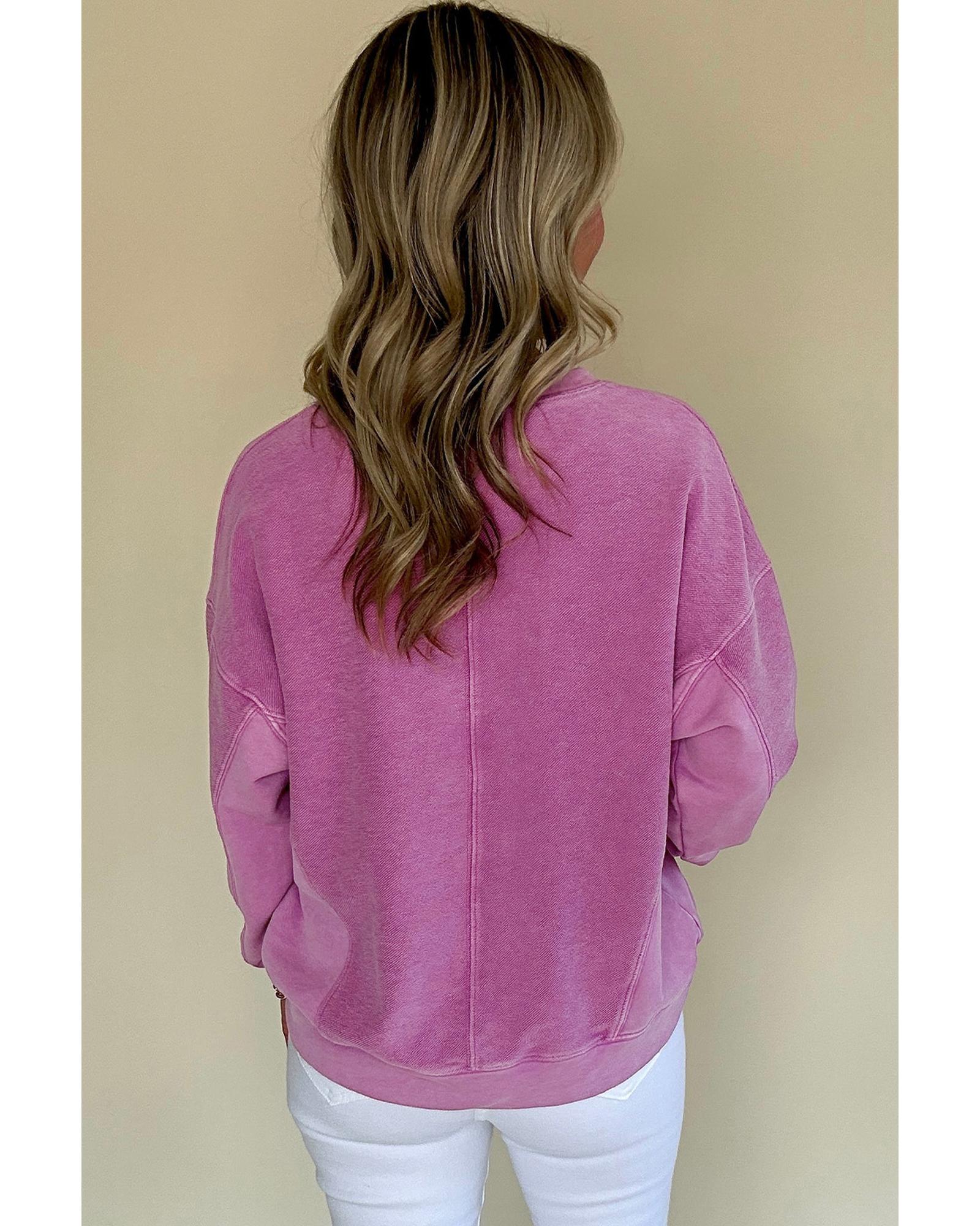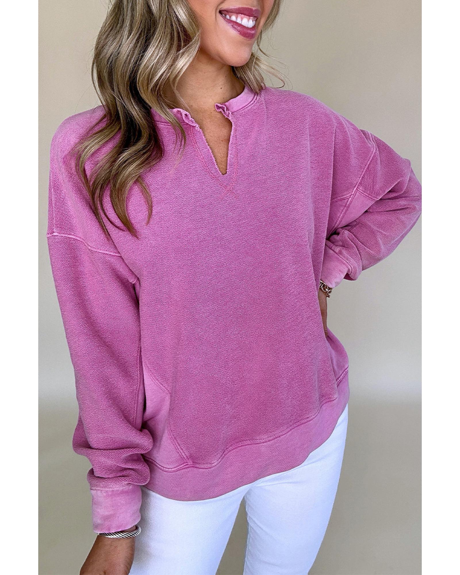 Bright Pink Solid Color Notched Neck Drop Shoulder Sweatshirt – S