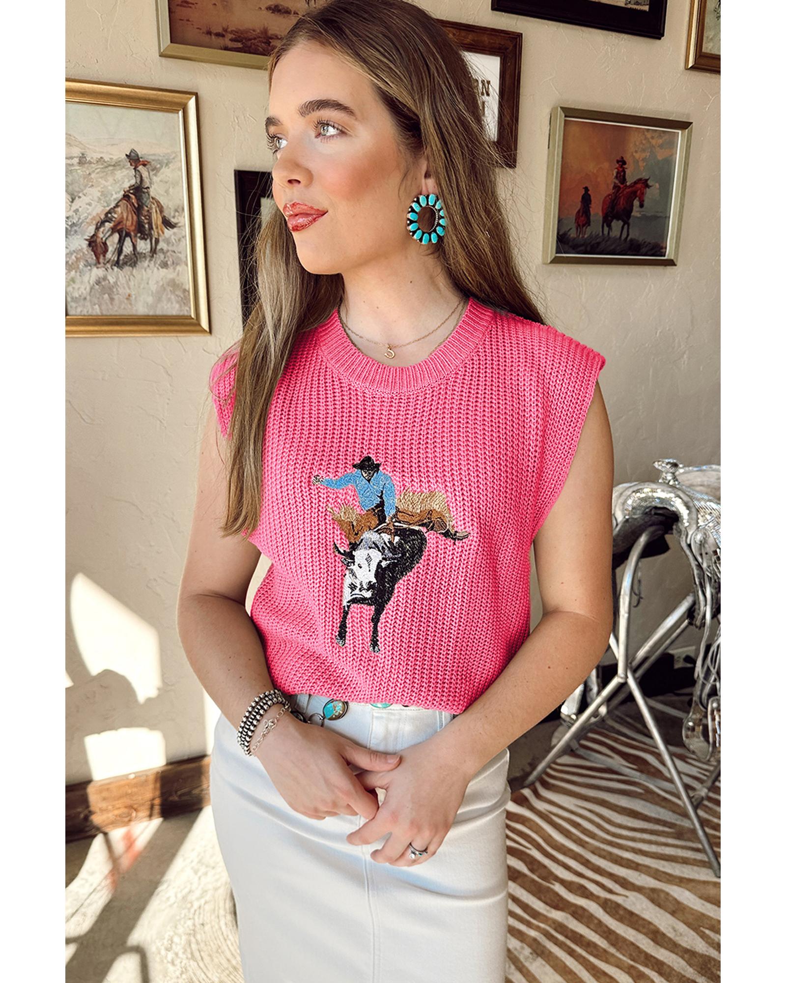 Bright Pink Western Cowboy Embroidery Round Neck Sleeveless Sweater – M