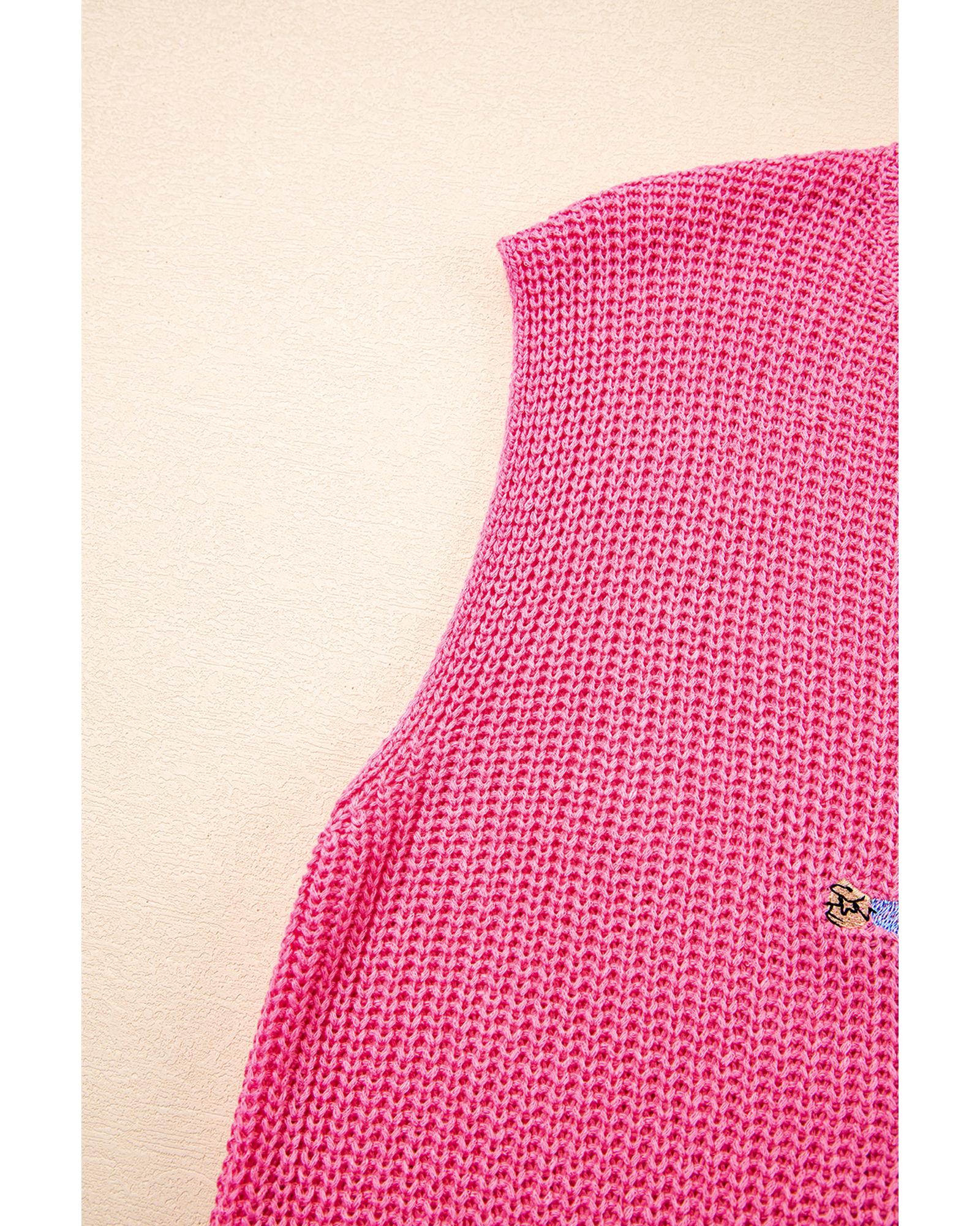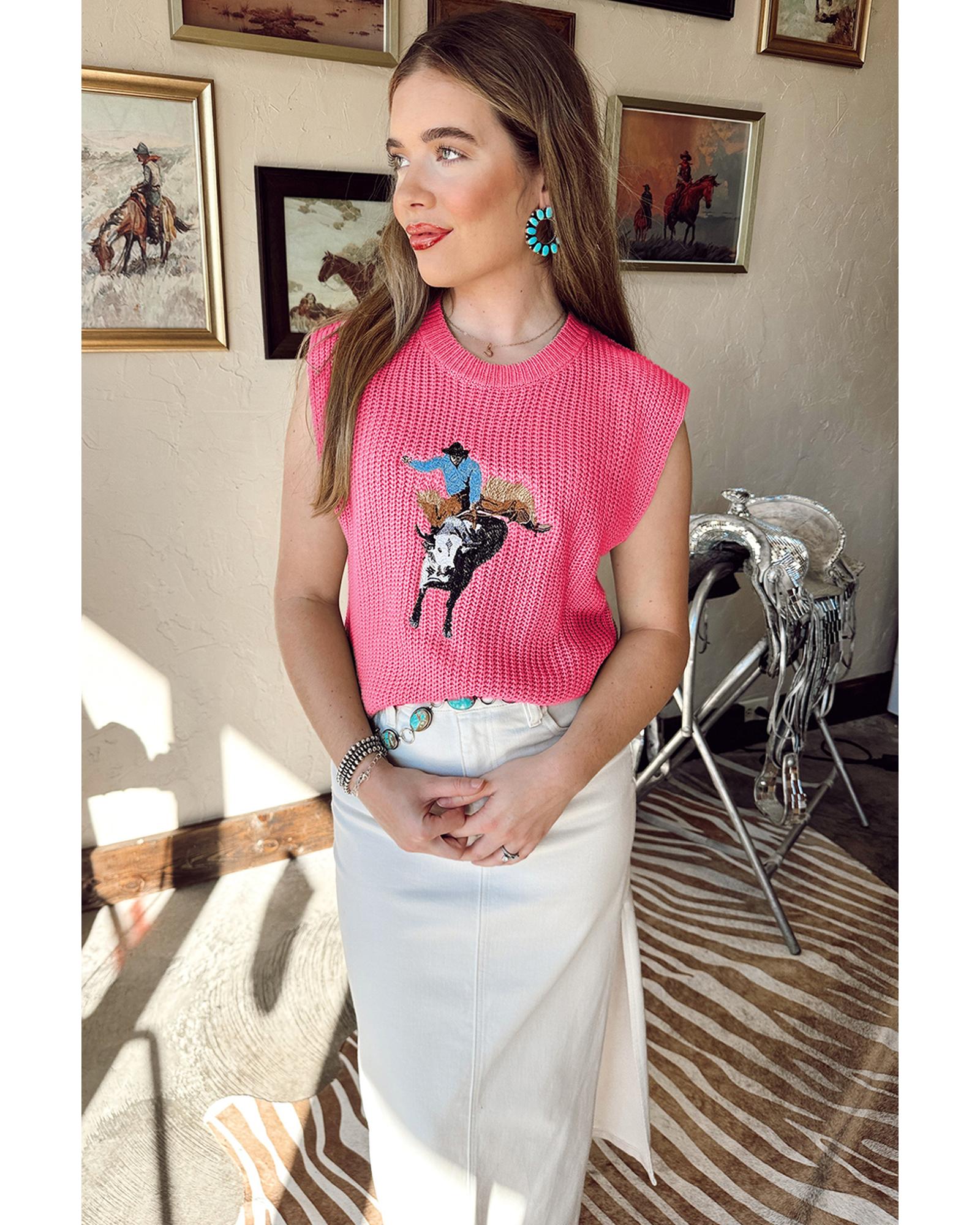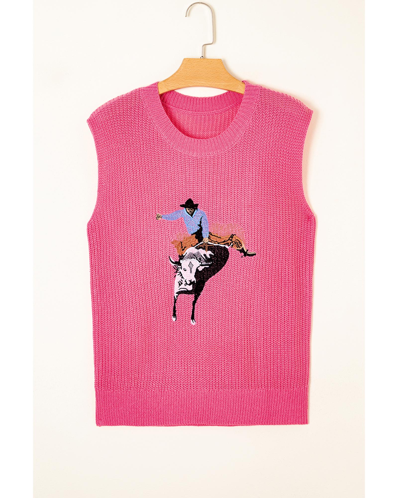 Bright Pink Western Cowboy Embroidery Round Neck Sleeveless Sweater – XL