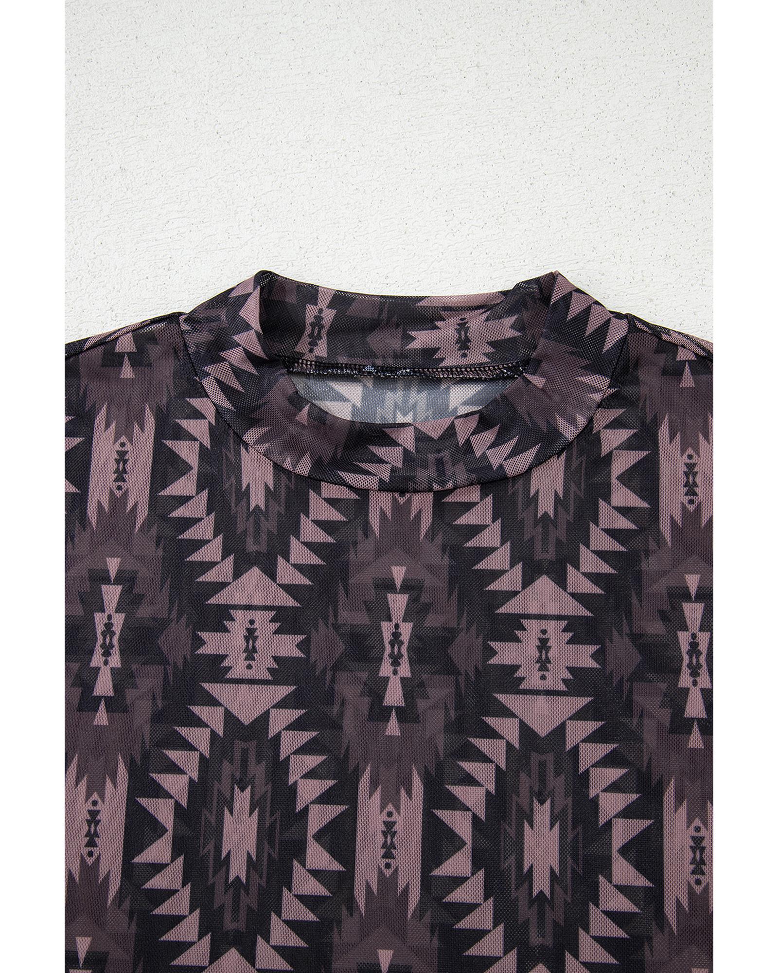 Brown Aztec Print Mock Neck Short Sleeve Mesh T Shirt – L