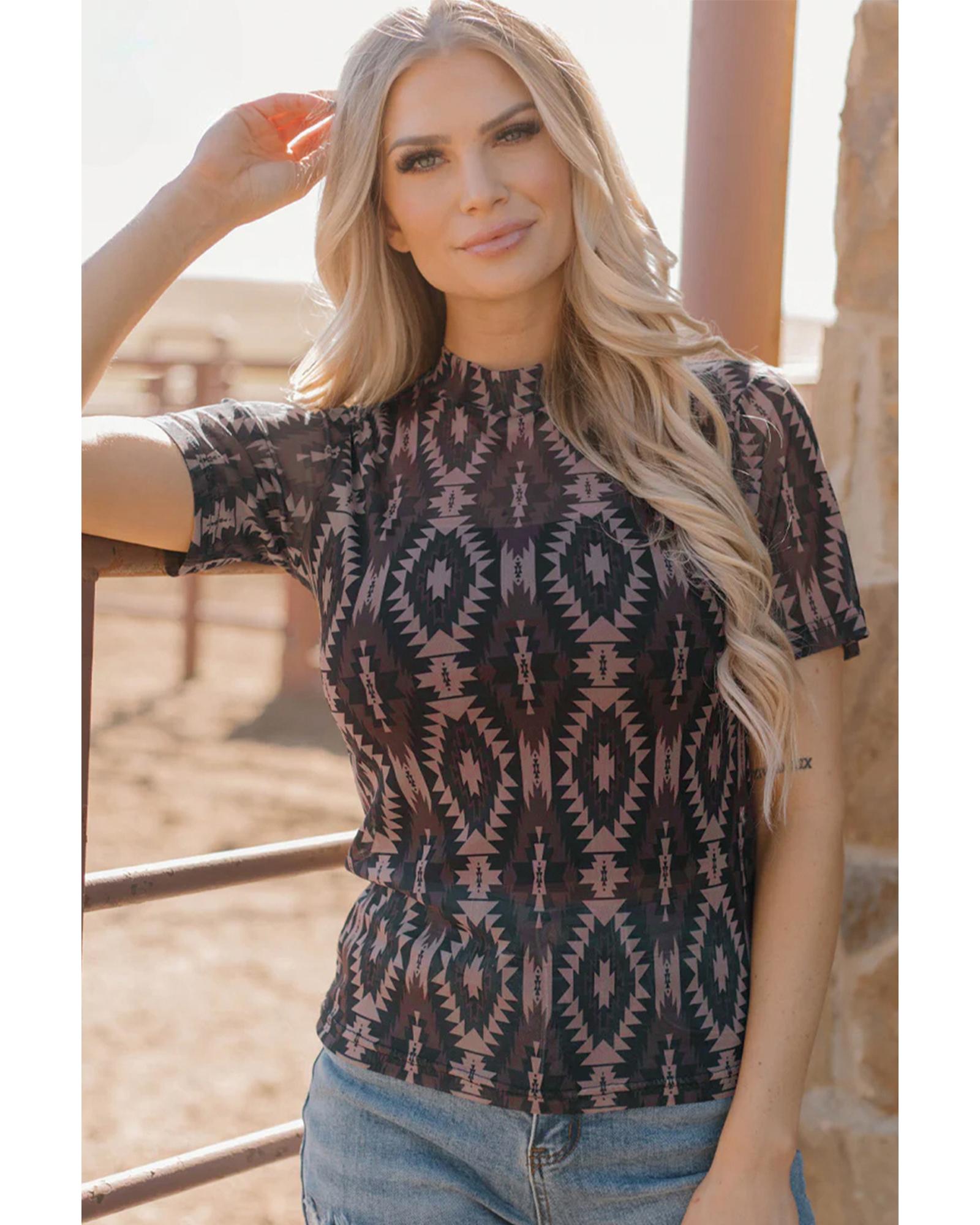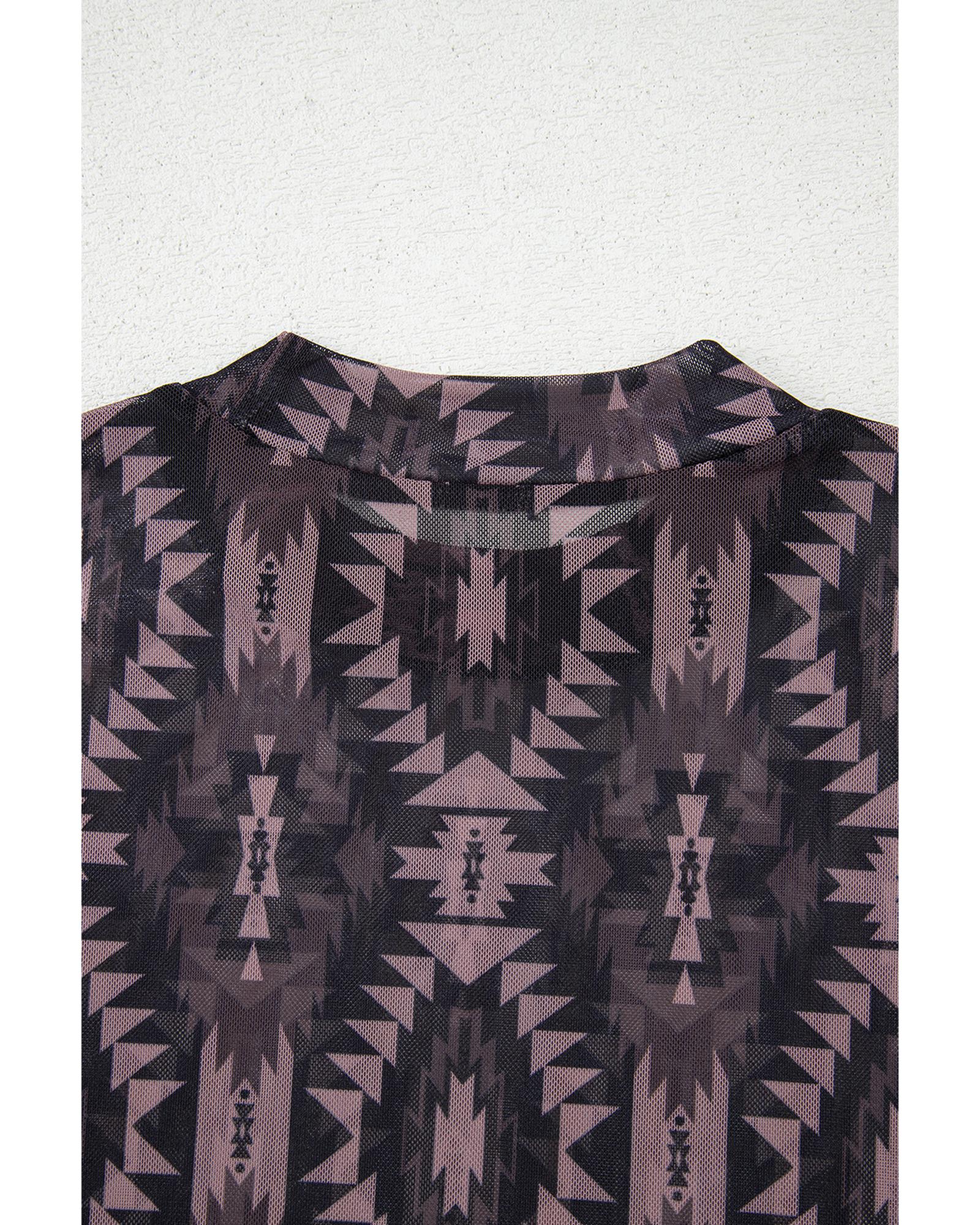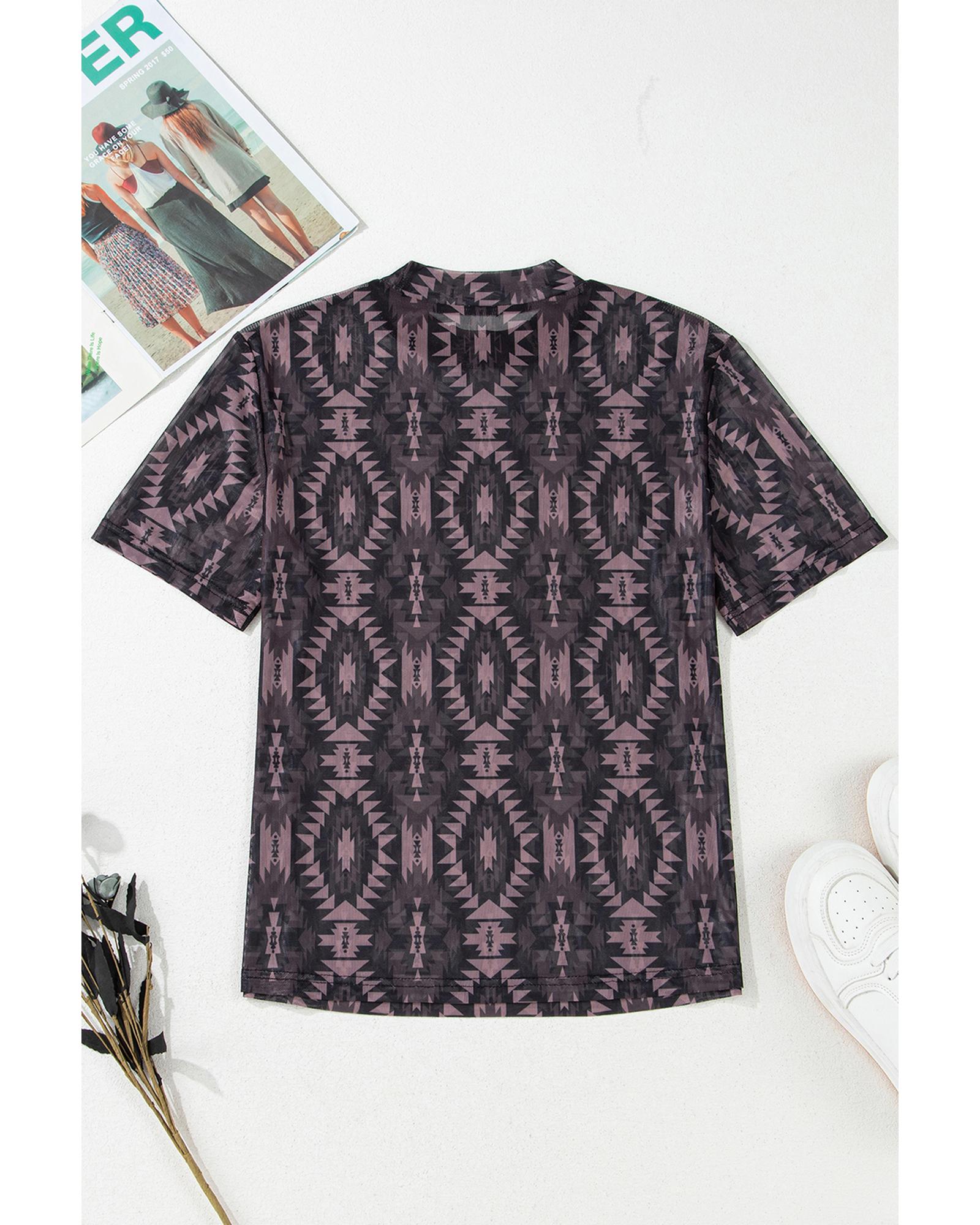 Brown Aztec Print Mock Neck Short Sleeve Mesh T Shirt – XL