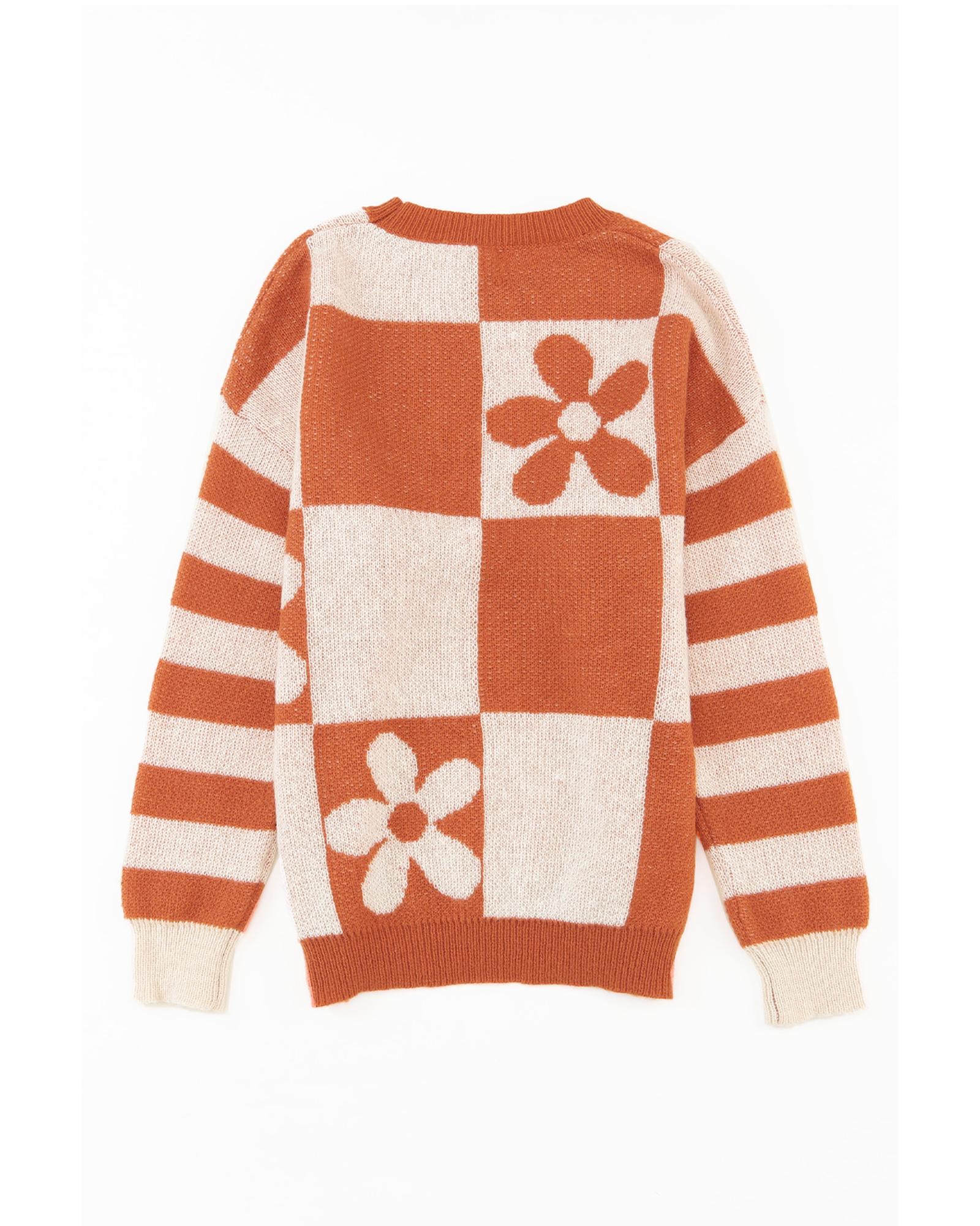 Brown Checkered Floral Print Striped Sleeve Sweater – XL