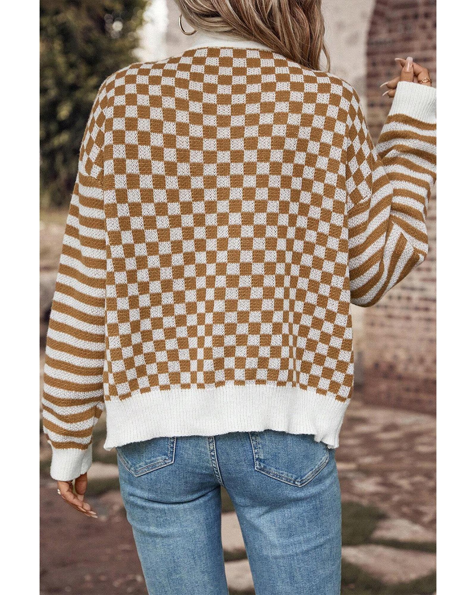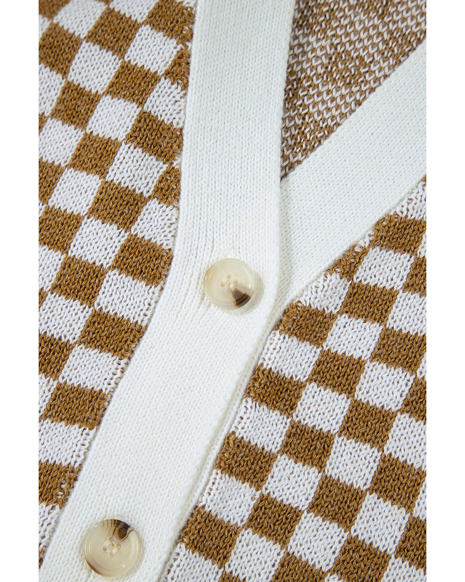 Brown Checkered Striped Patched Buttoned V Neck Cardigan – M